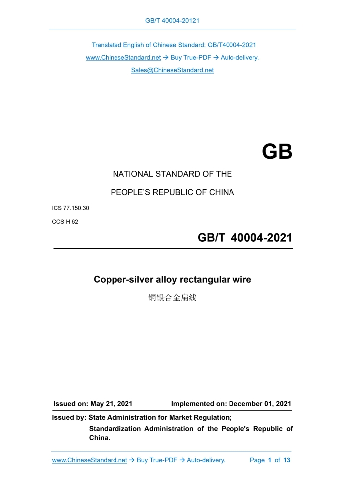 GB/T 40004-2021: Copper-silver alloy rectangular wire Delivery: 9 seconds. True-PDF full-copy in English & invoice will be downloaded + auto-delivered via email. See step-by-step procedure Status: Valid
