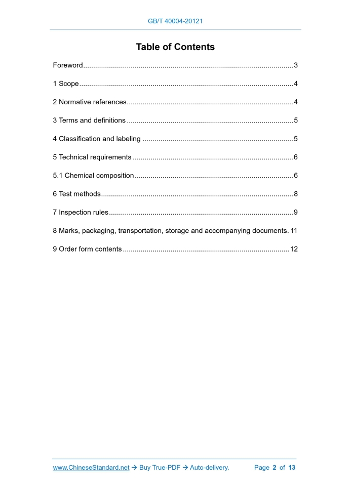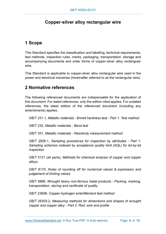Similar standardsGB/T 40004-2021: Copper-silver alloy rectangular wire---This is an excerpt. Full copy of true-PDF in English version (including equations, symbols, images, flow-chart, tables, and figures etc.), auto-downloaded/delivered in 9 seconds, can be purchased online: https://www.ChineseStandard.net/PDF.aspx/GBT40004-2021GB NATIONAL STANDARD OF THE PEOPLE’S REPUBLIC OF CHINA ICS 77.150.30 CCS H 62 GB/T 40004-2021 Copper-silver alloy rectangular wire ISSUED ON: MAY 21, 2021 IMPLEMENTED ON: DECEMBER 01, 2021 Issued by: State Administration for Market Regulation; Standardization Administration of the People's Republic of China. Table of ContentsForeword ... 3 1 Scope ... 4 2 Normative references ... 4 3 Terms and definitions ... 5 4 Classification and labeling ... 5 5 Technical requirements ... 6 5.1 Chemical composition ... 6 6 Test methods ... 8 7 Inspection rules ... 9 8 Marks, packaging, transportation, storage and accompanying documents . 11 9 Order form contents ... 12 Copper-silver alloy rectangular wire1 ScopeThis Standard specifies the classification and labelling, technical requirements, test methods, inspection rules, marks, packaging, transportation, storage and accompanying documents and order forms of copper-silver alloy rectangular wire. This Standard is applicable to copper-silver alloy rectangular wire used in the power and electrical industries (hereinafter referred to as the rectangular wire).2 Normative referencesThe following referenced documents are indispensable for the application of this document. For dated references, only the edition cited applies. For undated references, the latest edition of the referenced document (including any amendments) applies. GB/T 231.1, Metallic materials - Brinell hardness test - Part 1: Test method GB/T 232, Metallic materials - Bend test GB/T 351, Metallic materials - Resistivity measurement method GB/T 2828.1, Sampling procedures for inspection by attributea - Part 1: Sampling schemes indexed by acceptance quality limit (AQL) for lot-by-lot inspection GB/T 5121 (all parts), Methods for chemical analysis of copper and copper alloys GB/T 8170, Rules of rounding off for numerical values & expression and judgement of limiting values GB/T 8888, Wrought heavy non-ferrous metal products - Packing, marking, transportation, storing and certificate of quality GB/T 23606, Copper-hydrogen embrittlement test method GB/T 26303.2, Measuring methods for dimensions and shapes of wrought copper and copper alloy - Part 2: Rod, wire and profile The electrical properties test of the rectangular wire is carried out in accordance with the provisions of GB/T 351 or GB/T 32791. The arbitration test method is carried out in accordance with the provisions of GB/T 351. 6.5 Hydrogen embrittlement test The hydrogen embrittlement test of the rectangular wire is carried out according to GB/T 23606. 6.6 Bending test The bending test of the flat rectangular is carried out according to GB/T 232. 6.7 Surface quality The surface quality of the rectangular wire shall be inspected visually.7 Inspection rules7.1 Inspection and acceptance 7.1.1 The rectangular wire is checked and inspected by the supplier or a third party to ensure that the product quality meets the requirements of this Standard and the purchase order. 7.1.2 The purchaser can inspect and accept the received rectangular wire in accordance with the provisions of this Standard. If the inspection result is not in conformity with the provisions of this Standard and the purchase order, it shall be submitted to the supplier in written form, and the supplier and the purchaser shall negotiate and resolve it. Objections that belong to size deviation and appearance quality shall be raised within one month from the date of receipt of the product. Objections related to other properties shall be raised within three months from the date of receipt of the product. If arbitration is required, it shall be determined by both the supplier and the purchaser on the purchaser’s joint sampling or negotiation. 7.2 Batching The rectangular wire shall be submitted in batches for acceptance. Each batch shall be composed of the same designation, state and specification. The weight of each batch shall not exceed 2000kg. 7.3 Inspection items The inspection items of rectangular wire are divided into exit-factory inspection items and type inspection items, see Table 8. Type inspection shall be carried out in any of the following situations: accompanying documents 8.1 Marks, packaging, transportation, storage The marks, packaging, transportation, storage of the rectangular wire shall comply with the provisions of GB/T 8888. 8.2 Accompanying documents Each batch of products shall be accompanied by accompanying documents, which shall include supplier information, product information, reference of this Standard, date of manufacture or packaging date and shall also include: a) Product quality guarantee: ● Main performance and technical parameters of the product; ● Product characteristics (including the characteristics of manufacturing processes and raw materials); ● Responsibility for product quality; ● Quality certification of the product and the analysis and inspection results of the supplier's technical supervision department; b) Product certification: ● Inspection items and their results or inspection conclusions; ● Batch or batch number; ● Inspection date; ● Inspector's signature or seal; c) Inspection reports and finished product inspection reports during product quality control; d) Product instructions on use: correct handling, use, storage methods; e) Others.9 Order form contentsThe purchaser can list the following contents in the order form for the rectangular wire listed in this Standard according to its own needs: ......Source: Above contents are excerpted from the full-copy PDF -- translated/reviewed by: www.ChineseStandard.net / Wayne Zheng et al. Tips & Frequently Asked Questions:Question 1: How long w