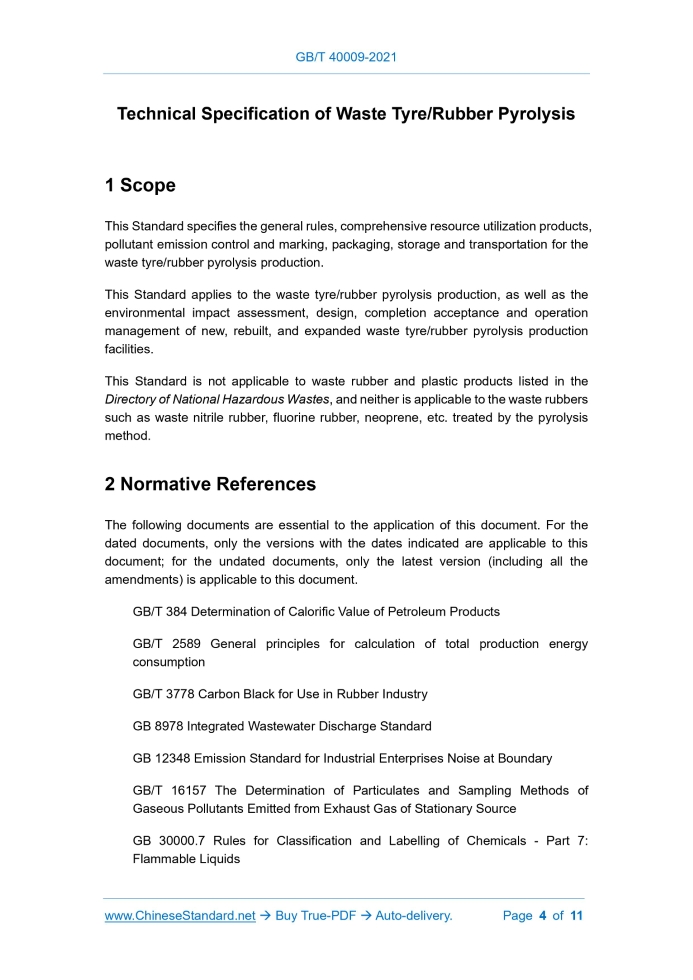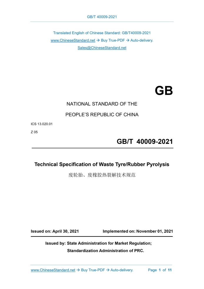 GB/T 40009-2021: Technical specification of waste tyre/rubber pyrolysis Delivery: 9 seconds. True-PDF full-copy in English & invoice will be downloaded + auto-delivered via email. See step-by-step procedure Status: Valid