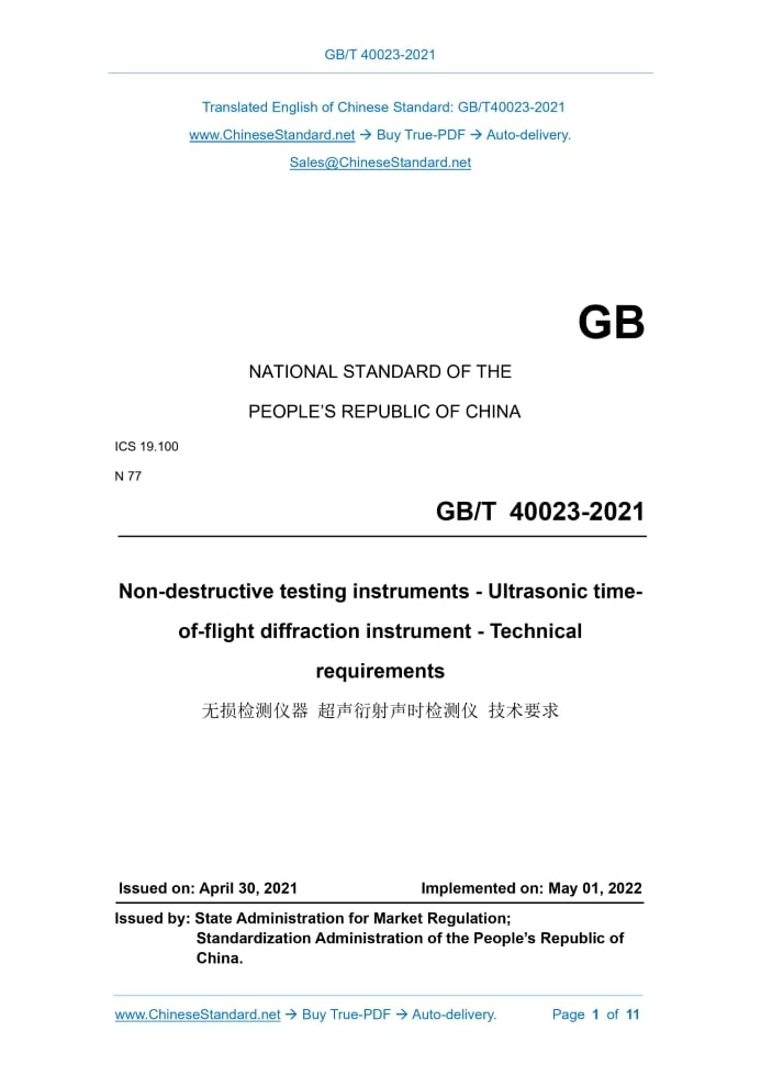 GB/T 40023-2021: Non-destructive testing instruments - Ultrasonic time-of-flight diffraction instrument - Technical requirements Delivery: 9 seconds. True-PDF full-copy in English & invoice will be downloaded + auto-delivered via email. See step-by-step procedure Status: Valid