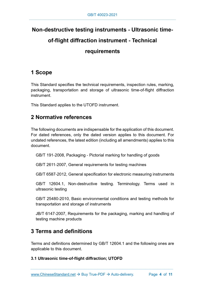 Similar standardsGB/T 40023-2021: Non-destructive testing instruments - Ultrasonic time-of-flight diffraction instrument - Technical requirements---This is an excerpt. Full copy of true-PDF in English version (including equations, symbols, images, flow-chart, tables, and figures etc.), auto-downloaded/delivered in 9 seconds, can be purchased online: https://www.ChineseStandard.net/PDF.aspx/GBT40023-2021 GB NATIONAL STANDARD OF THE PEOPLE’S REPUBLIC OF CHINA ICS 19.100 N 77 Non-destructive testing instruments - Ultrasonic time- of-flight diffraction instrument - Technical requirements ISSUED ON: APRIL 30, 2021 IMPLEMENTED ON: MAY 01, 2022 Issued by: State Administration for Market Regulation; Standardization Administration of the People’s Republic of China. Table of ContentsForeword ... 3 1 Scope ... 4 2 Normative references ... 4 3 Terms and definitions ... 4 4 Technical requirements ... 5 5 Inspection rules ... 8 6 Marking, packaging, transportation and storage ... 10 Non-destructive testing instruments - Ultrasonic time- of-flight diffraction instrument - Technical requirements1 ScopeThis Standard specifies the technical requirements, inspection rules, marking, packaging, transportation and storage of ultrasonic time-of-flight diffraction instrument. This Standard applies to the UTOFD instrument.2 Normative referencesThe following documents are indispensable for the application of this document. For dated references, only the dated version applies to this document. For undated references, the latest edition (including all amendments) applies to this document. GB/T 191-2008, Packaging - Pictorial marking for handling of goods GB/T 2611-2007, General requirements for testing machines GB/T 6587-2012, General specification for electronic measuring instruments GB/T 12604.1, Non-destructive testing. Terminology. Terms used in ultrasonic testing GB/T 25480-2010, Basic environmental conditions and testing methods for transportation and storage of instruments JB/T 6147-2007, Requirements for the packaging, marking and handling of testing machine products3 Terms and definitionsTerms and definitions determined by GB/T 12604.1 and the following ones are applicable to this document. 3.1 Ultrasonic time-of-flight diffraction; UTOFD The frequency bandwidth (-3 dB) shall cover the bandwidth from half the nominal lowest operating frequency to twice the nominal highest operating frequency. Example: When the nominal operating frequency range is 1 MHz ~ 7.5 MHz, the bandwidth of the instrument is 0.5 MHz ~ 15 MHz. 4.3 Dynamic range The dynamic range shall not be less than 100 dB. 4.4 Time base linearity error The time base linearity error shall not be greater than ±0.5%. 4.5 Vertical linearity error The vertical linearity error shall not be greater than ±2% of the full-screen signal. 4.6 Equivalent input noise The equivalent input noise shall be less than 100×10-9 V/Hz1/2. 4.7 Transmitted pulse voltage amplitude The excitation waveform of the transmitted pulse mainly includes sharp pulses, unipolar square wave pulses and bipolar square wave pulses; the voltage amplitude shall be adjustable; the peak-to-peak value shall not be less than 200 V. 4.8 Transmitted pulse rise time The transmitted pulse rise time is the time for the pulse front amplitude to rise from 10% to 90% of the pulse peak value, which shall be less than 0.25 times the period time of the nominal frequency of the highest possible probe. 4.9 Transmitted pulse duration (pulse width) The minimum pulse width shall be greater than or equal to half the cycle time of the nominal maximum operating frequency; the maximum pulse width shall be less than or equal to half the cycle time of the nominal minimum operating frequency. The pulse width adjustment step length shall be less than 10% of the target pulse width. 4.10 Transmitted pulse recoil amplitude The transmitted pulse recoil amplitude shall be less than 4% of the peak-to- peak transmitted pulse voltage. The power supply mode of the instrument shall be DC battery power supply or AC adapter power supply. 4.21 Appearance quality The appearance quality requirements of the instrument shall meet the relevant regulations in Chapter 10 of GB/T 2611-2007. 4.22 Temperature resistance The temperature resistance performance requirements of the instrument shall meet the relevant regulations in Chapter 3 of GB/T 25480-2010. 4.23 Humidity resistance The humidity resistance performance requirements of the instrument shall meet the relevant regulations in Chapter 3 of GB/T 25480-2010. 4.24 Anti-vibration The anti-vibration performance of the instrument shall meet the requirements for group-II instruments that are specified in 4.7 of GB/T 6587-2012. 4.25 Shock resistance The shock resistance of the instrument shall meet the requirements for group- II instruments that are specified in 4.7 of GB/T 6587-2012.5 Inspection rules5.1 Delivery inspection 5.1.1 All the delivered products shall be inspected by the manufacturer's quality inspection department for the delivery inspection items, and issued with the product qualification certificate, before leaving the factory. 5.1.2 The delivery inspection shall be carried out in accordance with the items that are specified in Table 1. 5.2 Type inspection 5.2.1 Type inspection shall be carried out in any of the following situations: a) Type identification of new products or old products that are transferred to the factory; b) After formal production, if there are major changes in structure, materials and processes, which may affect product performance; 5.3.1 For the delivery inspection, it is qualified if all inspection items of each detector meet the requirements. 5.3.2 For the type inspection, when the batch size is not more than 50 units, take 2 samples; if 1 sample is unqualified after the inspection, judge the batch of products to be unqualified. When the batch size is greater than 50 units, take 5 samples; if there are 2 or more unqualified products in the sampl