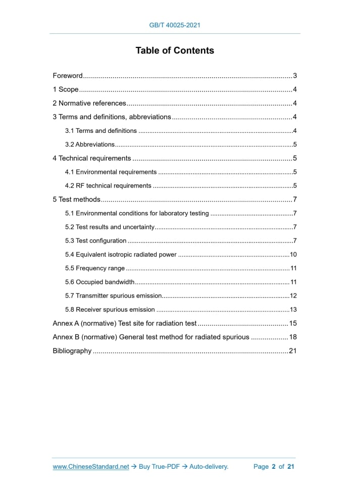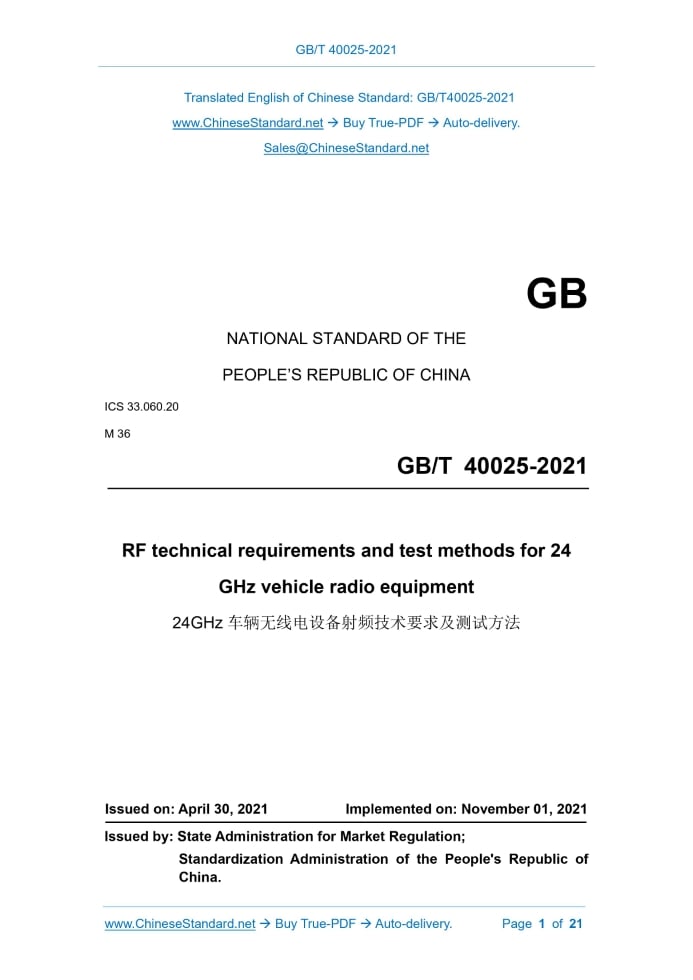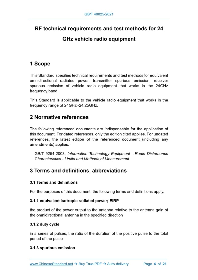 Similar standardsGB/T 40025-2021: RF technical requirements and test methods for 24 GHz vehicle radio equipment---This is an excerpt. Full copy of true-PDF in English version (including equations, symbols, images, flow-chart, tables, and figures etc.), auto-downloaded/delivered in 9 seconds, can be purchased online: https://www.ChineseStandard.net/PDF.aspx/GBT40025-2021GB NATIONAL STANDARD OF THE PEOPLE’S REPUBLIC OF CHINA ICS 33.060.20 M 36 RF technical requirements and test methods for 24 GHz vehicle radio equipment ISSUED ON: APRIL 30, 2021 IMPLEMENTED ON: NOVEMBER 01, 2021 Issued by: State Administration for Market Regulation; Standardization Administration of the People's Republic of China. Table of ContentsForeword ... 3 1 Scope ... 4 2 Normative references ... 4 3 Terms and definitions, abbreviations ... 4 3.1 Terms and definitions ... 4 3.2 Abbreviations ... 5 4 Technical requirements ... 5 4.1 Environmental requirements ... 5 4.2 RF technical requirements ... 5 5 Test methods ... 7 5.1 Environmental conditions for laboratory testing ... 7 5.2 Test results and uncertainty ... 7 5.3 Test configuration ... 7 5.4 Equivalent isotropic radiated power ... 10 5.5 Frequency range ... 11 5.6 Occupied bandwidth ... 11 5.7 Transmitter spurious emission ... 12 5.8 Receiver spurious emission ... 13 Annex A (normative) Test site for radiation test ... 15 Annex B (normative) General test method for radiated spurious ... 18 Bibliography ... 21 RF technical requirements and test methods for 24 GHz vehicle radio equipment1 ScopeThis Standard specifies technical requirements and test methods for equivalent omnidirectional radiated power, transmitter spurious emission, receiver spurious emission of vehicle radio equipment that works in the 24GHz frequency band. This Standard is applicable to the vehicle radio equipment that works in the frequency range of 24GHz~24.25GHz.2 Normative referencesThe following referenced documents are indispensable for the application of this document. For dated references, only the edition cited applies. For undated references, the latest edition of the referenced document (including any amendments) applies. GB/T 9254-2008, Information Technology Equipment - Radio Disturbance Characteristics - Limits and Methods of Measurement3 Terms and definitions, abbreviations3.1 Terms and definitions For the purposes of this document, the following terms and definitions apply. 3.1.1 equivalent isotropic radiated power; EIRP the product of the power output to the antenna relative to the antenna gain of the omnidirectional antenna in the specified direction 3.1.2 duty cycle in a series of pulses, the ratio of the duration of the positive pulse to the total period of the pulse 3.1.3 spurious emission unwanted emission of equipment in spurious domain 3.2 Abbreviations The abbreviations apply to this document. EIRP: Equivalent Isotropic Radiated Power RBW: Resolution Band width RMS: Root Mean Square VBW: Video Band width4 Technical requirements4.1 Environmental requirements The equipment manufacturer shall declare in advance the environmental conditions for the equipment to work. The equipment shall work in its nominal working environment. 4.2 RF technical requirements 4.2.1 Equivalent isotropic radiated power When the transmitter is working at the maximum power level, the equivalent omnidirectional radiation power limit of 24GHz~24.25GHz is 13dBm. 4.2.2 Frequency range In the case of the maximum power level of the transmitter, the frequency range limit is fL≥24GHz, fH≤26.65GHz. 4.2.3 Occupied bandwidth 4.2.3.1 Overview The occupied bandwidth of vehicle radio equipment operating at 24GHz~24.25GHz is the signal bandwidth of 99% of the energy of the transmitted signal. 4.2.3.2 Limits The upper and lower limits of the occupied bandwidth of the vehicle radio equipment operating at 24GHz~24.25GHz shall not exceed the specified frequency range. Where, P - Equivalent isotropic radiated power, in decibel milliwatts (dBm); A - Measured output power, in decibel milliwatts (dBm); x - Transmitter output signal duty cycle. 5.5 Frequency range 5.5.1 Test configuration The frequency range shall be measured using the test site described in 5.3.2 and the method in 5.3.3. 5.5.2 Test steps The test steps are as follows: a) The transmitter shall be adjusted to the maximum transmission mode; b) Use a spectrum analyzer to read the start frequency and cutoff frequency at the upper and lower limits of the signal envelope. Radiation power is not more than -80dBm/Hz (EIRP). Record it. Its value shall not exceed the limit requirement of 4.2.2. 5.6 Occupied bandwidth 5.6.1 Test configuration The occupied bandwidth shall be measured using the test site described in 5.3.2 and the method in 5.3.3. 5.6.2 Test steps The test steps are as follows: a) The transmitter is adjusted to the maximum transmission mode; b) Set the center frequency of the spectrum analyzer = the center frequency of the measured channel. Set RBW=1 MHz, VBW=1 MHz. The sweep width is 2 times the nominal channel bandwidth. Detector RMS, tracking method remains the maximum value; c) The signal bandwidth of the vehicle radio equipment operating at 24GHz~24.25GHz records the signal bandwidth of 99% energy of When testing spurious emissions greater than 40GHz, the test site described in 5.3.2 and the method in 5.3.3 shall be used for measurement. 5.7.3.2 Test steps The test steps are as follows: a) In the case of equipment support, test and record the spurious of the highest frequency band. Set the spectrum analyzer RBW=1 MHz, VBW=1MHz, detector RMS, tracking mode remain the maximum value; b) Any emission found in the scan that is in the 6dB range below the limit shall be recorded. Analyze the results to exclude the influence of the mixer image. 5.8 Receiver spurious emission 5.8.1 Configuration requirements If the receiver is in the form of an antenna array, where feasible, only one transmit link (antenna) shall be reserved while other transmit li