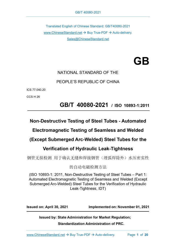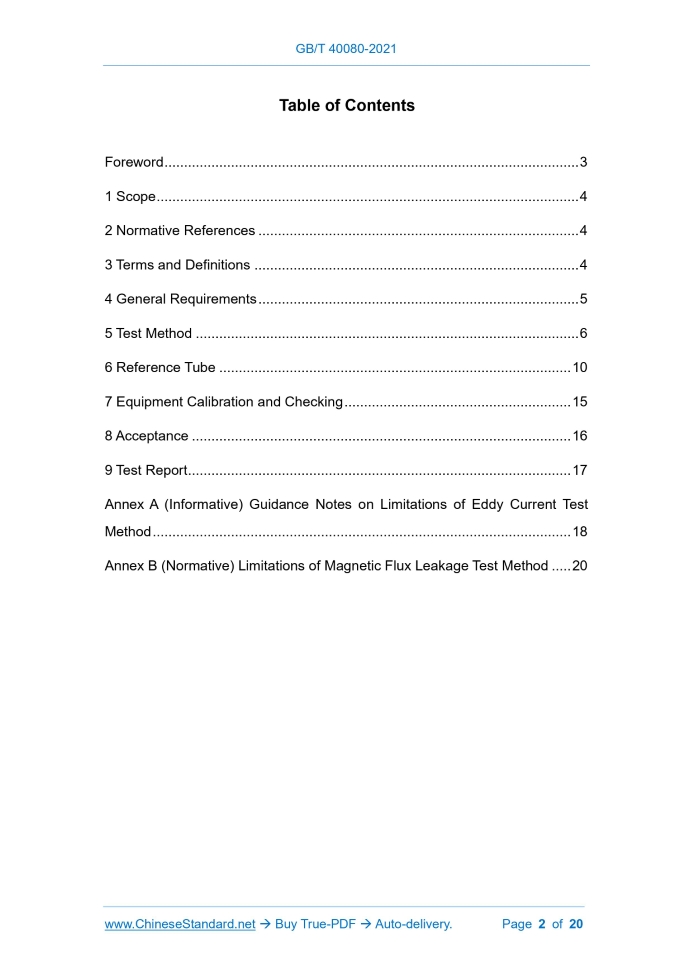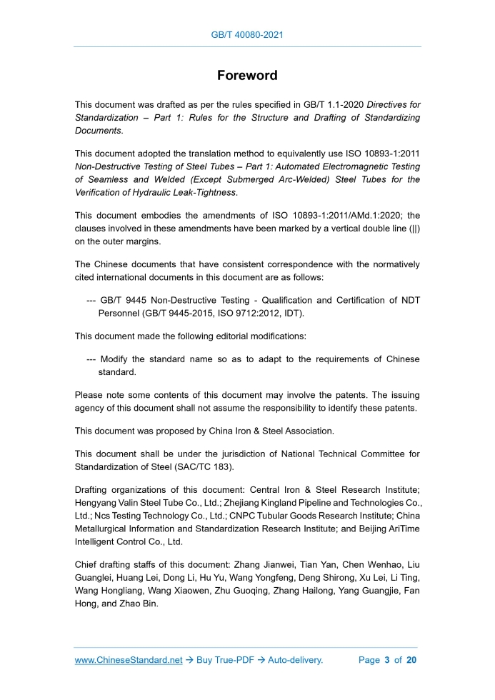 Similar standardsGB/T 40080-2021: Nondestructive testing of steel tubes - Automated electromagnetic testing of seamless and welded (except submerged arc-welded) steel tubes for the verification of hydraulic leak tightness---This is an excerpt. Full copy of true-PDF in English version (including equations, symbols, images, flow-chart, tables, and figures etc.), auto-downloaded/delivered in 9 seconds, can be purchased online: https://www.ChineseStandard.net/PDF.aspx/GBT40080-2021 GB NATIONAL STANDARD OF THE PEOPLE’S REPUBLIC OF CHINA ICS 77.040.20 CCS H 26 GB/T 40080-2021 / ISO 10893-1:2011 Non-Destructive Testing of Steel Tubes - Automated Electromagnetic Testing of Seamless and Welded (Except Submerged Arc-Welded) Steel Tubes for the Verification of Hydraulic Leak-Tightness (ISO 10893-1: 2011, Non-Destructive Testing of Steel Tubes – Part 1: Automated Electromagnetic Testing of Seamless and Welded (Except Submerged Arc-Welded) Steel Tubes for the Verification of Hydraulic Leak-Tightness, IDT) ISSUED ON: APRIL 30, 2021 IMPLEMENTED ON: NOVEMBER 01, 2021 Issued by: State Administration for Market Regulation; Standardization Administration of PRC. Table of ContentsForeword ... 3 1 Scope ... 4 2 Normative References ... 4 3 Terms and Definitions ... 4 4 General Requirements ... 5 5 Test Method ... 6 6 Reference Tube ... 10 7 Equipment Calibration and Checking ... 15 8 Acceptance ... 16 9 Test Report ... 17 Annex A (Informative) Guidance Notes on Limitations of Eddy Current Test Method ... 18 Annex B (Normative) Limitations of Magnetic Flux Leakage Test Method ... 20ForewordThis document was drafted as per the rules specified in GB/T 1.1-2020 Directives for Standardization – Part 1: Rules for the Structure and Drafting of Standardizing Documents. This document adopted the translation method to equivalently use ISO 10893-1:2011 Non-Destructive Testing of Steel Tubes – Part 1: Automated Electromagnetic Testing of Seamless and Welded (Except Submerged Arc-Welded) Steel Tubes for the Verification of Hydraulic Leak-Tightness. This document embodies the amendments of ISO 10893-1:2011/AMd.1:2020; the clauses involved in these amendments have been marked by a vertical double line (||) on the outer margins. The Chinese documents that have consistent correspondence with the normatively cited international documents in this document are as follows: --- GB/T 9445 Non-Destructive Testing - Qualification and Certification of NDT Personnel (GB/T 9445-2015, ISO 9712:2012, IDT). This document made the following editorial modifications: --- Modify the standard name so as to adapt to the requirements of Chinese standard. Please note some contents of this document may involve the patents. The issuing agency of this document shall not assume the responsibility to identify these patents. This document was proposed by China Iron & Steel Association. This document shall be under the jurisdiction of National Technical Committee for Standardization of Steel (SAC/TC 183). Drafting organizations of this document: Central Iron & Steel Research Institute; Hengyang Valin Steel Tube Co., Ltd.; Zhejiang Kingland Pipeline and Technologies Co., Ltd.; Ncs Testing Technology Co., Ltd.; CNPC Tubular Goods Research Institute; China Metallurgical Information and Standardization Research Institute; and Beijing AriTime Intelligent Control Co., Ltd. Chief drafting staffs of this document: Zhang Jianwei, Tian Yan, Chen Wenhao, Liu Guanglei, Huang Lei, Dong Li, Hu Yu, Wang Yongfeng, Deng Shirong, Xu Lei, Li Ting, Wang Hongliang, Wang Xiaowen, Zhu Guoqing, Zhang Hailong, Yang Guangjie, Fan Hong, and Zhao Bin. Non-Destructive Testing of Steel Tubes - Automated Electromagnetic Testing of Seamless and Welded (Except Submerged Arc-Welded) Steel Tubes for the Verification of Hydraulic Leak-Tightness1 ScopeThis document specifies the automated electromagnetic testing of seamless and welded steel tubes, with the exception of submerged arc-welded (SAW) tubes, for verification of hydraulic leak-tightness. The eddy current testing method is applicable to test the steel tubes with outer diameter greater than or equal to 4mm; while the magnetic flux leakage testing method is applicable to test the steel tube with outer diameter greater than 10mm. This document may also be applicable to the testing of hollow sections. NOTE: Electromagnetic testing using magnetic flux leakage method is not applicable to austenitic stainless-steel tubes.2 Normative ReferencesThe following documents are essential to the application of this document. For the dated documents, only the versions with the dates indicated are applicable to this document; for the undated documents, only the latest version (including all the amendments) is applicable to this document. ISO 9712 Non-Destructive Testing – Qualification and Certification of NDT Personnel ISO 11484 Steel Products – Employer’s Qualification System for Non-Destructive Testing (NDT) Personnel3 Terms and DefinitionsFor the purposes of this document, the terms and definitions given in ISO 11484 and the following apply. ......Source: Above contents are excerpted from the full-copy PDF -- translated/reviewed by: www.ChineseStandard.net / Wayne Zheng et al. Tips & Frequently Asked Questions:Question 1: How long will the true-PDF of English version of GB/T 40080-2021 be delivered?Answer: The full copy PDF of English version of GB/T 40080-2021 can be downloaded in 9 seconds, and it will also be emailed to you in 9 seconds (double mechanisms to ensure the delivery reliably), with PDF-invoice.Question 2: Can I share the purchased PDF of GB/T 40080-2021_English with my colleagues?Answer: Yes. The purchased PDF of GB/T 40080-2021_English will be deemed to be sold to your employer/organization who actually paid for it, including your colleagues and your employer's intranet.Question 3: Does the price include tax/VAT?Answer: Yes. Our tax invoice, downloaded/delivered in 9 seconds, includes all tax/VAT and complies with 