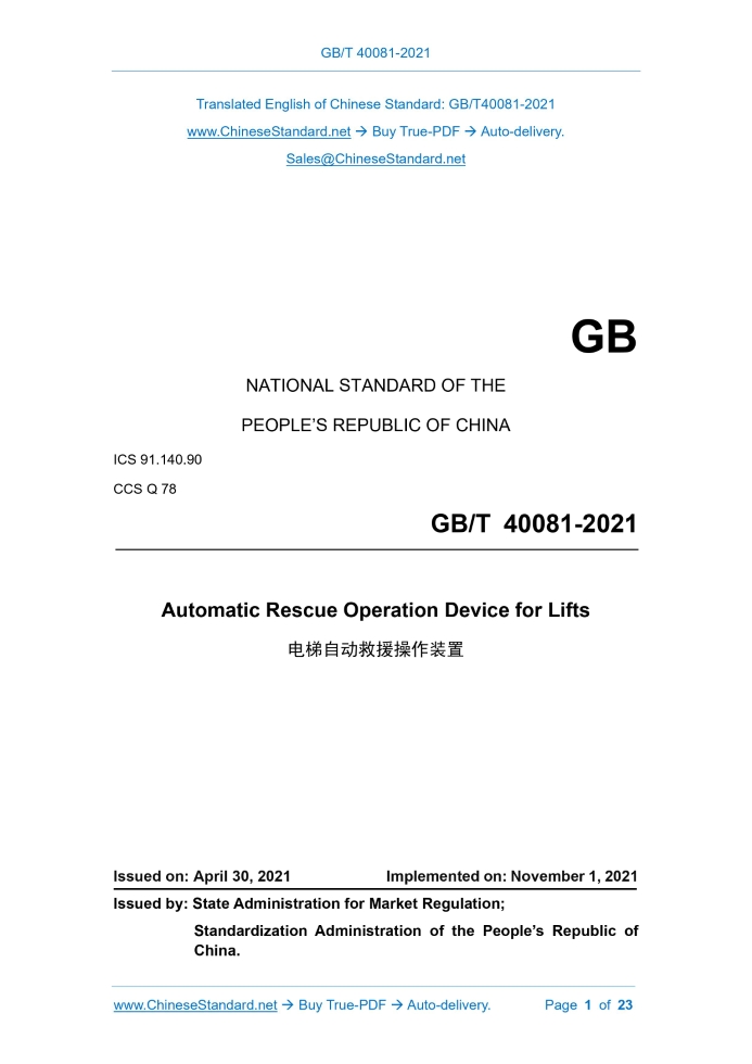 GB/T 40081-2021: Automatic rescue operation device for lifts Delivery: 9 seconds. True-PDF full-copy in English & invoice will be downloaded + auto-delivered via email. See step-by-step procedure Status: Valid