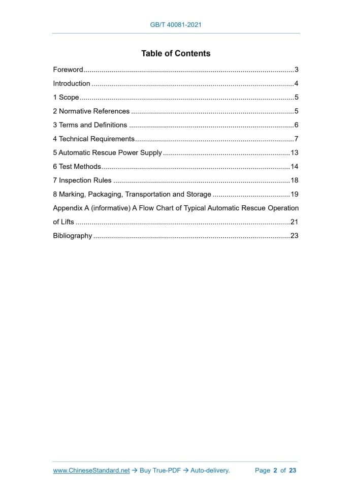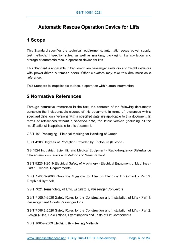 Similar standardsGB/T 40081-2021: Automatic rescue operation device for lifts---This is an excerpt. Full copy of true-PDF in English version (including equations, symbols, images, flow-chart, tables, and figures etc.), auto-downloaded/delivered in 9 seconds, can be purchased online: https://www.ChineseStandard.net/PDF.aspx/GBT40081-2021GB NATIONAL STANDARD OF THE PEOPLE’S REPUBLIC OF CHINA ICS 91.140.90 CCS Q 78 Automatic Rescue Operation Device for Lifts ISSUED ON: APRIL 30, 2021 IMPLEMENTED ON: NOVEMBER 1, 2021 Issued by: State Administration for Market Regulation; Standardization Administration of the People’s Republic of China. Table of ContentsForeword ... 3 Introduction ... 4 1 Scope ... 5 2 Normative References ... 5 3 Terms and Definitions ... 6 4 Technical Requirements ... 7 5 Automatic Rescue Power Supply ... 13 6 Test Methods ... 14 7 Inspection Rules ... 18 8 Marking, Packaging, Transportation and Storage ... 19 Appendix A (informative) A Flow Chart of Typical Automatic Rescue Operation of Lifts ... 21 Bibliography ... 23 Automatic Rescue Operation Device for Lifts1 ScopeThis Standard specifies the technical requirements, automatic rescue power supply, test methods, inspection rules, as well as marking, packaging, transportation and storage of automatic rescue operation device for lifts. This Standard is applicable to traction-driven passenger elevators and freight elevators with power-driven automatic doors. Other elevators may take this document as a reference. This Standard is inapplicable to rescue operation with human intervention.2 Normative ReferencesThrough normative references in the text, the contents of the following documents constitute the indispensable clauses of this document. In terms of references with a specified date, only versions with a specified date are applicable to this document. In terms of references without a specified date, the latest version (including all the modifications) is applicable to this document. GB/T 191 Packaging - Pictorial Marking for Handling of Goods GB/T 4208 Degrees of Protection Provided by Enclosure (IP code) GB 4824 Industrial, Scientific and Medical Equipment - Radio-frequency Disturbance Characteristics - Limits and Methods of Measurement GB/T 5226.1-2019 Electrical Safety of Machinery - Electrical Equipment of Machines - Part 1: General Requirements GB/T 5465.2-2008 Graphical Symbols for Use on Electrical Equipment - Part 2: Graphical Symbols GB/T 7024 Terminology of Lifts, Escalators, Passenger Conveyors GB/T 7588.1-2020 Safety Rules for the Construction and Installation of Lifts - Part 1: Passenger and Goods Passenger Lifts GB/T 7588.2-2020 Safety Rules for the Construction and Installation of Lifts - Part 2: Design Rules, Calculations, Examinations and Tests of Lift Components GB/T 10059-2009 Electric Lifts - Testing Methods certain time, and then, closing the car door and landing door in case of a failure or interruption of the power supply of the lifts. 3.2 Automatic Rescue Operation Device for Lifts Automatic rescue operation device for lifts refers to the device that executes the automatic rescue operation for lifts. 3.3 Automatic Rescue Power Supply Automatic rescue power supply refers to the power supply provided by the electric energy storage element or the combination of elements (for example, battery) to the electric energy required for the automatic rescue operation. 3.4 Power Supply Failure Power supply failure refers to the failure that causes the lifts to stop unexpectedly due to the phase loss or abnormal voltage of the power supply.4 Technical Requirements4.1 General Rules 4.1.1 When a lift is equipped with an automatic rescue operation device, the device shall be a part of the lift control system, and its failure shall not affect the operation safety of the lift. The automatic rescue operation of the lift shall not invalidate any electrical safety device of the lift. 4.1.2 In addition to the requirements of this document, lifts used under special circumstances (such as: lifts for the handicapped, and under fire conditions, potential explosive environments, extreme climatic conditions or earthquake conditions, etc.) shall also satisfy the relevant additional requirements. 4.2 Conditions of Use 4.2.1 Altitude The altitude of the installation location shall not exceed 1,000 m. When the altitude exceeds 1,000 m, the selection of low-voltage electrical appliances shall be corrected in accordance with the requirements of GB/T 20645; the selection of automatic rescue power supply shall be accordingly corrected in accordance with its type. 4.2.2 Ambient temperature a) The enclosure shall have a stable and durable protective function, and shall be able to withstand the stress that might be generated during normal use, transportation and storage; b) When being installed outside the lift well, it shall satisfy the stipulations of 5.2.6.5.1 in GB/T 7588.1-2020; c) The electrical and mechanical parts shall be easy to install, disassemble, maintain and operate. 4.4 Electrical Equipment and Its Connection 4.4.1 Electromagnetic compatibility The electromagnetic compatibility of the automatic rescue operation device shall comply with the stipulations of GB/T 24807 and GB/T 24808. 4.4.2 Protection against electric shock 4.4.2.1 General rules The protective measures shall comply with the stipulations of GB/T 16895.21-2011. The enclosure of the automatic rescue operation device shall set up a warning sign with the graphical symbol 5036 in GB/T 5465.2-2008. The warning sign shall be clearly visible on the door or cover of the enclosure. 4.4.2.2 Basic protection (protection against direct contact) In addition to the requirements of 4.4.2.1, it shall also satisfy the requirements of 5.10.1.2.2 in GB/T 7588.1-2020. 4.4.2.3 Protection against residual voltage It shall comply with the stipulations of 6.2.4 in GB/T 5226.1-2019. 4.4.2.4 Additional protection It shall comply with the stipulations of 5.10.1.2.3 in GB/T 7588.1-202