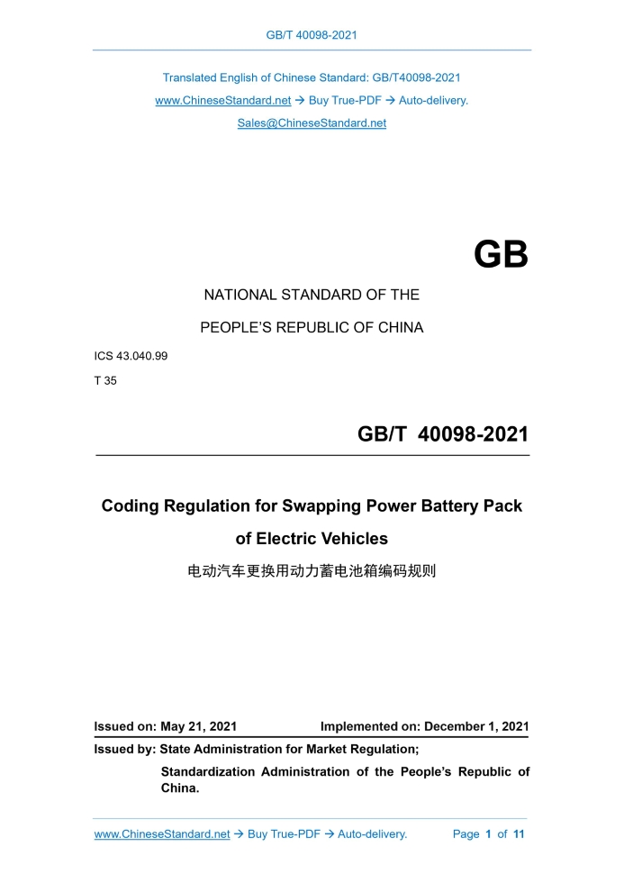 GB/T 40098-2021: Coding regulation for swapping power battery pack of electric vehicles Delivery: 9 seconds. True-PDF full-copy in English & invoice will be downloaded + auto-delivered via email. See step-by-step procedure Status: Valid