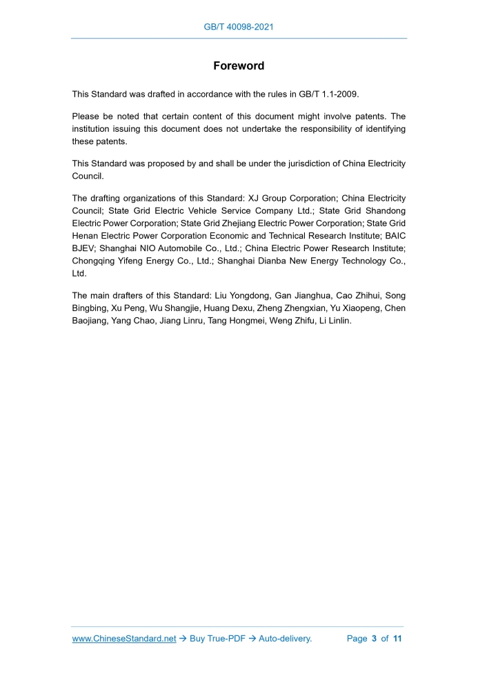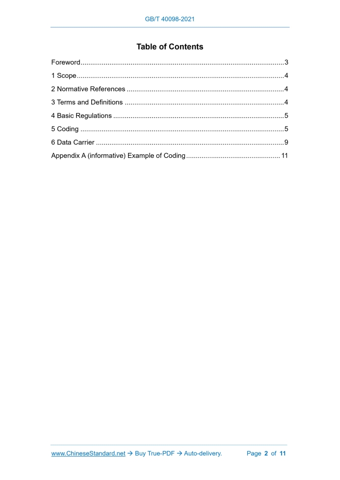 Similar standardsGB/T 40098-2021: Coding regulation for swapping power battery pack of electric vehicles---This is an excerpt. Full copy of true-PDF in English version (including equations, symbols, images, flow-chart, tables, and figures etc.), auto-downloaded/delivered in 9 seconds, can be purchased online: https://www.ChineseStandard.net/PDF.aspx/GBT40098-2021GB NATIONAL STANDARD OF THE PEOPLE’S REPUBLIC OF CHINA ICS 43.040.99 T 35 Coding Regulation for Swapping Power Battery Pack of Electric Vehicles ISSUED ON: MAY 21, 2021 IMPLEMENTED ON: DECEMBER 1, 2021 Issued by: State Administration for Market Regulation; Standardization Administration of the People’s Republic of China. Table of ContentsForeword ... 3 1 Scope ... 4 2 Normative References ... 4 3 Terms and Definitions ... 4 4 Basic Regulations ... 5 5 Coding ... 5 6 Data Carrier ... 9 Appendix A (informative) Example of Coding ... 11ForewordThis Standard was drafted in accordance with the rules in GB/T 1.1-2009. Please be noted that certain content of this document might involve patents. The institution issuing this document does not undertake the responsibility of identifying these patents. This Standard was proposed by and shall be under the jurisdiction of China Electricity Council. The drafting organizations of this Standard: XJ Group Corporation; China Electricity Council; State Grid Electric Vehicle Service Company Ltd.; State Grid Shandong Electric Power Corporation; State Grid Zhejiang Electric Power Corporation; State Grid Henan Electric Power Corporation Economic and Technical Research Institute; BAIC BJEV; Shanghai NIO Automobile Co., Ltd.; China Electric Power Research Institute; Chongqing Yifeng Energy Co., Ltd.; Shanghai Dianba New Energy Technology Co., Ltd. The main drafters of this Standard: Liu Yongdong, Gan Jianghua, Cao Zhihui, Song Bingbing, Xu Peng, Wu Shangjie, Huang Dexu, Zheng Zhengxian, Yu Xiaopeng, Chen Baojiang, Yang Chao, Jiang Linru, Tang Hongmei, Weng Zhifu, Li Linlin. Coding Regulation for Swapping Power Battery Pack of Electric Vehicles1 ScopeThis Standard specifies the basic regulations, coding structure and data carrier for the uniform coding of swapping power battery pack of electric vehicles (hereinafter referred to as battery pack). This Standard is applicable to the use, maintenance, management and traceability of battery packs adopting the battery swapping mode.2 Normative ReferencesThe following documents are indispensable to the application of this document. In terms of references with a specified date, only versions with a specified date are applicable to this document. In terms of references without a specified date, the latest version (including all the modifications) is applicable to this document. GB/T 15425 Bar Code for Commodity - 128 Bar Code GB/T 18284 QR Code GB/T 18347 Code 128 GB/T 29317 Terminology of Electric Vehicle Charging / Battery Swap Infrastructure ISO/IEC 16022 Information Technology - Automatic Identification and Data Capture Techniques - Data Matrix Bar Code Symbology Specification3 Terms and DefinitionsWhat is defined in GB/T 29317, and the following terms and definitions are applicable to this document. 3.1 Power Battery Pack Power battery pack refers to a device composed of several single batteries or power battery modules, casings, battery information collection units, and related electrical and mechanical accessories, etc. 3.2 Battery Pack Code The identification of the rated capacity of the battery pack shall be represented by numbers, and the value range shall be 000 ~ 999; the unit is (A h). 5.2.9 Nominal voltage of battery pack The identification of the nominal voltage of the battery pack shall be represented by numbers, and the value range shall be 000.0 ~ 999.9; the unit is (V). 5.2.10 Connector code The identification of the battery pack connector shall be represented by two English capital letters, numbers 0 ~ 9, or a combination of letters and numbers. Letters that may be easily confused with numbers should not be used, such as: O, I, Q, S and Z, etc. 5.2.11 Locking mechanism code The identification of the locking mechanism of the battery pack shall be represented by two English capital letters, numbers 0 ~ 9, or a combination of letters and numbers. Letters that may be easily confused with numbers should not be used, such as: O, I, Q, S and Z, etc. 5.2.12 Casing structure code The identification of the casing structure of the battery pack shall be represented by two English capital letters, numbers 0 ~ 9, or a combination of letters and numbers. Letters that may be easily confused with numbers should not be used, such as: O, I, Q, S and Z, etc.6 Data Carrier6.1 Modes of Identification 6.1.1 Requirements for identification modes In terms of the modes of identification, at least one of the one dimensional code and QR code shall be adopted for the identification. 6.1.2 One dimensional code The data carrier of one dimensional code shall comply with the requirements of GB/T 18347 and GB/T 15425. See Appendix A for an example of coding. 6.1.3 QR code The data carrier of QR code shall respectively comply with the requirements of GB/T 18284 and ISO/IEC 16022. ......Source: Above contents are excerpted from the full-copy PDF -- translated/reviewed by: www.ChineseStandard.net / Wayne Zheng et al. Tips & Frequently Asked Questions:Question 1: How long will the true-PDF of English version of GB/T 40098-2021 be delivered?Answer: The full copy PDF of English version of GB/T 40098-2021 can be downloaded in 9 seconds, and it will also be emailed to you in 9 seconds (double mechanisms to ensure the delivery reliably), with PDF-invoice.Question 2: Can I share the purchased PDF of GB/T 40098-2021_English with my colleagues?Answer: Yes. The purchased PDF of GB/T 40098-2021_English will be deemed to be sold to your employer/organization who actually paid for it, including your colleagues and your employer's intranet.Question 3: Does the price include tax/VAT?Answer: 