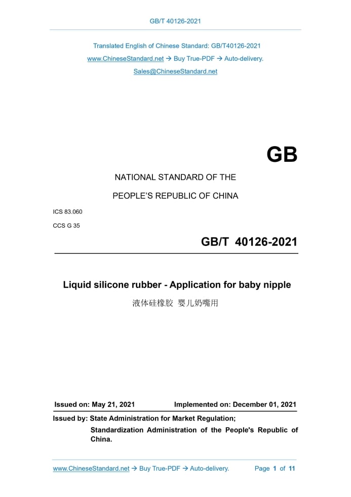 GB/T 40126-2021: Liquid silicone rubber - Application for baby nipple Delivery: 9 seconds. True-PDF full-copy in English & invoice will be downloaded + auto-delivered via email. See step-by-step procedure Status: Valid