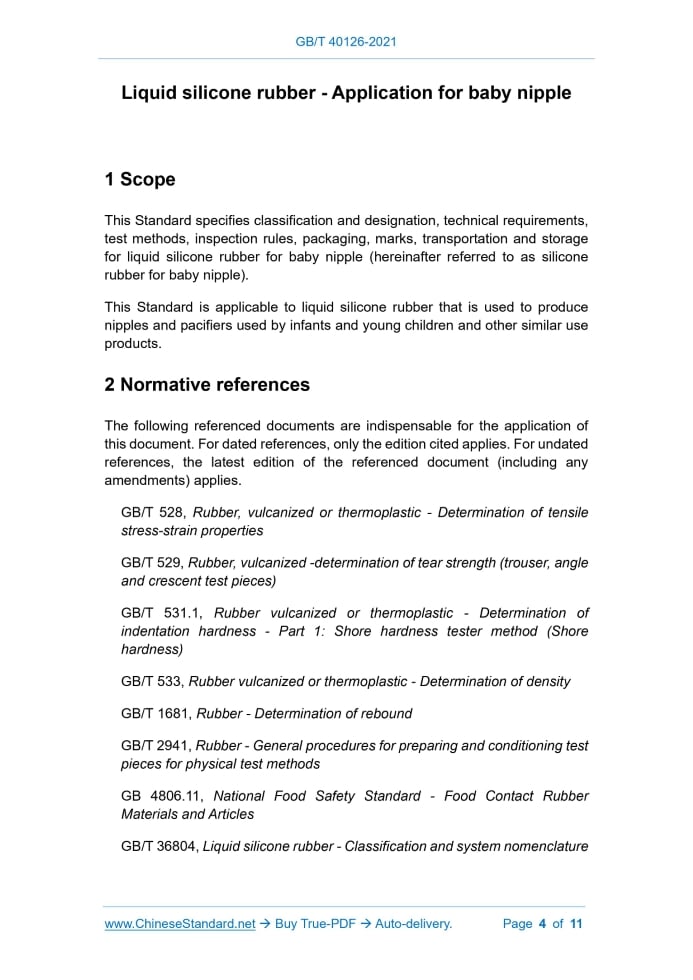 Similar standardsGB/T 40126-2021: Liquid silicone rubber - Application for baby nipple---This is an excerpt. Full copy of true-PDF in English version (including equations, symbols, images, flow-chart, tables, and figures etc.), auto-downloaded/delivered in 9 seconds, can be purchased online: https://www.ChineseStandard.net/PDF.aspx/GBT40126-2021GB NATIONAL STANDARD OF THE PEOPLE’S REPUBLIC OF CHINA ICS 83.060 CCS G 35 Liquid silicone rubber - Application for baby nipple ISSUED ON: MAY 21, 2021 IMPLEMENTED ON: DECEMBER 01, 2021 Issued by: State Administration for Market Regulation; Standardization Administration of the People's Republic of China. Table of ContentsForeword ... 3 1 Scope ... 4 2 Normative references ... 4 3 Terms and definitions ... 5 4 Classification and designations ... 5 5 Requirements ... 6 6 Test methods ... 6 7 Inspection rules ... 7 8 Marks, packaging, transportation, storage ... 8 Annex A (normative) Linear shrinkage test ... 10 Liquid silicone rubber - Application for baby nipple1 ScopeThis Standard specifies classification and designation, technical requirements, test methods, inspection rules, packaging, marks, transportation and storage for liquid silicone rubber for baby nipple (hereinafter referred to as silicone rubber for baby nipple). This Standard is applicable to liquid silicone rubber that is used to produce nipples and pacifiers used by infants and young children and other similar use products.2 Normative referencesThe following referenced documents are indispensable for the application of this document. For dated references, only the edition cited applies. For undated references, the latest edition of the referenced document (including any amendments) applies. GB/T 528, Rubber, vulcanized or thermoplastic - Determination of tensile stress-strain properties GB/T 529, Rubber, vulcanized -determination of tear strength (trouser, angle and crescent test pieces) GB/T 531.1, Rubber vulcanized or thermoplastic - Determination of indentation hardness - Part 1: Shore hardness tester method (Shore hardness) GB/T 533, Rubber vulcanized or thermoplastic - Determination of density GB/T 1681, Rubber - Determination of rebound GB/T 2941, Rubber - General procedures for preparing and conditioning test pieces for physical test methods GB 4806.11, National Food Safety Standard - Food Contact Rubber Materials and Articles GB/T 36804, Liquid silicone rubber - Classification and system nomenclature than 16h. 6.2.3 Hardness Determine according to GB/T 531.1. 6.2.4 Density Determine according to GB/T 533. 6.2.5 Tensile properties In accordance with GB/T 528, use type 1 specimen to determine the tensile strength and elongation at break. The number of specimens is not less than 5. 6.2.6 Tear strength Determine according to GB/T 529. Use crescent specimen. 6.2.7 Resilience Determine according to GB/T 1681. 6.2.8 Volatile compound content Determine in accordance with Annex A. 6.3 Hygienic properties Determine according to GB 4806.11.7 Inspection rules7.1 Type inspection The type inspection items are all items specified in Chapter 5. In one of the following situations, type inspection should be carried out: a) when the product is stereotyped, the production is transferred to another factory or the product is resumed after the production is stopped for more than half a year; b) when there are changes in raw materials, formulas or process conditions; c) when there is a big difference between the exit-factory inspection results and the previous type inspection; d) when it shall be carried out every six months during normal production. 7.2 Exit-factory inspection The exit-factory inspection items shall include: appearance, hardness, density, tensile strength, elongation at break, tear strength, resilience. 7.3 Batching and sampling Take the products not more than 2000kg but of the same raw materials, the same formula, and the same process as a batch. 2kg of samples are randomly selected from each batch. 7.4 Qualification judgement If the inspection items meet the requirements of Chapter 5, the batch of products is qualified. If any item of the inspection result is not in conformity, double sampling may be used to re-inspect the unqualified items. If the re- inspection result meets the requirements, the batch of products is qualified. If the re-inspection results still do not meet the requirements, the batch of products is not qualified.8 Marks, packaging, transportation, storage8.1 Marks The surface of the product or packaging shall at least indicate the following information: a) Manufacturer's name (or trademark) and address; b) Reference to this Standard; c) Product name; d) Designation; e) Batch number; f) Date of manufacture; g) Net weight or capacity. 8.2 Packaging The product is packed in clean, dry and well-sealed iron or plastic drums. Other packaging methods agreed between the manufacturer and the user can also be used. Each batch of products shall be accompanied by a product certificate, quality inspection report and product instruction manual.Annex A(normative) Linear shrinkage test A.1 Overview Dry the specimen at high temperature. Determine the content of volatile compounds by mass change. A.2 Instruments and equipment A.2.1 Oven: 200°C±5°C, ventilated. A.2.2 Desiccator. A.2.3 Balance: the accuracy is 0.1mg. A.2.4 Shallow aluminum foil box. A.2.5 Mold: 2mm thick. A.3 Specimen preparation Weigh a certain amount of unvulcanized liquid silicone rubber. Mix well according to the product manual. After vacuum deaeration, put it into the cold- mold mold. Refer to the product manual for specific curing conditions. The specimen shall be smooth and clean, uniform in thickness, and free of bubbles. The specimen size shall meet the requirements of each test performance. A.4 Test steps A.4.1 Cut the vulcanized rubber test piece into a small square with a side length of about 1cm. Weigh about 10g of specimen. Place in a desiccator (A.2.2) and park at room temperature for 48h. A.4