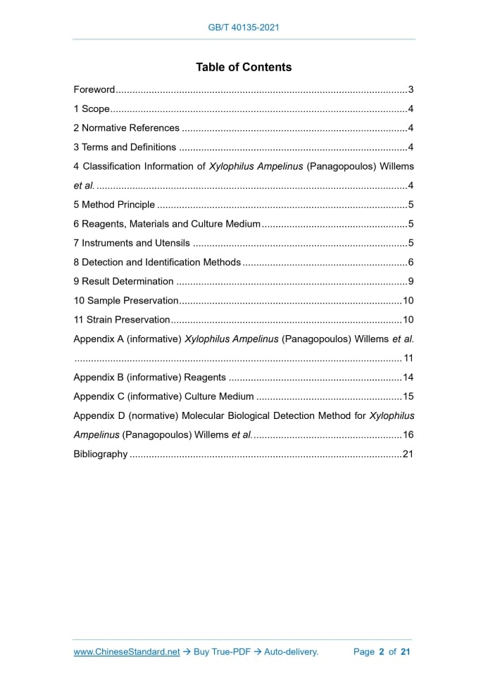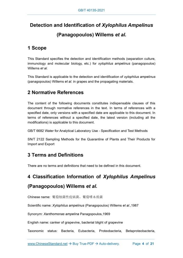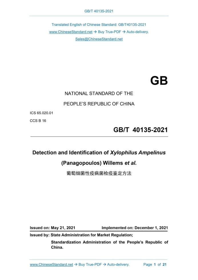 Similar standardsGB/T 40135-2021: Detection and identification of Xylophilus ampelinus (Panagopoulos) Willems et al.---This is an excerpt. Full copy of true-PDF in English version (including equations, symbols, images, flow-chart, tables, and figures etc.), auto-downloaded/delivered in 9 seconds, can be purchased online: https://www.ChineseStandard.net/PDF.aspx/GBT40135-2021 GB NATIONAL STANDARD OF THE PEOPLE’S REPUBLIC OF CHINA ICS 65.020.01 CCS B 16 Detection and Identification of Xylophilus Ampelinus (Panagopoulos) Willems et al. ISSUED ON: MAY 21, 2021 IMPLEMENTED ON: DECEMBER 1, 2021 Issued by: State Administration for Market Regulation; Standardization Administration of the People’s Republic of China. Table of ContentsForeword ... 3 1 Scope ... 4 2 Normative References ... 4 3 Terms and Definitions ... 4 4 Classification Information of Xylophilus Ampelinus (Panagopoulos) Willems et al... 4 5 Method Principle ... 5 6 Reagents, Materials and Culture Medium ... 5 7 Instruments and Utensils ... 5 8 Detection and Identification Methods ... 6 9 Result Determination ... 9 10 Sample Preservation ... 10 11 Strain Preservation ... 10 Appendix A (informative) Xylophilus Ampelinus (Panagopoulos) Willems et al. ... 11 Appendix B (informative) Reagents ... 14 Appendix C (informative) Culture Medium ... 15 Appendix D (normative) Molecular Biological Detection Method for Xylophilus Ampelinus (Panagopoulos) Willems et al... 16 Bibliography ... 21 Detection and Identification of Xylophilus Ampelinus (Panagopoulos) Willems et al.1 ScopeThis Standard specifies the detection and identification methods (separation culture, immunology and molecular biology, etc.) for xylophilus ampelinus (panagopoulos) Willems et al. This Standard is applicable to the detection and identification of xylophilus ampelinus (panagopoulos) Willems et al. in grapes and the propagating materials.2 Normative ReferencesThe content of the following documents constitutes indispensable clauses of this document through normative references in the text. In terms of references with a specified date, only versions with a specified date are applicable to this document. In terms of references without a specified date, the latest version (including all the modifications) is applicable to this document. GB/T 6682 Water for Analytical Laboratory Use - Specification and Test Methods SN/T 2122 Sampling Methods for the Quarantine of Plants and Their Products for Import and Export3 Terms and DefinitionsThere are no terms and definitions that need to be defined in this document. 4 Classification Information of Xylophilus Ampelinus (Panagopoulos) Willems et al. Chinese name: 葡萄细菌性疫病菌, 葡萄嗜木质菌 Scientific name: Xylophilus ampelinus (Panagopoulos) Willems et al.,1987 Synonym: Xanthomonas ampelina Panagopoulos,1969 English name: canker of grapevine, bacterial blight of grapevine Taxonomic status: Bacteria, Eubacteria, Proteobacteria, Betaproteobacteria, Burkholderiales, Comamonadaceae, Xylophilus See other information in Appendix A.5 Method PrincipleIn accordance with the specific reaction between Xylophilus ampelinus (Panagopoulos) Willems et al. and the antibody, conduct immunological detection on the test object. In accordance with the specific DNA sequence of Xylophilus ampelinus (Panagopoulos) Willems et al., conduct molecular biological detection. In accordance with the cultural characteristics, biological characteristics and hazard symptoms of Xylophilus ampelinus (Panagopoulos) Willems et al., conduct separation culture on the pathogenic bacteria, if necessary, conduct pathogenicity detection.6 Reagents, Materials and Culture Medium6.1 Reagents and Materials Unless it is otherwise specified, all reagents used for the tests are analytically pure or biochemical reagents. Reagents: 75% alcohol, glucose, agarose, sterile double distilled water, sodium dodecyl sulfate (SDS), chloroform, isoamyl alcohol, phenol, isopropanol, absolute ethanol, proteinase K, nucleic acid dye, DNA molecular mass reference substance, 50 TAE electrophoresis buffer. See Appendix B for information on the reagents and their preparation. Materials: plant genomic extraction kit, bacterial genomic extraction kit, common PCR reaction kit and fluorescent PCR reaction kit, etc. 6.2 Culture Medium See Appendix C for information on YPGA culture medium, nutrient agar medium (NA), culture medium and its preparation. YPGA is recommended for the separation culture medium, and NA may also be used as a substitute.7 Instruments and Utensils7.1 Instruments Biological microscope (magnification by more than 400 times), constant-temperature incubator, electronic balance (one thousandth), plant light incubator, refrigerator, centrifuge, microplate reader, electrophoresis instrument, PCR amplification instrument and real-time fluorescence quantitative PCR instrument, etc. molecular biological detection. In accordance with laboratory conditions, one of the following methods (8.4.2 or 8.4.3) may be selected for the detection. 8.4.2 Common PCR and nested PCR DNA extracted from the extract or other separated objects is used as a template for the common PCR and nested PCR detection. The detection steps and conditions shall comply with D.2. 8.4.3 Real-time florescence PCR DNA extracted from the extract or other separated objects is used as a template for the real-time fluorescence PCR detection. The detection steps and conditions shall comply with D.3. 8.5 Separation of Pathogenic Bacteria 8.5.1 Plant materials with symptoms Take the liquid obtained in 8.2.1 and directly apply it to the YPGA plate; apply 5 ~ 10 petri dishes for each sample. At 25 °C, cultivate them; from the third day, observe the growth of colonies on the plate every day. Typical colony, which grows slowly on the culture medium, is smooth and non-sticky, shiny, slightly convex, light yellow, circular and with regular edges. After 7 d ~ 12 d of culture, the size is about 2 mm. If necessary, conduct pur