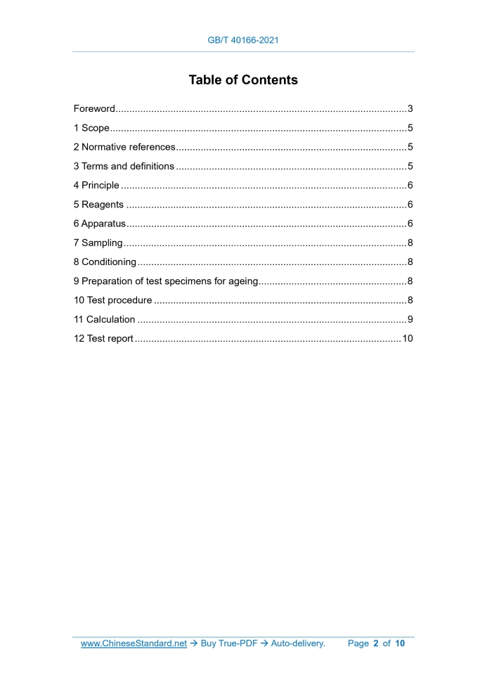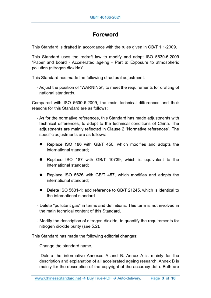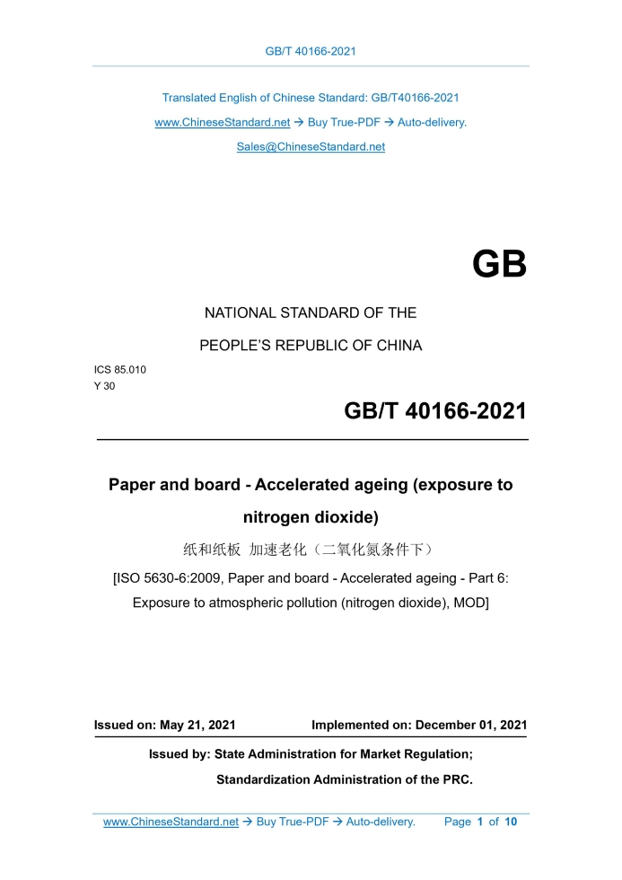 Similar standardsGB/T 40166-2021: Paper and board - Accelerated ageing(exposure to nitrogen dioxide)---This is an excerpt. Full copy of true-PDF in English version (including equations, symbols, images, flow-chart, tables, and figures etc.), auto-downloaded/delivered in 9 seconds, can be purchased online: https://www.ChineseStandard.net/PDF.aspx/GBT40166-2021GB NATIONAL STANDARD OF THE PEOPLE’S REPUBLIC OF CHINA ICS 85.010 Y 30 Paper and board - Accelerated ageing (exposure to nitrogen dioxide) [ISO 5630-6:2009, Paper and board - Accelerated ageing - Part 6: Exposure to atmospheric pollution (nitrogen dioxide), MOD] ISSUED ON: MAY 21, 2021 IMPLEMENTED ON: DECEMBER 01, 2021 Issued by: State Administration for Market Regulation; Standardization Administration of the PRC. Table of ContentsForeword ... 3 1 Scope ... 5 2 Normative references ... 5 3 Terms and definitions ... 5 4 Principle ... 6 5 Reagents ... 6 6 Apparatus ... 6 7 Sampling ... 8 8 Conditioning ... 8 9 Preparation of test specimens for ageing ... 8 10 Test procedure ... 8 11 Calculation ... 9 12 Test report ... 10ForewordThis Standard is drafted in accordance with the rules given in GB/T 1.1-2009. This Standard uses the redraft law to modify and adopt ISO 5630-6:2009 "Paper and board - Accelerated ageing - Part 6: Exposure to atmospheric pollution (nitrogen dioxide)". This Standard has made the following structural adjustment: - Adjust the position of “WARNING”, to meet the requirements for drafting of national standards. Compared with ISO 5630-6:2009, the main technical differences and their reasons for this Standard are as follows: - As for the normative references, this Standard has made adjustments with technical differences, to adapt to the technical conditions of China. The adjustments are mainly reflected in Clause 2 “Normative references”. The specific adjustments are as follows: Replace ISO 186 with GB/T 450, which modifies and adopts the international standard; Replace ISO 187 with GB/T 10739, which is equivalent to the international standard; Replace ISO 5626 with GB/T 457, which modifies and adopts the international standard; Delete ISO 5631-1; add reference to GB/T 21245, which is identical to the international standard. - Delete "pollutant gas" in terms and definitions. This term is not involved in the main technical content of this Standard. - Modify the description of nitrogen dioxide, to quantify the requirements for nitrogen dioxide purity (see 5.2). This Standard has made the following editorial changes: - Change the standard name. - Delete the informative Annexes A and B. Annex A is mainly for the description and explanation of all accelerated ageing research. Annex B is mainly for the description of the copyright of the accuracy data. Both are Paper and board - Accelerated ageing (exposure to nitrogen dioxide) WARNING — Nitrogen dioxide is a highly toxic gas at the concentrations specified in this test method. Follow the manufacturer’s safety data sheets for the safety of personnel performing this test.1 ScopeThis Standard specifies a method for accelerating the ageing of printing and writing papers through exposure to nitrogen dioxide gas and assessing the effect on mechanical and optical properties for the purpose of predicting stability to long-term natural ageing that occurs due to exposure to polluted air. This Standard is applicable to all printing and writing papers, including coated papers and filled papers.2 Normative referencesGB/T 450 Paper and board - Sampling for testing and identification of machine and cross direction, wire side and felt side (GB/T 450-2008, ISO 186:2002, MOD) GB/T 457 Paper and board - Determination of folding endurance (GB/T 457- 2008, ISO 5626:1993, MOD) GB/T 10739 Paper, board and pulps - Standard atmosphere for conditioning and testing (GB/T 10739-2002, eqv ISO 187:1990) GB/T 21245 Paper and board - Determination of color (C/2-degree diffuse reflectance method) (GB/T 21245-2007, ISO 5631:2000, IDT)3 Terms and definitionsFor the purposes of this document, the following terms and definitions apply. 3.1 Polluted air Mixture of dry air and a volume fraction of 0.0050 % ± 0.0002 % of nitrogen ......Source: Above contents are excerpted from the full-copy PDF -- translated/reviewed by: www.ChineseStandard.net / Wayne Zheng et al. Tips & Frequently Asked Questions:Question 1: How long will the true-PDF of English version of GB/T 40166-2021 be delivered?Answer: The full copy PDF of English version of GB/T 40166-2021 can be downloaded in 9 seconds, and it will also be emailed to you in 9 seconds (double mechanisms to ensure the delivery reliably), with PDF-invoice.Question 2: Can I share the purchased PDF of GB/T 40166-2021_English with my colleagues?Answer: Yes. The purchased PDF of GB/T 40166-2021_English will be deemed to be sold to your employer/organization who actually paid for it, including your colleagues and your employer's intranet.Question 3: Does the price include tax/VAT?Answer: Yes. Our tax invoice, downloaded/delivered in 9 seconds, includes all tax/VAT and complies with 100+ countries' tax regulations (tax exempted in 100+ countries) -- See Avoidance of Double Taxation Agreements (DTAs): List of DTAs signed between Singapore and 100+ countriesQuestion 4: Do you accept my currency other than USD?Answer: Yes. www.ChineseStandard.us -- GB/T 40166-2021 -- Click this link and select your country/currency to pay, the exact amount in your currency will be printed on the invoice. Full PDF will also be downloaded/emailed in 9 seconds.How to buy and download a true PDF of English version of GB/T 40166-2021?A step-by-step guide to download PDF of GB/T 40166-2021_EnglishStep 1: Visit website https://www.ChineseStandard.net (Pay in USD), or https://www.ChineseStandard.us (Pay in any currencies such as Euro, KRW, JPY, AUD).Step 2: Search keyword "GB/T 40166-2021". Step 3: Click "Add to Cart". If multiple PDFs are required, repeat steps 2 and 3 to add up to 12 PDF