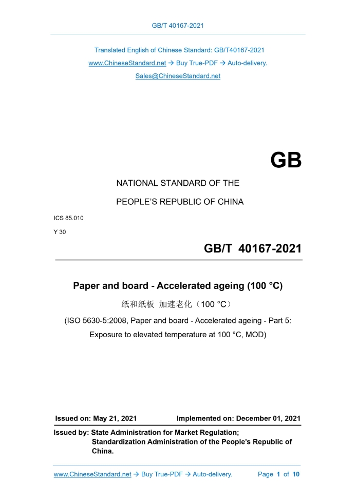 GB/T 40167-2021: Paper and board - Accelerated ageing (100 degree-Celsius) Delivery: 9 seconds. True-PDF full-copy in English & invoice will be downloaded + auto-delivered via email. See step-by-step procedure Status: Valid