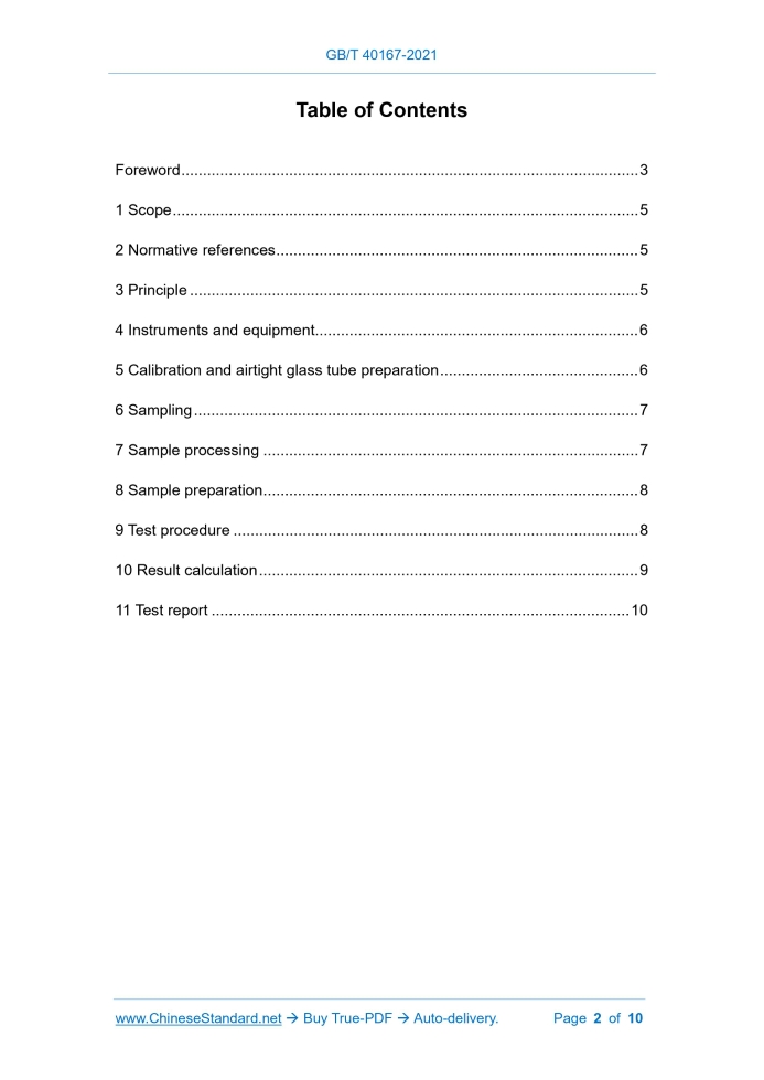 Similar standardsGB/T 40167-2021: Paper and board - Accelerated ageing (100 degree-Celsius)---This is an excerpt. Full copy of true-PDF in English version (including equations, symbols, images, flow-chart, tables, and figures etc.), auto-downloaded/delivered in 9 seconds, can be purchased online: https://www.ChineseStandard.net/PDF.aspx/GBT40167-2021GB NATIONAL STANDARD OF THE PEOPLE’S REPUBLIC OF CHINA ICS 85.010 Y 30 Paper and board - Accelerated ageing (100 °C) (ISO 5630-5:2008, Paper and board - Accelerated ageing - Part 5: Exposure to elevated temperature at 100 °C, MOD) ISSUED ON: MAY 21, 2021 IMPLEMENTED ON: DECEMBER 01, 2021 Issued by: State Administration for Market Regulation; Standardization Administration of the People’s Republic of China. Table of ContentsForeword ... 3 1 Scope ... 5 2 Normative references ... 5 3 Principle ... 5 4 Instruments and equipment... 6 5 Calibration and airtight glass tube preparation ... 6 6 Sampling ... 7 7 Sample processing ... 7 8 Sample preparation ... 8 9 Test procedure ... 8 10 Result calculation ... 9 11 Test report ... 10 Paper and board - Accelerated ageing (100 °C)1 ScopeThis Standard specifies the accelerated ageing method of printing paper and writing paper at 100 °C, and, by evaluating the impact of ageing treatment on the two physical properties of the paper, namely folding number and tearing resistance, predicts the effect of long-term natural ageing process on paper stability. This Standard applies to all kinds of printing paper and writing paper, including coated paper and filled paper.2 Normative referencesThe following documents are indispensable for the application of this document. For dated references, only the dated version applies to this document. For undated references, the latest edition (including all amendments) applies to this document. GB/T 450, Paper and board - Sampling for testing and identification of machine and cross direction, wire side and felt side (GB/T 450-2008, ISO 186:2002, MOD) GB/T 455, Paper and board - Determination of tearing resistance (GB/T 455- 2002, eqv ISO 1974:1990) GB/T 457, Paper and board - Determination of folding endurance (GB/T 457- 2008, ISO 5626:1993, MOD) GB/T 462, Paper, board and pulp - Determination of moisture content of analytical sample (GB/T 462-2008, ISO 287:1985, ISO 638:1978, MOD) GB/T 10739, Paper, board and pulps - Standard atmosphere for conditioning and testing (GB/T 10739-2002, eqv ISO 187:1990)3 PrinciplePut the temperature and humidity treated sample into an airtight glass tube; after ageing treatment at 100 °C for a certain period of time, compare the changes in the folding number and tearing resistance of the sample before and after the ageing treatment, so as to measure the stability of the paper strength. b) Use tap water to thoroughly rinse the airtight glass tube to remove residual non-ionic detergent; c) Use distilled water to rinse three times and drain the airtight glass tube; d) Dry the airtight glass tube in an oven at 105 °C; e) Place the airtight glass tube (including threaded cap and "O" ring or gasket) under the atmospheric conditions, that are specified in GB/T 10739, for temperature and humidity conditioning for 24 h 5.2.2 Unused airtight glass tube for aging treatment The unused airtight glass tube (including threaded cap and "O" ring or gasket) shall be treated in an oven at 105 °C for at least 24 h before use. Before putting the sample, it shall be placed under the atmospheric conditions that are specified in GB/T 10739 for temperature and humidity conditioning for 24 h. 5.2.3 Storage of the airtight glass tube for aging treatment After temperature and humidity treatment, seal the airtight glass tube and store it.6 SamplingWear clean cotton gloves when sampling. If the purpose of the test is to evaluate a batch of samples, samples shall be selected according to GB/T 450. If samples of other types are tested, it shall be ensured that the sample taken is representative among the samples. When the sample size is larger than the size of an A4 paper, the sample needs to be cut into the size of an A4 paper. Randomly select a number of samples from the samples; the number of samples shall meet the requirements of the test. If the size of the sample is smaller than the size of an A4 paper, calculate the number of samples to be cut according to the area.7 Sample processingUnder the standard atmospheric conditions that are specified in GB/T 10739, perform temperature and humidity processing for the aging and control samples. The control sample shall always be placed under the standard atmospheric conditions that are specified in GB/T 10739.8 Sample preparationCut two sets of samples, one set for aging treatment and one set for control test. The size of the sample shall meet the requirements of GB/T 455 or GB/T 457. At the same time, determine the absolutely dry matter content of the sample according to the provisions of GB/T 462; calculate the absolutely dry matter.9 Test procedure9.1 Ageing of samples Calculate the number of airtight glass tubes (4.2) that are required to load the sample; ensure that there are (0.027 8 ± 0.000 07) g of absolutely dry sample per cubic centimeter in the airtight glass tube. If the calculated number of airtight glass tubes is not an integer, it shall be rounded up to the next integer. Put the samples to be aged into the airtight glass tube; ensure that the sample masses in each airtight glass tube are the same. The samples that are used for the tearing resistance test shall be stacked together and then rolled and put into the airtight glass tube; the samples that are used for the folding endurance test shall be put into the rolled samples for the tearing resistance test. If the mass of the absolutely dry samples per unit volume of the airtight glass tube is less than the specified value, more samples need to be cut into the airtight glass tube. Put on the lid of the airtight glass tube and tighten it; ensure that t