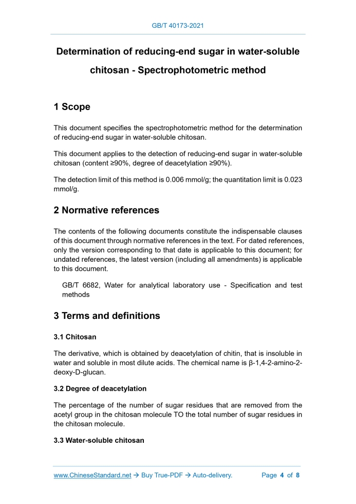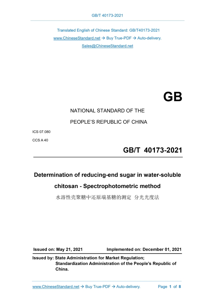 GB/T 40173-2021: Determination of reducing-end sugar in water-soluble chitosan - Spectrophotometric method Delivery: 9 seconds. True-PDF full-copy in English & invoice will be downloaded + auto-delivered via email. See step-by-step procedure Status: Valid