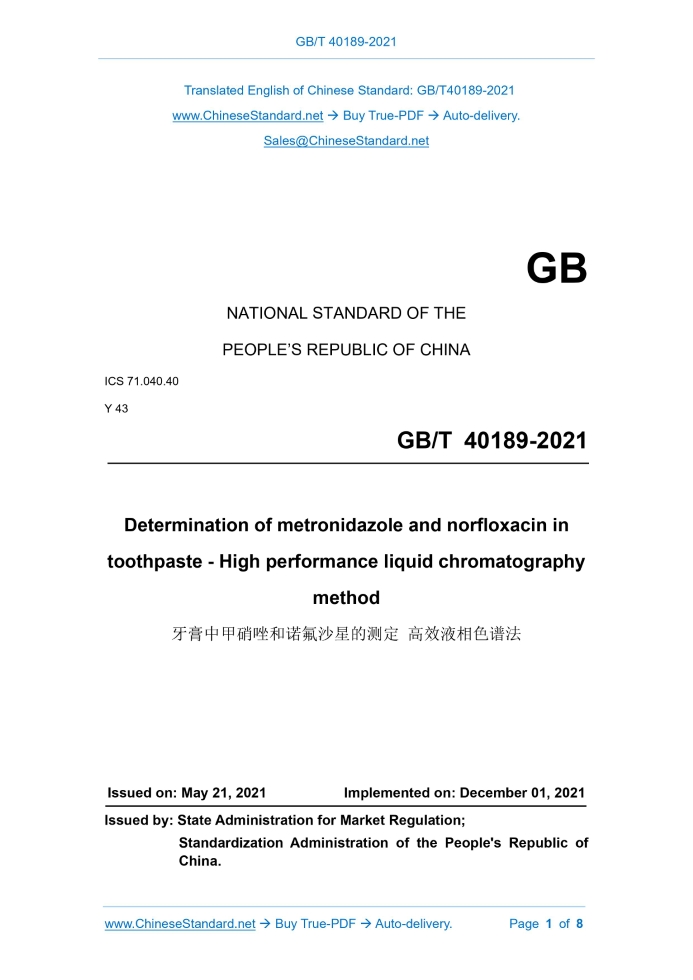 GB/T 40189-2021: Determination of metronidazole and norfloxacin in toothpaste - High performance liquid chromatography method Delivery: 9 seconds. True-PDF full-copy in English & invoice will be downloaded + auto-delivered via email. See step-by-step procedure Status: Valid