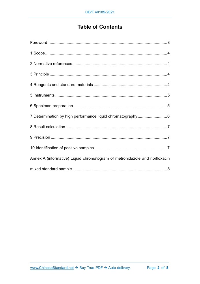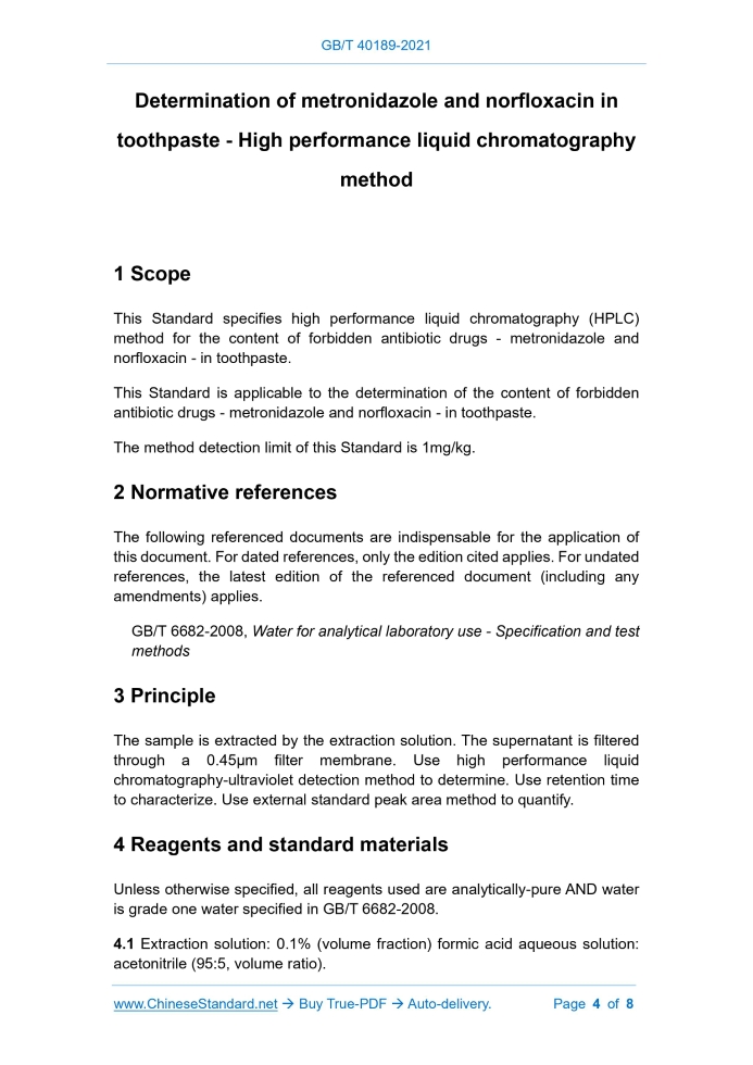 Similar standardsGB/T 40189-2021: Determination of metronidazole and norfloxacin in toothpaste - High performance liquid chromatography method---This is an excerpt. Full copy of true-PDF in English version (including equations, symbols, images, flow-chart, tables, and figures etc.), auto-downloaded/delivered in 9 seconds, can be purchased online: https://www.ChineseStandard.net/PDF.aspx/GBT40189-2021 GB NATIONAL STANDARD OF THE PEOPLE’S REPUBLIC OF CHINA ICS 71.040.40 Y 43 Determination of metronidazole and norfloxacin in toothpaste - High performance liquid chromatography method ISSUED ON: MAY 21, 2021 IMPLEMENTED ON: DECEMBER 01, 2021 Issued by: State Administration for Market Regulation; Standardization Administration of the People's Republic of China. Table of ContentsForeword ... 3 1 Scope ... 4 2 Normative references ... 4 3 Principle ... 4 4 Reagents and standard materials ... 4 5 Instruments ... 5 6 Specimen preparation ... 5 7 Determination by high performance liquid chromatography ... 6 8 Result calculation ... 7 9 Precision ... 7 10 Identification of positive samples ... 7 Annex A (informative) Liquid chromatogram of metronidazole and norfloxacin mixed standard sample ... 8 Determination of metronidazole and norfloxacin in toothpaste - High performance liquid chromatography method1 ScopeThis Standard specifies high performance liquid chromatography (HPLC) method for the content of forbidden antibiotic drugs - metronidazole and norfloxacin - in toothpaste. This Standard is applicable to the determination of the content of forbidden antibiotic drugs - metronidazole and norfloxacin - in toothpaste. The method detection limit of this Standard is 1mg/kg.2 Normative referencesThe following referenced documents are indispensable for the application of this document. For dated references, only the edition cited applies. For undated references, the latest edition of the referenced document (including any amendments) applies. GB/T 6682-2008, Water for analytical laboratory use - Specification and test methods3 PrincipleThe sample is extracted by the extraction solution. The supernatant is filtered through a 0.45μm filter membrane. Use high performance liquid chromatography-ultraviolet detection method to determine. Use retention time to characterize. Use external standard peak area method to quantify.4 Reagents and standard materialsUnless otherwise specified, all reagents used are analytically-pure AND water is grade one water specified in GB/T 6682-2008. 4.1 Extraction solution: 0.1% (volume fraction) formic acid aqueous solution: acetonitrile (95:5, volume ratio).7 Determination by high performance liquidchromatography 7.1 Reference conditions of liquid chromatography The reference conditions of liquid chromatography are as follows: a) Chromatographic column: C18 stainless steel column (250mm×4.6mm×5μm). b) Detection wavelength: 290nm. c) Mobile phase: use triethylamine to adjust the pH value of 0.1% (volume fraction) phosphoric acid aqueous solution: acetonitrile (83:17, volume ratio) to 2.5~3.0. d) Flow rate: 1.0mL/min. e) Column temperature: 30°C. f) Injection volume: 10μL. 7.2 Preparation of standard working solution Use mobile phase solution to gradually dilute 100mg/L mixed standard stock solution (4.7). Prepare into 50mg/L, 20mg/L, 10mg/L, 5mg/L standard working solutions. Use 0.45μm filter membrane to filter for future use. Under the set chromatographic conditions, respectively take 10μL for analysis. Take the mass concentration of the standard series of solutions as the abscissa (mg/L), the peak area of the reference substance as the ordinate to draw the calibration curve (linear correlation coefficient R ≥0.9990). Refer to Figure A.1 in Annex A for the liquid chromatogram of metronidazole and norfloxacin mixed standard sample. 7.3 Determination steps After the sample is processed according to the steps in Chapter 6, perform on- board testing according to the instrument conditions of 7.1. The response values of metronidazole and norfloxacin in the test sample solution shall be within the linear range of the standard curve. If it exceeds the linear range, it shall be diluted before injection for determination. 7.4 Blank test Except for not adding specimen, the test is carried out according to the processing steps in Chapter 6 and the instrument conditions in 7.1. ......Source: Above contents are excerpted from the full-copy PDF -- translated/reviewed by: www.ChineseStandard.net / Wayne Zheng et al. Tips & Frequently Asked Questions:Question 1: How long will the true-PDF of English version of GB/T 40189-2021 be delivered?Answer: The full copy PDF of English version of GB/T 40189-2021 can be downloaded in 9 seconds, and it will also be emailed to you in 9 seconds (double mechanisms to ensure the delivery reliably), with PDF-invoice.Question 2: Can I share the purchased PDF of GB/T 40189-2021_English with my colleagues?Answer: Yes. The purchased PDF of GB/T 40189-2021_English will be deemed to be sold to your employer/organization who actually paid for it, including your colleagues and your employer's intranet.Question 3: Does the price include tax/VAT?Answer: Yes. Our tax invoice, downloaded/delivered in 9 seconds, includes all tax/VAT and complies with 100+ countries' tax regulations (tax exempted in 100+ countries) -- See Avoidance of Double Taxation Agreements (DTAs): List of DTAs signed between Singapore and 100+ countriesQuestion 4: Do you accept my currency other than USD?Answer: Yes. www.ChineseStandard.us -- GB/T 40189-2021 -- Click this link and select your country/currency to pay, the exact amount in your currency will be printed on the invoice. Full PDF will also be downloaded/emailed in 9 seconds.How to buy and download a true PDF of English version of GB/T 40189-2021?A step-by-step guide to download PDF of GB/T 40189-2021_EnglishStep 1: Visit website https://www.ChineseStandard.net (Pay in USD), or https://www.ChineseStandard.us (Pay in any currencies s