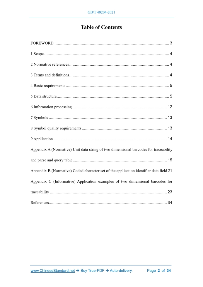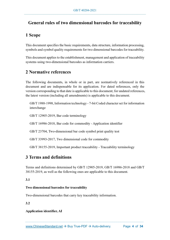 Similar standardsGB/T 40204-2021: General rules of two dimensional barcodes for traceability---This is an excerpt. Full copy of true-PDF in English version (including equations, symbols, images, flow-chart, tables, and figures etc.), auto-downloaded/delivered in 9 seconds, can be purchased online: https://www.ChineseStandard.net/PDF.aspx/GBT40204-2021NATIONAL STANDARD OF THE PEOPLE’S REPUBLIC OF CHINA ICS 35.040 CCS L 71 General rules of two dimensional barcodes for traceability ISSUED ON: MAY 21, 2021 IMPLEMENTED ON: DECEMBER 01, 2021 Issued by: State Administration for Market Regulation; Standardization Administration of the People’s Republic of China. Table of ContentsFOREWORD ... 3 1 Scope ... 4 2 Normative references ... 4 3 Terms and definitions... 4 4 Basic requirements ... 5 5 Data structure ... 5 6 Information processing ... 12 7 Symbols ... 13 8 Symbol quality requirements ... 13 9 Application ... 14 Appendix A (Normative) Unit data string of two dimensional barcodes for traceability and parse and query table ... 15 Appendix B (Normative) Coded character set of the application identifier data field 21 Appendix C (Informative) Application examples of two dimensional barcodes for traceability ... 23 References ... 34 General rules of two dimensional barcodes for traceability1 ScopeThis document specifies the basic requirements, data structure, information processing, symbols and symbol quality requirements for two dimensional barcodes for traceability. This document applies to the establishment, management and application of traceability systems using two-dimensional barcodes as information carriers.2 Normative referencesThe following documents, in whole or in part, are normatively referenced in this document and are indispensable for its application. For dated references, only the version corresponding to that date is applicable to this document; for undated references, the latest version (including all amendments) is applicable to this document. GB/T 1988-1998, Information technology - 7-bit Coded character set for information interchange GB/T 12905-2019, Bar code terminology GB/T 16986-2018, Bar code for commodity - Application identifier GB/T 23704, Two-dimensional bar code symbol print quality test GB/T 33993-2017, Two dimensional code for commodity GB/T 38155-2019, Important product traceability - Traceability terminology3 Terms and definitionsTerms and definitions determined by GB/T 12905-2019, GB/T 16986-2018 and GB/T 38155-2019, as well as the following ones are applicable to this document. 3.1 Two dimensional barcodes for traceability Two-dimensional barcodes that carry key traceability information. 3.2 Application identifier, AI Characters that identify the meaning and format of data, consisting of 2 ~ 4 digits. [Source: GB/T 16986-2018, 3.1]4 Basic requirements4.1 General The two dimensional barcodes for traceability shall be based on the identification object corresponding to the traceability system; an appropriate data structure shall be selected, to be in one-to-one correspondence with its traceability accuracy. A two dimensional barcode for traceability shall be given when the traceability unit is generated; the barcode shall accompany the entire life cycle of the traceability unit. The coding of the two dimensional barcodes for traceability shall adopt the international common coding technology; the identification of the two dimensional barcodes for traceability shall adopt the two-dimensional code symbology with international standards or national standards. 4.2 Identification objects The identification objects of the two dimensional barcodes for traceability are traceability participants, traceability units, physical locations and transaction information. Among them, traceability units include trade traceability unit, logistics traceability unit, freight traceability unit, asset traceability unit and document traceability unit.5 Data structure5.1 General requirements 5.1.1 Data structure types The data structure of the two dimensional barcodes for traceability is divided into coded data structure and URL data structure. Refer to 5.1.2 for coded data structure, and 5.1.3 for URL data structure. 5.1.2 Coded data structure The coded data structure consists of one or more required unit data string(s) and optional unit data string(s) in sequence. Each unit data string consists of an application identifier (AI) and an application identifier data field. The application identifier shall comply with the provisions of GB/T 16986-2018; the meaning, format and unit data string name of the application identifier and its corresponding data coding shall comply with the provisions of Appendix A. The characters shall contain all the characters in Table 2 of GB/T 1988-1998, and shall comply with the provisions of Appendix B.6 Information processing6.1 Analysis of coded data structures When the terminal scans and reads the two dimensional barcode for traceability of the traceability unit, the information carried by the two-dimensional code shall be analyzed. For each unit data string contained in the two dimensional barcode for traceability of the traceability unit, according to the analyzed application identifier, look up table A.1 to obtain the name of the unit data string and the corresponding application identifier data field and transmit it to the local information management system or network information system for processing. The name of the unit data string and the corresponding application identifier data field shall be separated by “:”, and the information of different unit data strings shall be displayed in separate lines. EXAMPLE: The encoded information character string in the two dimensional barcode for traceability of a trade traceability unit is: (01)06901234567892(10)A1000B0000(21)C51031902101083826 The encoded information format obtained after the terminal scans the two dimensional barcode for traceability of the trade traceability unit is: Global Trade 