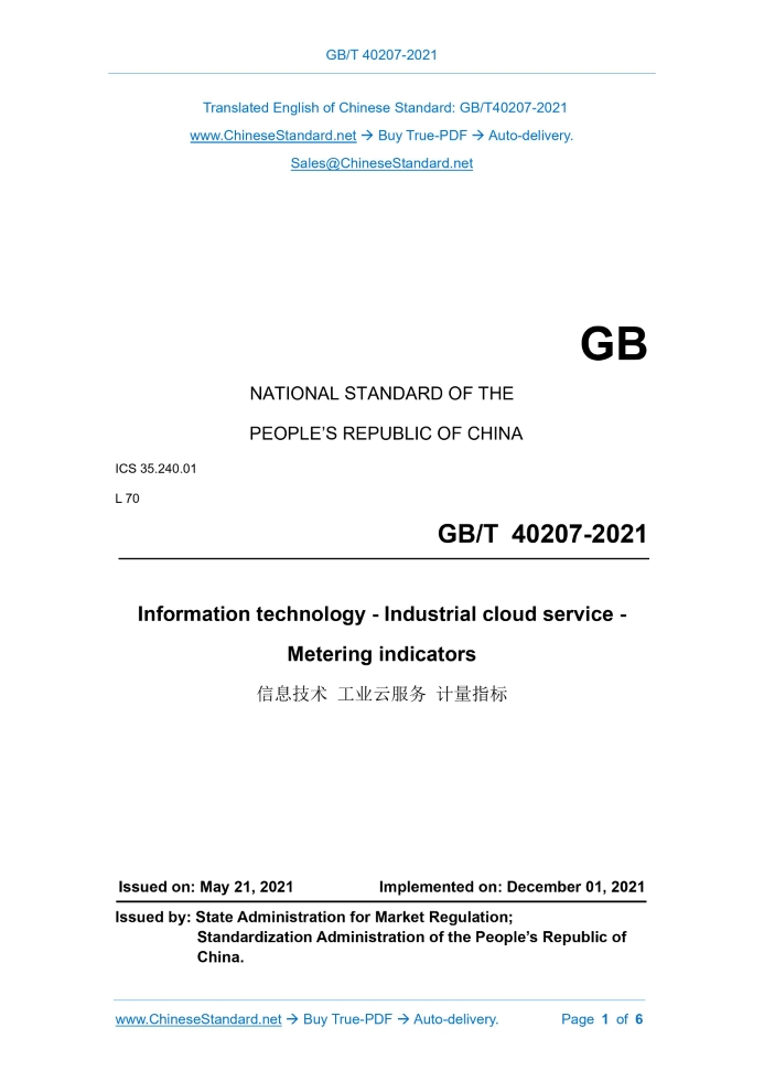 GB/T 40207-2021: Information technology - Industrial cloud service - Metering indicators Delivery: 9 seconds. True-PDF full-copy in English & invoice will be downloaded + auto-delivered via email. See step-by-step procedure Status: Valid