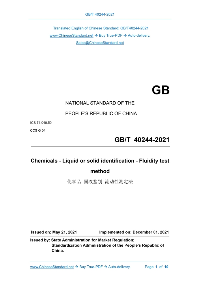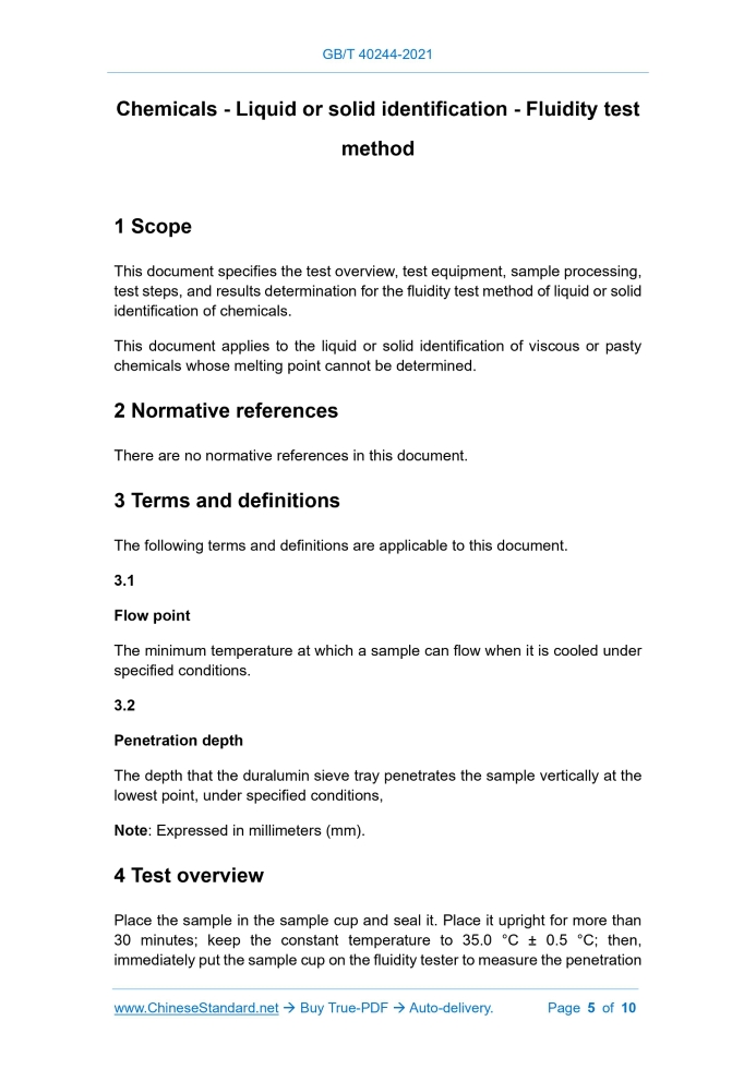 GB/T 40244-2021: Chemicals - Liquid or solid identification - Fluidity test method Delivery: 9 seconds. True-PDF full-copy in English & invoice will be downloaded + auto-delivered via email. See step-by-step procedure Status: Valid
