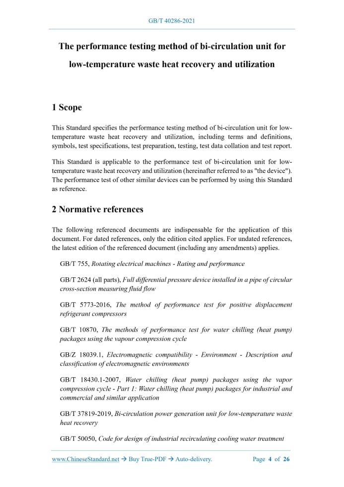 Similar standardsGB/T 40286-2021: The performance testing method of bi-circulation unit for low-temperature waste heat recovery and utilization---This is an excerpt. Full copy of true-PDF in English version (including equations, symbols, images, flow-chart, tables, and figures etc.), auto-downloaded/delivered in 9 seconds, can be purchased online: https://www.ChineseStandard.net/PDF.aspx/GBT40286-2021 NATIONAL STANDARD OF THE PEOPLE’S REPUBLIC OF CHINA ICS 27.010 J 88 The performance testing method of bi-circulation unit for low-temperature waste heat recovery and utilization ISSUED ON: MAY 21, 2021 IMPLEMENTED ON: DECEMBER 01, 2021 Issued by: State Administration for Market Regulation; Standardization Administration of the People's Republic of China. Table of ContentsForeword ... 3 1 Scope ... 4 2 Normative references ... 4 3 Terms and definitions ... 5 4 Symbols ... 6 5 Test regulations ... 8 6 Test preparation ... 9 7 Testing ... 13 8 Test data collation and test report ... 21 Annex A (informative) Test report template ... 24 The performance testing method of bi-circulation unit for low-temperature waste heat recovery and utilization1 ScopeThis Standard specifies the performance testing method of bi-circulation unit for low- temperature waste heat recovery and utilization, including terms and definitions, symbols, test specifications, test preparation, testing, test data collation and test report. This Standard is applicable to the performance test of bi-circulation unit for low- temperature waste heat recovery and utilization (hereinafter referred to as "the device"). The performance test of other similar devices can be performed by using this Standard as reference.2 Normative referencesThe following referenced documents are indispensable for the application of this document. For dated references, only the edition cited applies. For undated references, the latest edition of the referenced document (including any amendments) applies. GB/T 755, Rotating electrical machines - Rating and performance GB/T 2624 (all parts), Full differential pressure device installed in a pipe of circular cross-section measuring fluid flow GB/T 5773-2016, The method of performance test for positive displacement refrigerant compressors GB/T 10870, The methods of performance test for water chilling (heat pump) packages using the vapour compression cycle GB/Z 18039.1, Electromagnetic compatibility - Environment - Description and classification of electromagnetic environments GB/T 18430.1-2007, Water chilling (heat pump) packages using the vapor compression cycle - Part 1: Water chilling (heat pump) packages for industrial and commercial and similar application GB/T 37819-2019, Bi-circulation power generation unit for low-temperature waste heat recovery GB/T 50050, Code for design of industrial recirculating cooling water treatment cp - the constant pressure specific heat capacity of the cold source or heat source medium at the average temperature, in joules per kilogram Celsius [J/(kg·℃)]; ha - the specific enthalpy of the organic working medium at the outlet of the evaporator, in joules per kilogram (J/kg); hd - the specific enthalpy of the organic working medium at the inlet of the evaporator, in joules per kilogram (J/kg); h1 - the inlet enthalpy value of the heat source medium on the evaporator side, in joules per kilogram (J/kg); h2 - the outlet enthalpy of the heat source medium on the evaporator side, in Joules per kilogram (J/kg); Kc - the heat transfer coefficient between the outer surface of the condenser and the ambient air, in watts per square meter Celsius [W/(m2·℃)]; Ke - the heat transfer coefficient between the outer surface of the evaporator and the ambient air, in watts per square meter Celsius [W/(m2·℃)]; Kf - the heat transfer coefficient between the outer surface of the auxiliary equipment and the ambient air from the evaporator to the expander and from the expander to the condenser, in units of watts per square meter Celsius [W/(m2·℃)]; Mg - the mass flow rate of the gas organic working medium and lubricating oil mixture measured by the flow meter, in kilograms per second (kg/s); Ml - the mass flow rate of the mixture of liquid organic working medium and lubricating oil measured by the flow meter, in kilograms per second (kg/s); Pin - the electric power input of the device, in watts (W); Pout - the electric power output of the device, in watts (W); Ps - the shaft power output of the device, in watts (W); Qc - the heat release on the condenser side of the device, in watts (W); Qc,r - the heat correction value of the condenser into the environment, in watts (W); Qe - the heat absorption on the evaporator side of the device, in watts (W); Qe,r - the heat correction value of the evaporator into the environment, in watts (W); Qs,r - the total heat released to the ambient air by the auxiliary equipment from the evaporator to the expander and from the expander to the condenser, in watts (W); qv - the volume flow, in cubic meters per second (m3/s); ta - the ambient air temperature, in degrees Celsius (°C); tc,m - the average value of the inlet and outlet temperatures of the cooling source medium on the condenser side, in degrees Celsius (°C); te,m - the average value of the inlet and outlet temperatures of the heat source medium on the evaporator side, in degrees Celsius (°C); tf - the average surface temperature of auxiliary equipment from the evaporator to the expander and from the expander to the condenser, in degrees Celsius (°C); t1 - the inlet temperature of the heat source medium on the evaporator side, in degrees Celsius (°C); t2 - the outlet temperature of the heat source medium on the evaporator side, in degrees Celsius (°C); t3 - the inlet temperature of the cooling source medium on the condenser side, in degrees Celsius (°C); t4 - the outlet temperature of the cooling source medium on the condenser side, in degrees Celsius (°C); αf - the surface heat transfer c