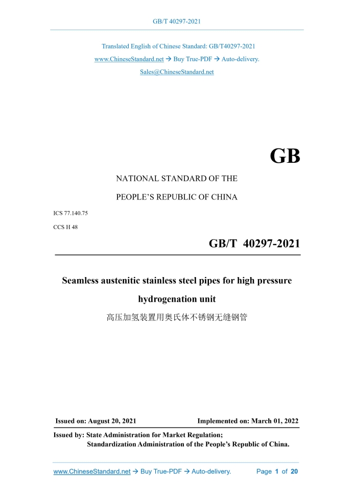 GB/T 40297-2021: Seamless austenitic stainless steel pipes for high pressure hydrogenation unit Delivery: 9 seconds. True-PDF full-copy in English & invoice will be downloaded + auto-delivered via email. See step-by-step procedure Status: Valid