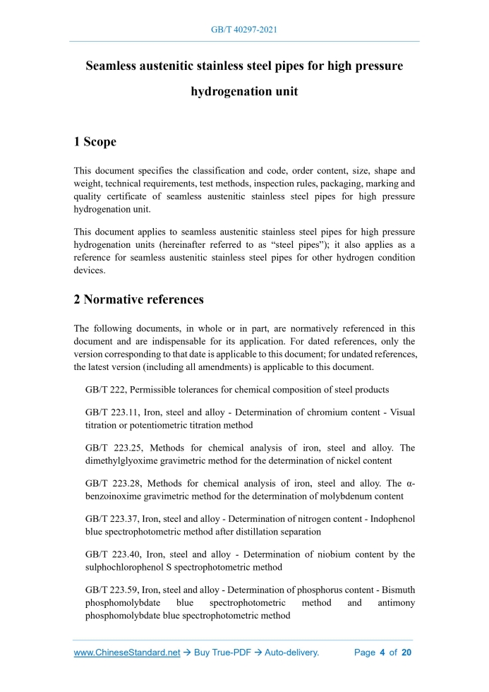 Similar standardsGB/T 40297-2021: Seamless austenitic stainless steel pipes for high pressure hydrogenation unit---This is an excerpt. Full copy of true-PDF in English version (including equations, symbols, images, flow-chart, tables, and figures etc.), auto-downloaded/delivered in 9 seconds, can be purchased online: https://www.ChineseStandard.net/PDF.aspx/GBT40297-2021NATIONAL STANDARD OF THE PEOPLE’S REPUBLIC OF CHINA ICS 77.140.75 CCS H 48 Seamless austenitic stainless steel pipes for high pressure hydrogenation unit ISSUED ON: AUGUST 20, 2021 IMPLEMENTED ON: MARCH 01, 2022 Issued by: State Administration for Market Regulation; Standardization Administration of the People’s Republic of China. Table of ContentsForeword ... 3 1 Scope ... 4 2 Normative references ... 4 3 Terms and definitions... 6 4 Classification and code ... 7 5 Order content ... 7 6 Size, shape and weight ... 7 7 Technical requirements ... 10 8 Test methods ... 18 9 Inspection rules ... 20 10 Packaging, marking and quality certificate ... 20 Seamless austenitic stainless steel pipes for high pressure hydrogenation unit1 ScopeThis document specifies the classification and code, order content, size, shape and weight, technical requirements, test methods, inspection rules, packaging, marking and quality certificate of seamless austenitic stainless steel pipes for high pressure hydrogenation unit. This document applies to seamless austenitic stainless steel pipes for high pressure hydrogenation units (hereinafter referred to as “steel pipes”); it also applies as a reference for seamless austenitic stainless steel pipes for other hydrogen condition devices.2 Normative referencesThe following documents, in whole or in part, are normatively referenced in this document and are indispensable for its application. For dated references, only the version corresponding to that date is applicable to this document; for undated references, the latest version (including all amendments) is applicable to this document. GB/T 222, Permissible tolerances for chemical composition of steel products GB/T 223.11, Iron, steel and alloy - Determination of chromium content - Visual titration or potentiometric titration method GB/T 223.25, Methods for chemical analysis of iron, steel and alloy. The dimethylglyoxime gravimetric method for the determination of nickel content GB/T 223.28, Methods for chemical analysis of iron, steel and alloy. The α- benzoinoxime gravimetric method for the determination of molybdenum content GB/T 223.37, Iron, steel and alloy - Determination of nitrogen content - Indophenol blue spectrophotometric method after distillation separation GB/T 223.40, Iron, steel and alloy - Determination of niobium content by the sulphochlorophenol S spectrophotometric method GB/T 223.59, Iron, steel and alloy - Determination of phosphorus content - Bismuth phosphomolybdate blue spectrophotometric method and antimony phosphomolybdate blue spectrophotometric method GB/T 223.60, Methods for chemical analysis of iron, steel and alloy - The perchloric acid dehydration gravimetric method for the determination of silicon content GB/T 223.63, Methods for chemical analysis of iron, steel and alloy - The sodium (potassium) periodate photometric method for the determination of manganese content GB/T 223.82, Steel and iron - Determination of hydrogen content - Thermal conductivity/infrared method after fusion under inert gas GB/T 223.84, Steel and iron - Determination of titanium content - Diantipyrylmethane spectrophotometric method GB/T 223.85, Steel and iron - Determination of sulfur content - Infrared absorption method after combustion in an induction furnace GB/T 223.86, Steel and iron - Determination of total carbon content - Infrared absorption method after combustion in an induction furnace GB/T 228.1, Metallic materials - Tensile testing - Part 1: Method of test at room temperature GB/T 228.2, Metallic materials. Tensile testing. Part 2: Method of test at elevated temperature GB/T 230.1, Metallic materials - Rockwell hardness test - Part 1: Test method GB/T 231.1, Metallic materials - Brinell hardness test - Part 1: Test method GB/T 232, Metallic materials - Bend test GB/T 241, Metal materials - Tube - Hydrostatic pressure test GB/T 242, Metal materials - Tube - Drift-expending test GB/T 246, Metallic materials - Tube - Flattening test GB/T 1031, Geometrical product specifications (GPS) - Surface texture: Profile method - Surface roughness parameters and their values GB/T 2102, Acceptance, packing, marking and quality certification of steel pipe GB/T 2975, Steel and steel products - Location and preparation of samples and test pieces for mechanical testing GB/T 4334-2020, Corrosion of metals and alloys - Test methods for intergranular corrosion of austenitic and ferritic-austenitic (duplex) stainless steels GB/T 5777-2019, Automated full peripheral ultrasonic testing of seamless and welded (except submerged arc-welded) steel tubes for the detection of longitudinal and/or transverse imperfections GB/T 6394, Determination of estimating the average grain size of metal GB/T 7735-2016, Automated eddy current testing of seamless and welded (except submerged arc-welded) steel tubes for detection of imperfections GB/T 10561-2005, Steel - Determination of content of nonmetallic inclusions - Micrographic method using standards diagrams GB/T 11170, Stainless steel. Determination of multi-element contents. Spark discharge atomic emission spectrometric method (Routine method) GB/T 11261, Steel and iron - Determination of oxygen content - The pulse heating inert gas fusion-infra-red absorption method GB/T 17395, Dimensions, shapes, masses and tolerances of seamless steel tubes GB/T 20066, Steel and iron - Sampling and preparation of samples for the determination of chemical composition GB/T 20123, Steel and iron - Determination of total carbon and sulfur content Infrared absorption method after combustion in an induction furnace (routine method