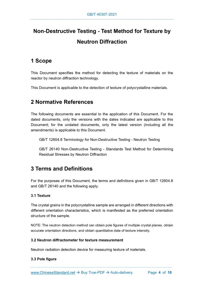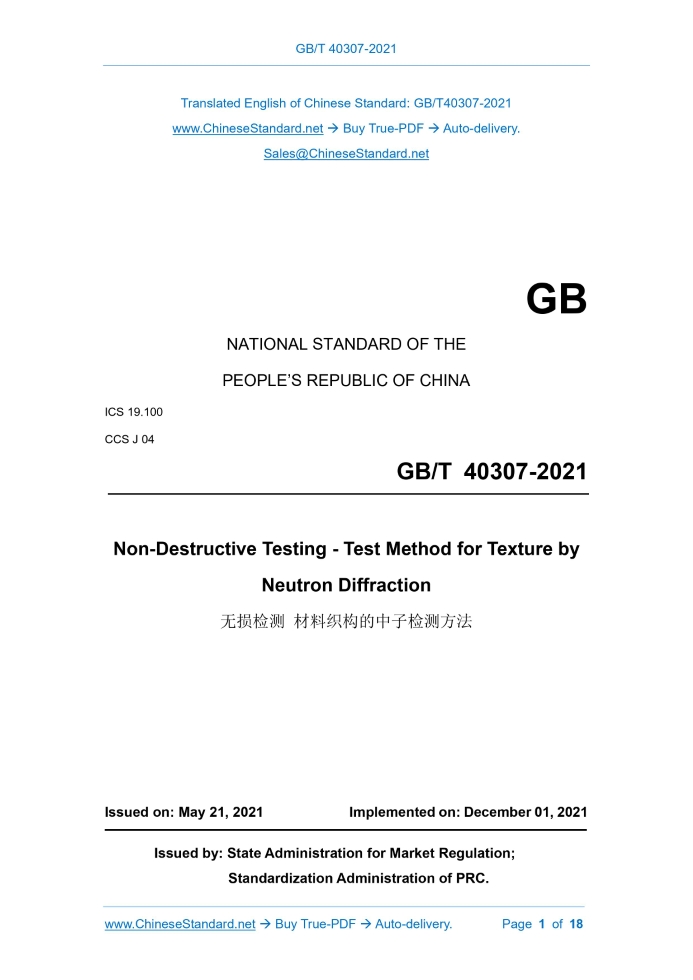 GB/T 40307-2021: Non-destructive testing - Test method for texture by neutron diffraction Delivery: 9 seconds. True-PDF full-copy in English & invoice will be downloaded + auto-delivered via email. See step-by-step procedure Status: Valid
