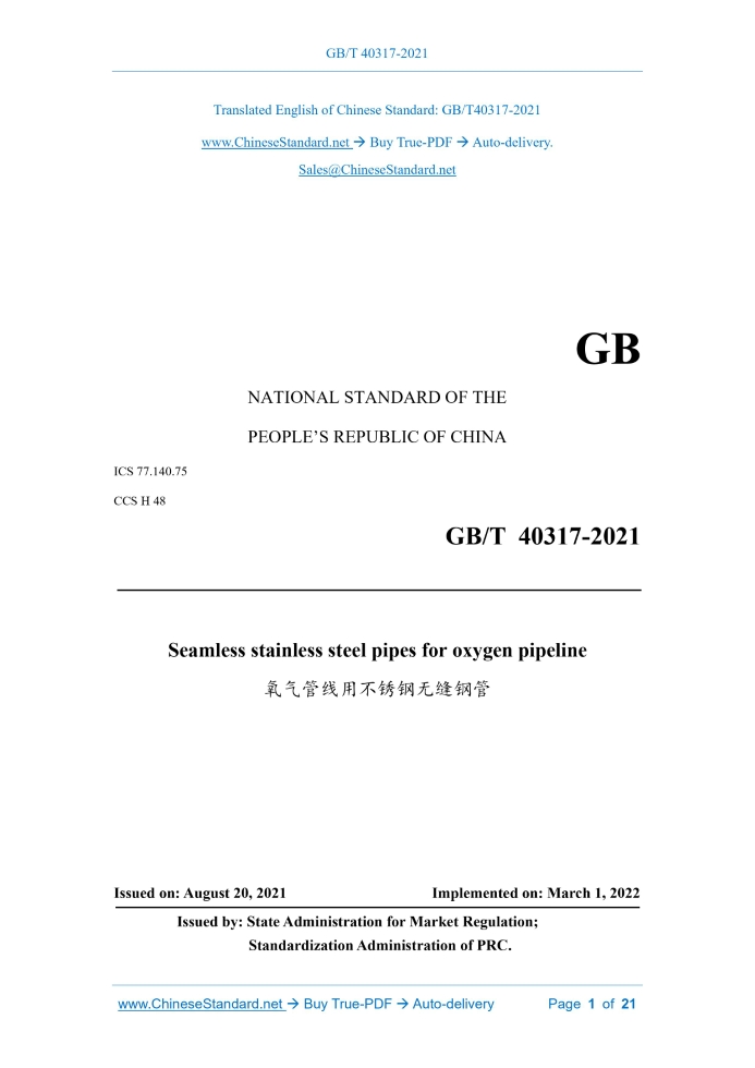 GB/T 40317-2021: Seamless stainless steel pipes for oxygen pipeline Delivery: 9 seconds. True-PDF full-copy in English & invoice will be downloaded + auto-delivered via email. See step-by-step procedure Status: Valid