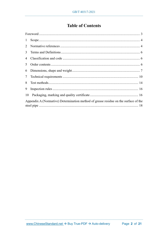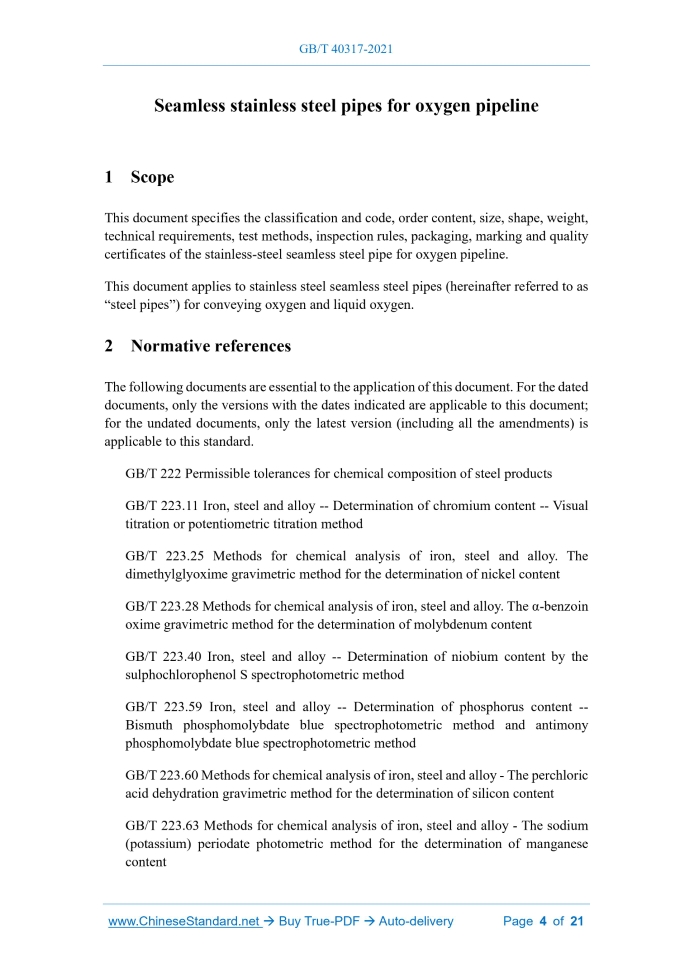 Similar standardsGB/T 40317-2021: Seamless stainless steel pipes for oxygen pipeline---This is an excerpt. Full copy of true-PDF in English version (including equations, symbols, images, flow-chart, tables, and figures etc.), auto-downloaded/delivered in 9 seconds, can be purchased online: https://www.ChineseStandard.net/PDF.aspx/GBT40317-2021NATIONAL STANDARD OF THE PEOPLE’S REPUBLIC OF CHINA ICS 77.140.75 CCS H 48 Seamless stainless steel pipes for oxygen pipeline ISSUED ON: AUGUST 20, 2021 IMPLEMENTED ON: MARCH 1, 2022 Issued by: State Administration for Market Regulation; Standardization Administration of PRC. Table of ContentsForeword ... 3 1 Scope ... 4 2 Normative references ... 4 3 Terms and Definitions ... 6 4 Classification and code ... 6 5 Order contents ... 6 6 Dimensions, shape and weight ... 7 7 Technical requirements ... 10 8 Test methods ... 14 9 Inspection rules ... 16 10 Packaging, marking and quality certificate ... 16 Appendix A (Normative) Determination method of grease residue on the surface of the steel pipe ... 18 Seamless stainless steel pipes for oxygen pipeline1 ScopeThis document specifies the classification and code, order content, size, shape, weight, technical requirements, test methods, inspection rules, packaging, marking and quality certificates of the stainless-steel seamless steel pipe for oxygen pipeline. This document applies to stainless steel seamless steel pipes (hereinafter referred to as “steel pipes”) for conveying oxygen and liquid oxygen.2 Normative referencesThe following documents are essential to the application of this document. For the dated documents, only the versions with the dates indicated are applicable to this document; for the undated documents, only the latest version (including all the amendments) is applicable to this standard. GB/T 222 Permissible tolerances for chemical composition of steel products GB/T 223.11 Iron, steel and alloy -- Determination of chromium content -- Visual titration or potentiometric titration method GB/T 223.25 Methods for chemical analysis of iron, steel and alloy. The dimethylglyoxime gravimetric method for the determination of nickel content GB/T 223.28 Methods for chemical analysis of iron, steel and alloy. The α-benzoin oxime gravimetric method for the determination of molybdenum content GB/T 223.40 Iron, steel and alloy -- Determination of niobium content by the sulphochlorophenol S spectrophotometric method GB/T 223.59 Iron, steel and alloy -- Determination of phosphorus content -- Bismuth phosphomolybdate blue spectrophotometric method and antimony phosphomolybdate blue spectrophotometric method GB/T 223.60 Methods for chemical analysis of iron, steel and alloy - The perchloric acid dehydration gravimetric method for the determination of silicon content GB/T 223.63 Methods for chemical analysis of iron, steel and alloy - The sodium (potassium) periodate photometric method for the determination of manganese content GB/T 223.84 Steel and iron -- Determination of titanium content -- Diantipyrylmethane spectrophotometric method GB/T 223.85 Steel and iron -- Determination of sulfur content -- Infrared absorption method after combustion in an induction furnace GB/T 223.86 Steel and iron -- Determination of total carbon content -- Infrared absorption method after combustion in an induction furnace GB/T 228.1 Metallic materials -- Tensile testing -- Part 1: Method of test at room temperature GB/T 229 Metallic materials -- Charpy pendulum impact test method GB/T 241 Metal materials -- Tube -- Hydrostatic pressure test GB/T 242 Metal materials -- Tube -- Drift-expending test GB/T 246 Metallic materials -- Tube -- Flattening test GB/T 1031 Geometrical Product Specifications (GPS) -- Surface texture: Profile method -- Surface roughness parameters and their values GB/T 2102 Acceptance, packing, marking and quality certification of steel pipe GB/T 2975 Steel and steel products -- Location and preparation of samples and test pieces for mechanical testing GB/T 5777-2019 Automated full peripheral ultrasonic testing of seamless and welded (except submerged arc-welded) steel tubes for the detection of longitudinal and/or transverse imperfections GB/T 7735-2016 Automated eddy current testing of seamless and welded (except submerged arc-welded) steel tubes for detection of imperfections GB/T 11170 Stainless steel -- Determination of multi-element contents -- Spark discharge atomic emission spectrometric method (Routine method) GB/T 17395 Dimensions, shapes, masses and tolerances of seamless steel tubes GB/T 20066 Steel and iron -- Sampling and preparation of samples for the determination of chemical composition GB/T 20123 Steel and iron -- Determination of total carbon and sulfur content Infrared absorption method after combustion in an induction furnace (routine method) a) When the wall thickness is not greater than 15 mm, it is 1.5 mm/m; b) When the wall thickness is greater than 15 mm, it is 2.0 mm/m. 6.4 Terminal outline 6.4.1 The end faces of both ends of the steel pipe shall be perpendicular to the axis of the steel pipe, and the burrs shall be removed from the incision. 6.4.2 According to the requirements of the buyer, after negotiation between the supplier and the buyer, and indicated in the contract, the two ends of the steel pipe can be processed with grooves, and the groove type can be determined by negotiation between the supplier and the buyer. 6.5 Out of roundness and uneven wall thickness The out-of-roundness and uneven-wall-thickness of the steel pipe shall not exceed 80% of the outer diameter tolerance and wall thickness tolerance, respectively. 6.6 Weight 6.6.1 Steel pipes shall be delivered by actual weight. According to the requirements of the buyer, after negotiation between the supplier and the buyer, and indicated in the contract, the steel pipe can be delivered according to the theoretical weight. 6.6.2 The theoretical weight per meter of the steel pipe is calculated according to for