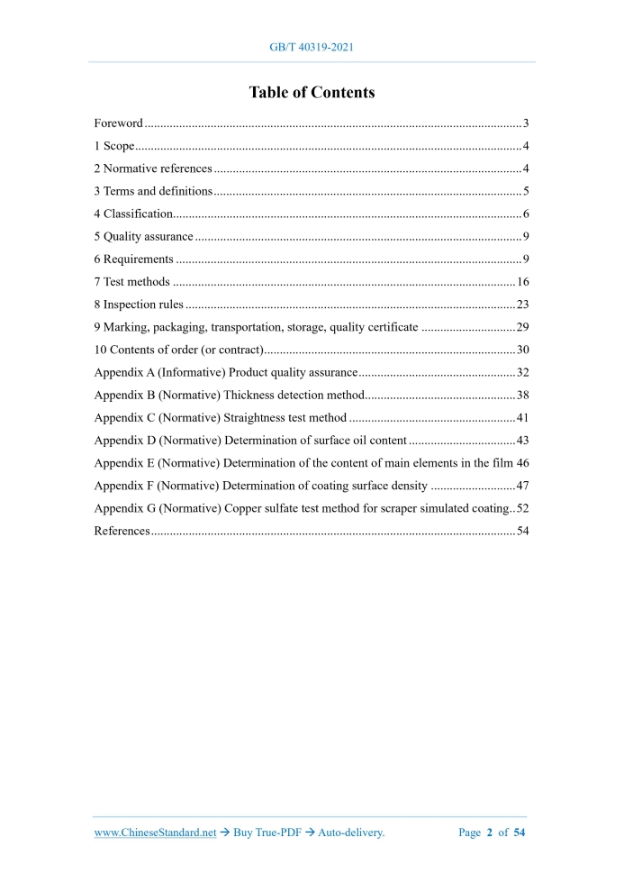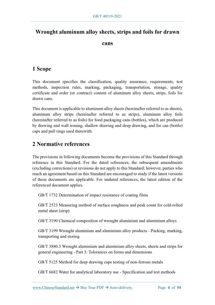 Similar standardsGB/T 40319-2021: Wrought aluminum alloy sheets, strips and foils for drawn cans---This is an excerpt. Full copy of true-PDF in English version (including equations, symbols, images, flow-chart, tables, and figures etc.), auto-downloaded/delivered in 9 seconds, can be purchased online: https://www.ChineseStandard.net/PDF.aspx/GBT40319-2021GB NATIONAL STANDARD OF THE PEOPLE’S REPUBLIC OF CHINA ICS 77.150.10 CCS H 61 Wrought aluminum alloy sheets, strips and foils for drawn cans Issued on. AUGUST 20, 2021 Implemented on. MARCH 01, 2022 Issued by. State Administration for Market Regulation; National Standardization Administration. Table of ContentsForeword... 3 1 Scope... 4 2 Normative references... 4 3 Terms and definitions... 5 4 Classification... 6 5 Quality assurance... 9 6 Requirements... 9 7 Test methods... 16 8 Inspection rules... 23 9 Marking, packaging, transportation, storage, quality certificate... 29 10 Contents of order (or contract)... 30 Appendix A (Informative) Product quality assurance... 32 Appendix B (Normative) Thickness detection method... 38 Appendix C (Normative) Straightness test method... 41 Appendix D (Normative) Determination of surface oil content... 43 Appendix E (Normative) Determination of the content of main elements in the film 46 Appendix F (Normative) Determination of coating surface density... 47 Appendix G (Normative) Copper sulfate test method for scraper simulated coating.. 52 References... 541 ScopeThis document specifies the classification, quality assurance, requirements, test methods, inspection rules, marking, packaging, transportation, storage, quality certificate and order (or contract) content of aluminum alloy sheets, strips, foils for drawn cans. This document is applicable to aluminum alloy sheets (hereinafter referred to as sheets), aluminum alloy strips (hereinafter referred to as strips), aluminum alloy foils (hereinafter referred to as foils) for food packaging cans (bottles), which are produced by drawing and wall ironing, shallow drawing and deep drawing, and for can (bottle) caps and pull rings used therewith.2 Normative referencesThe provisions in following documents become the provisions of this Standard through reference in this Standard. For the dated references, the subsequent amendments (excluding corrections) or revisions do not apply to this Standard; however, parties who reach an agreement based on this Standard are encouraged to study if the latest versions of these documents are applicable. For undated references, the latest edition of the referenced document applies. GB/T 1732 Determination of impact resistance of coating films GB/T 2523 Measuring method of surface roughness and peak count for cold-rolled metal sheet (strip) GB/T 3190 Chemical composition of wrought aluminium and aluminium alloys GB/T 3199 Wrought aluminium and aluminium alloy products - Packing, marking, transporting and storing GB/T 3880.3 Wrought aluminium and aluminium alloy sheets, sheets and strips for general engineering - Part 3.Tolerances on forms and dimensions GB/T 5125 Method for deep drawing cups testing of non-ferrous metals GB/T 6682 Water for analytical laboratory use - Specification and test methods GB/T 7999 Optical emission spectrometric analysis method of aluminum and aluminum alloys3 Terms and definitionsThe terms and definitions defined in GB/T 8005.1, GB/T 26492.3, GB/T 26492.4, as well as the following terms and definitions, apply to this document. 3.1 Drawing and wall ironing The process of forming deep concave parts by plastic flow of thin sheet/thick foil metal between dies and thinning of the wall thickness of the thin sheet. 3.2 Shallow drawing The process of forming shallow concave parts (the ratio of can height to can diameter is less than 1) by plastic flow of thin sheet/thick foil metal between dies (usually the wall thickness of thin sheet/thick foil does not become thinner). 3.3 Deep drawing The process of forming deep concave parts (the ratio of can height to can diameter is not less than 1) by multiple plastic flows of thin sheet metal between dies (usually the wall thickness of thin sheet does not become thinner).4 Classification4.1 Product use Products are divided into three categories according to their use. See Table 1 for product use and use code. 4.2 Designation, state, size specification The product designation, state, size specification and its corresponding use code are shown in Table 2.When the buyer needs other designations, states, size specifications, they shall be determined by negotiation between the supplier and the buyer and indicated in the order form (or contract). 4.3 Product surface type The product surface type, surface type code and its corresponding treatment process and use code are shown in Table 3.5 Quality assurance5.1 Food safety assurance 5.2 Product quality assurance For product quality assurance, refer to Appendix A.6 Requirements6.1 Chemical composition The chemical composition of 5151 designation shall comply with the provisions of Table 4; the chemical composition of other designations shall comply with the provisions of GB/T 3190. 6.2 Dimensional deviation 6.2.1 Thickness The thickness deviation of the product shall comply with the provisions of Table 5. 6.2.3 Length The allowable deviation of the length of the sheet shall be ; if the purchaser has special requirements for the allowable deviation of the length of the sheet, it shall be determined by negotiation between the supplier and the buyer and indicated in the order (or contract). 6.2.4 Diagonal The difference between the two diagonal lengths of the sheet shall not exceed 2.0 mm. 6.2.7 Unevenness The unevenness of the product shall comply with the provisions of Table 7; if the purchaser has special requirements for unevenness, it shall be determined by negotiation between the supplier and the buyer and indicated in the order (or contract). 6.2.8 Straightness When strip and foil shapes are tested offline, the st