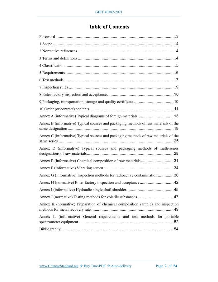 Similar standardsGB/T 40382-2021: Recycling materials for wrought aluminium alloys---This is an excerpt. Full copy of true-PDF in English version (including equations, symbols, images, flow-chart, tables, and figures etc.), auto-downloaded/delivered in 9 seconds, can be purchased online: https://www.ChineseStandard.net/PDF.aspx/GBT40382-2021GB NATIONAL STANDARD OF THE PEOPLE’S REPUBLIC OF CHINA ICS 77.120.10 CCS H 61 Recycling materials for wrought aluminium alloys Issued on. AUGUST 20, 2021 Implemented on. MARCH 01, 2022 Issued by. State Administration for Market Regulation; Standardization Administration of the People's Republic of China. Table of ContentsForeword... 3 1 Scope... 4 2 Normative references... 4 3 Terms and definitions... 4 4 Classification... 5 5 Requirements... 6 6 Test methods... 7 7 Inspection rules... 9 8 Enter-factory inspection and acceptance... 10 9 Packaging, transportation, storage and quality certificate... 10 10 Order (or contract) contents... 11 Annex A (informative) Typical diagrams of foreign materials... 13 Annex B (informative) Typical sources and packaging methods of raw materials of the same designation... 19 Annex C (informative) Typical sources and packaging methods of raw materials of the same series... 25 Annex D (informative) Typical sources and packaging methods of multi-series designations of raw materials... 28 Annex E (informative) Chemical composition of raw materials... 31 Annex F (informative) Vibrating screen... 34 Annex G (informative) Inspection methods for radioactive contamination... 36 Annex H (normative) Enter-factory inspection and acceptance... 42 Annex I (informative) Hydraulic single shaft shredder... 45 Annex J (normative) Testing methods for volatile substances... 47 Annex K (normative) Preparation of chemical composition samples and inspection methods for metal recovery rate... 49 Annex L (informative) General requirements and test methods for portable spectrometer equipment... 52 Bibliography... 541 ScopeThis document specifies the classification, requirements, test methods, inspection rules, enter-factory inspection and acceptance, packaging, transportation, storage, quality certificate and order (or contract) contents of recycling materials for wrought aluminium alloys. This document applies to the wrought aluminium alloy raw materials for melting and casting (hereinafter referred to as raw materials) obtained after recycled aluminium is sorted and processed.2 Normative referencesThe following referenced documents are indispensable for the application of this document. For dated references, only the edition cited applies. For undated references, the latest edition of the referenced document (including any amendments) applies. GB/T 7999, Optical emission spectrometric analysis method of aluminium and aluminium alloys GB/T 8005.1, Aluminium and aluminium alloy terms and definitions -- Part 1. Product and method of processing and treatment GB/T 8170, Rules of rounding off for numerical values and expression and judgement of limiting values GB/T 17432, Methods of sampling for analyzing the chemical composition of wrought aluminium and aluminium alloys3 Terms and definitionsFor the purposes of this document, the terms and definitions defined in GB/T 8005.1 as well as the followings apply. 3.1 recycling materials for wrought aluminium alloys The recycled aluminium is processed by sorting and other processes to obtain the deformed aluminium alloy raw material for melting and casting that meets the relevant requirements of this document. 3.3 volatile substance A substance that can be separated from raw materials by appropriate heating at a temperature below the melting point of the metal. 3.4 metal recovery rate The proportion of aluminium alloy produced after the raw materials are pretreated and smelted according to the methods specified in this document, expressed as mass fraction.4 Classification4.1 The raw material category, raw material description, raw material source, ingredient type and raw material packaging method are shown in Table 1. 4.2 The size specifications and net weight of the recycled aluminium ingots shall be determined by negotiation between the supplier and the purchaser. The size specifications and net weight of other raw materials are shown in Table 2.5 Requirements5.1 Foreign material content 5.1.1 The raw materials shall not be mixed with flammable materials, or explosives such as abandoned bombs and shells. 5.1.4 The mass fraction of the material block covered with organic polymer coating on the surface shall be less than 5%. 5.2 Fracture structure of recycled aluminium ingot The fracture structure of the recycled aluminium ingot shall be dense and shall not contain slag or foreign materials.6 Test methods6.1 Foreign material content 6.1.1 General inspection 6.1.1.1 Compacted packages/blocks Observe whether there are foreign materials inside the compacted packages/blocks. 6.1.2 Arbitration test 6.1.2.1 Weigh the mass of the sample and record it as m. 6.1.2.2 Manually sort out the blocks with organic polymer coating on the surface, weigh them, and record them as m1. 6.1.2.5 Calculate the powder mass fraction wF according to formula (2). The value is expressed in %. The calculation result is expressed to one decimal place. Round off according to the provisions of GB/T 8170. 6.1.2.6 Carefully sort out the foreign materials such as wood, paper, plastic, rubber, glass, stone, textiles, etc. by hand. If the sample is too large or if it is suspected that there are foreign materials embedded in it, it shall be broken and the embedded foreign materials shall be separated mechanically. 6.3 Radioactive contaminants For radioactive contaminant testing, see Annex G.7 Inspection rules7.1 Inspection and acceptance The supplier shall inspect the product before it leaves the factory. Ensure that the product quality complies with the provisions of this document and the order (or contract). Fill in the quality certificate.