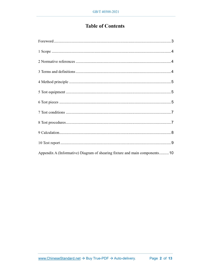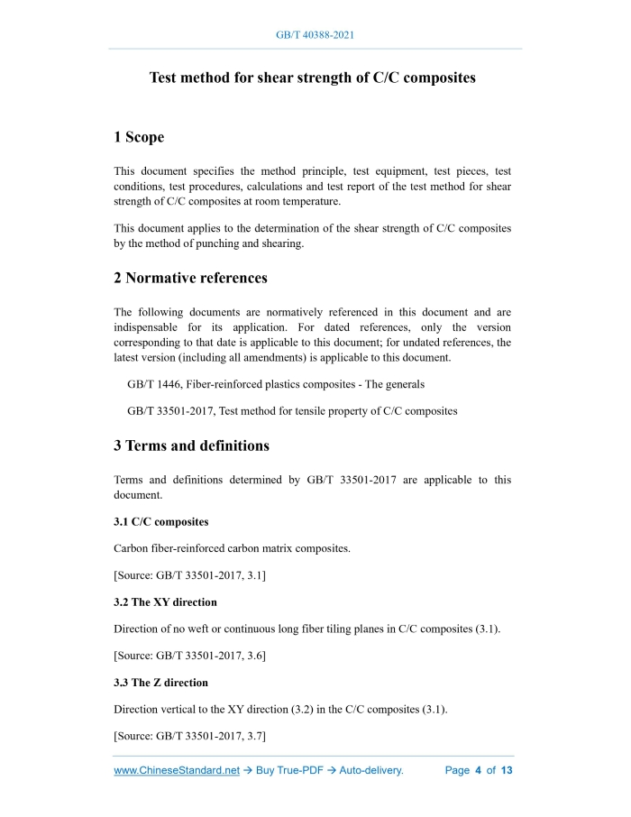 Similar standardsGB/T 40388-2021: Test method for shear strength of C/C composites---This is an excerpt. Full copy of true-PDF in English version (including equations, symbols, images, flow-chart, tables, and figures etc.), auto-downloaded/delivered in 9 seconds, can be purchased online: https://www.ChineseStandard.net/PDF.aspx/GBT40388-2021GB NATIONAL STANDARD OF THE PEOPLE’S REPUBLIC OF CHINA ICS 83.120 CCS Q 23 Test method for shear strength of C/C composites ISSUED ON: AUGUST 20, 2021 IMPLEMENTED ON: MARCH 01, 2022 Issued by: State Administration for Market Regulation; Standardization Administration of the People’s Republic of China. Table of ContentsForeword ... 3 1 Scope ... 4 2 Normative references ... 4 3 Terms and definitions ... 4 4 Method principle ... 5 5 Test equipment ... 5 6 Test pieces ... 5 7 Test conditions ... 7 8 Test procedures ... 7 9 Calculation ... 8 10 Test report ... 9 Appendix A (Informative) Diagram of shearing fixture and main components ... 10 Test method for shear strength of C/C composites1 ScopeThis document specifies the method principle, test equipment, test pieces, test conditions, test procedures, calculations and test report of the test method for shear strength of C/C composites at room temperature. This document applies to the determination of the shear strength of C/C composites by the method of punching and shearing.2 Normative referencesThe following documents are normatively referenced in this document and are indispensable for its application. For dated references, only the version corresponding to that date is applicable to this document; for undated references, the latest version (including all amendments) is applicable to this document. GB/T 1446, Fiber-reinforced plastics composites - The generals GB/T 33501-2017, Test method for tensile property of C/C composites3 Terms and definitionsTerms and definitions determined by GB/T 33501-2017 are applicable to this document. 3.1 C/C composites Carbon fiber-reinforced carbon matrix composites. [Source: GB/T 33501-2017, 3.1] 3.2 The XY direction Direction of no weft or continuous long fiber tiling planes in C/C composites (3.1). [Source: GB/T 33501-2017, 3.6] 3.3 The Z direction Direction vertical to the XY direction (3.2) in the C/C composites (3.1). [Source: GB/T 33501-2017, 3.7] Valid samples in each group shall be no less than 5.7 Test conditions7.1 Test environment The test environment shall meet the laboratory standard environment specified in GB/T 1446. 7.2 Sample state adjustment Before the test, the sample shall be placed at least 24 h under the condition of laboratory standard environment.8 Test procedures8.1 Check the appearance of the sample according to the provisions of GB/T 1446; check the number and direction of each sample. 8.2 Adjust the state of the sample according to the provisions of 7.2. 8.3 After the sample state adjustment, measure the sample thickness h at four positions in the direction of 90° to each other, at the diameter of 25 mm of the sample, accurate to 0.01 mm; take the arithmetic mean of the four measurement results. Measure the diameter d at any two positions of the inner ring clamping block on the fixture, accurate to 0.02 mm; take the arithmetic mean of the two measurement results. The schematic diagram of the shearing fixture assembly is shown in Figure 3. 8.4 Fix the pin shaft on the force acting platform; respectively insert the upper inner ring clamping block, upper outer ring, sample and lower inner ring clamping block into the pin shaft in sequence; use the gasket and the sample clamping nut to fasten the sample in the upper and lower inner ring clamping blocks. The tightening torque is 1 N·m [see Figure 3a)]. 8.5 Put the combination of the upper and lower inner ring clamping blocks of the sample into the lower outer ring of the test fixture, where the upper outer ring is connected to the lower outer ring through the clamp screw [see Figure 3b)], and the tightening torque of the screw is 1 N·m. The sample installation is then completed [see Figure 3c)]. 8.6 Center the test fixture on the compression platform of the testing machine; continuously apply a compressive load to the sample at a loading rate of 2 mm/min until the sample fails or the load drops to 30% of the maximum load; continuously measure the load-displacement data; record the maximum load. Pmax – maximum load before failure, in Newtons (N); d – diameter of the upper inner ring clamping block of the fixture, in millimeters (mm); h – sample thickness, in millimeters (mm). 9.2 Calculate the arithmetic mean, standard deviation and dispersion coefficient according to GB/T 1446.10 Test reportThe test report generally includes the following contents: a) name of the test item and number of this document; b) test time, place and test environmental conditions; c) sample source, material variety and specification; d) sample number, size, sample direction and quantity; e) types and specifications of test equipment and instruments; f) loading rate; g) load-displacement curve for each sample; h) the measured value of each sample, the mean, standard deviation and dispersion coefficient of each group of samples; i) test personnel, date and others. ......Source: Above contents are excerpted from the full-copy PDF -- translated/reviewed by: www.ChineseStandard.net / Wayne Zheng et al. Tips & Frequently Asked Questions:Question 1: How long will the true-PDF of English version of GB/T 40388-2021 be delivered?Answer: The full copy PDF of English version of GB/T 40388-2021 can be downloaded in 9 seconds, and it will also be emailed to you in 9 seconds (double mechanisms to ensure the delivery reliably), with PDF-invoice.Question 2: Can I share the purchased PDF of GB/T 40388-2021_English with my colleagues?Answer: Yes. The purchased PDF of GB/T 40388-2021_English will be deemed to be sold to your employer/organization who actually paid for it, including your colleagues and your employer's intranet.Qu