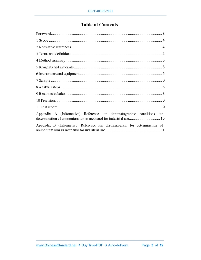 Similar standardsGB/T 40395-2021: Determination of ammonium in methanol for industrial use - Ion chromatography---This is an excerpt. Full copy of true-PDF in English version (including equations, symbols, images, flow-chart, tables, and figures etc.), auto-downloaded/delivered in 9 seconds, can be purchased online: https://www.ChineseStandard.net/PDF.aspx/GBT40395-2021GB NATIONAL STANDARD OF THE PEOPLE’S REPUBLIC OF CHINA ICS 71.080.60 CCS G 16 Determination of ammonium in methanol for industrial use - Ion chromatography ISSUED ON: AUGUST 20, 2021 IMPLEMENTED ON: MARCH 01, 2022 Issued by: State Administration for Market Regulation; Standardization Administration of the People’s Republic of China. Table of ContentsForeword ... 3 1 Scope ... 4 2 Normative references ... 4 3 Terms and definitions ... 4 4 Method summary ... 5 5 Reagents and materials ... 5 6 Instruments and equipment ... 6 7 Sample ... 6 8 Analysis steps ... 6 9 Result calculation ... 8 10 Precision ... 8 11 Test report ... 9 Appendix A (Informative) Reference ion chromatographic conditions for determination of ammonium ion in methanol for industrial use... 10 Appendix B (Informative) Reference ion chromatogram for determination of ammonium ions in methanol for industrial use ... 11 Determination of ammonium in methanol for industrial use - Ion chromatography Warning – This document is not intended to explain all safety issues related to its use; the user is responsible for taking appropriate safety and health measures, which shall also comply with the relevant national regulations.1 ScopeThis document specifies the method for the determination of free ammonia and ammonium ions in methanol for industrial use by ion chromatography. This document applies to the determination of free ammonia and ammonium ions in methanol for industrial use. When the injection volume is 50 μL, the lower limit of determination is 0.01 mg/L.2 Normative referencesThe following documents are normatively referenced in this document and are indispensable for its application. For dated references, only the version corresponding to that date is applicable to this document; for undated references, the latest version (including all amendments) is applicable to this document. GB/T 3723, Sampling of chemical products for industrial use - Safety in sampling GB/T 6680, General rules for sampling liquid chemical products GB/T 8170, Rules of rounding off for numerical values & expression and judgment of limiting values GB/T 33087, Ultra pure water for instrumental analysis specification and test methods GB/T 34672, Chemical reagent - General rules for the ion chromatography3 Terms and definitionsNo terms and definitions need to be defined in this document.4 Method summaryWhen the samples enter the ion chromatography column with the eluent for exchange separation, use a conductivity detector to measure the ammonium ion content. Use the retention time to determine quality, and the working curve method to determine quantity.5 Reagents and materialsUnless otherwise stated, use only guaranteed reagents in the analysis. 5.1 Water: in accordance with GB/T 33087. 5.2 Methanol: chromatographic pure, ammonium content less than 0.01 mg/L. Note: Preparation method of ammonium-free methanol reagent – take 2 L of methanol; add 15 mL of 1.0 mol/L sulfuric acid solution; distill; discard 100 mL of distillate before and after; take the middle distillate as ammonium-free methanol reagent. 5.3 Nitrogen: volume fraction not less than 99.999%. 5.4 Ammonium ion standard substance: 1 000 mg/L, certified reference material. 5.5 Ammonium ion standard working solution: 50.00 mg/L. Pipette 5.00 mL of ammonium ion standard substance (see 5.4) to a 100 mL volumetric flask; use water (see 5.1) to dilute to a constant volume. 5.6 Methanol solution: volume fraction 5%. 5.7 Methane sulfonic acid eluent stock solution: 1.0 mol/L. 5.8 Methane sulfonic acid eluent working solution: 2.0 mmol/L. Pipette 4.00 mL of methane sulfonic acid eluent stock solution (see 5.7) into a 2 000 mL volumetric flask; use water (see 5.1) to dilute to a constant volume. Prepare before use. Note: The eluent is prepared according to the working conditions of different chromatographic columns. The preparation method of the eluent given above is for reference only. 8.1.1 Set the instrument parameters with reference to Table A.1 – Reference ion chromatogram for determination of ammonium ions in methanol for industrial use by isocratic elution – in Appendix A. 8.1.2 Respectively pipette 0 mL, 0.10 mL, 0.20 mL, 0.40 mL, 1.00 mL, 2.00 mL, 4.00 mL of ammonium ion standard working solution (see 5.5) into 100 mL volumetric flasks; use methanol solution (see 5.6) to dilute and fix volume in turn, to obtain the ammonium ion series standard samples; measure through the sample introduction system. Refer to Figure B.1 in Appendix B for the reference ion chromatogram. Note: When the sample contains calcium and magnesium ions, set the instrument parameters with reference to Table A.1 – Reference ion chromatographic conditions for determination of ammonium ions in methanol for industrial use – in Appendix A. For the reference ion chromatogram, see Figure B.2 in Appendix B. 8.1.3 Take the ammonium ion mass concentration as the abscissa and the corresponding peak area after deducting the blank as the ordinate, to draw a standard working curve, as shown in Formula (1). Where: Ai – peak area of ammonium ion in the standard solution i, in micro Siemens minute (μS•min); ρi – mass concentration of ammonium ions in the standard solution i, in milligrams per liter (mg/L); a – quadratic coefficient of the regression equation; b – linear coefficient of the regression equation; c – constant term of the regression equation. 8.2 Sample determination 8.2.1 Sample pretreatment 8.2.1.1 According to the column efficiency of the ion chromatography and the pressure resistance of the system, use water (see 5.1) to dilute the
