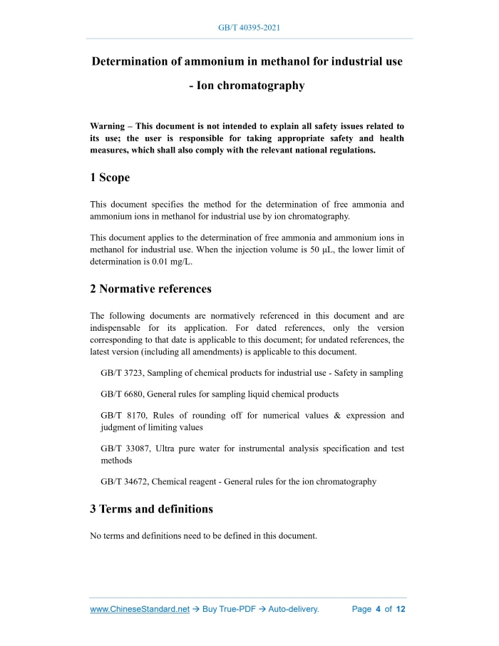 GB/T 40395-2021: Determination of ammonium in methanol for industrial use - Ion chromatography Delivery: 9 seconds. True-PDF full-copy in English & invoice will be downloaded + auto-delivered via email. See step-by-step procedure Status: Valid