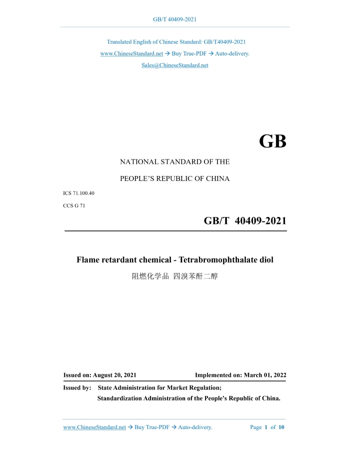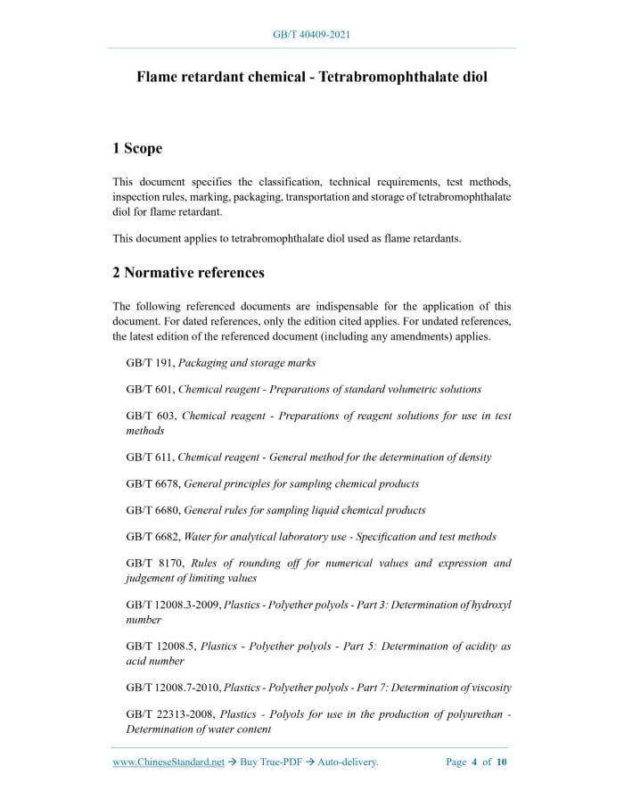 GB/T 40409-2021: Flame retardant chemical - Tetrabromophthalate diol Delivery: 9 seconds. True-PDF full-copy in English & invoice will be downloaded + auto-delivered via email. See step-by-step procedure Status: Valid