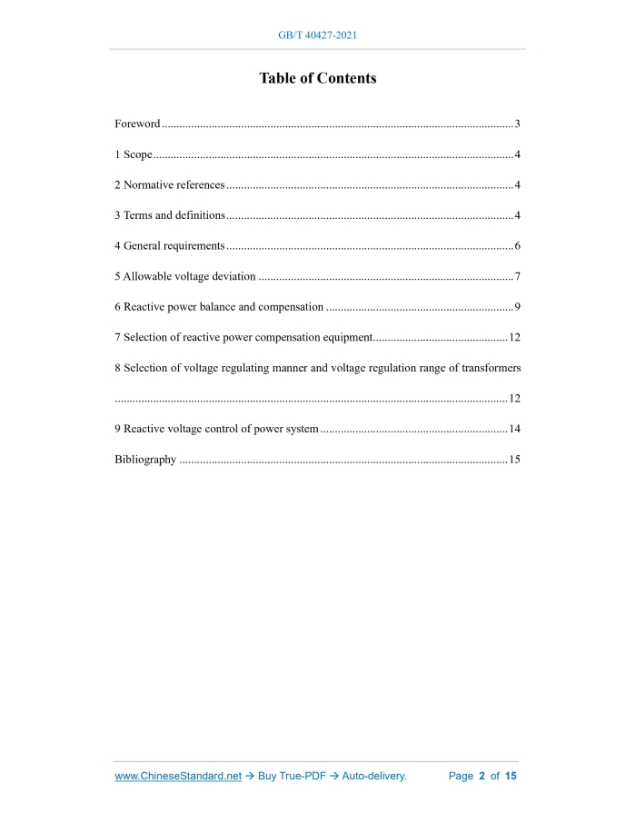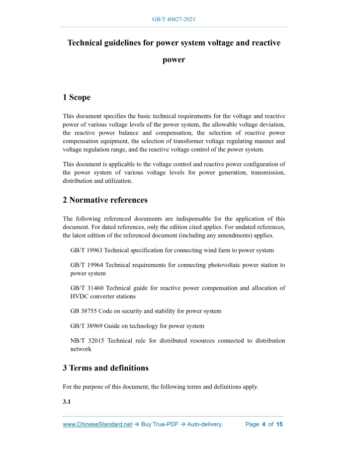 Similar standardsGB/T 40427-2021: Technical guidelines for power system voltage and reactive power---This is an excerpt. Full copy of true-PDF in English version (including equations, symbols, images, flow-chart, tables, and figures etc.), auto-downloaded/delivered in 9 seconds, can be purchased online: https://www.ChineseStandard.net/PDF.aspx/GBT40427-2021GB NATIONAL STANDARD OF THE PEOPLE’S REPUBLIC OF CHINA ICS 29.020 CCS F 21 Technical guidelines for power system voltage and reactive power ISSUED ON: OCTOBER 11, 2021 IMPLEMENTED ON: MAY 01, 2022 Issued by: State Administration for Market Regulation; Standardization Administration of the People’s Republic of China. Table of ContentsForeword ... 3 1 Scope ... 4 2 Normative references ... 4 3 Terms and definitions ... 4 4 General requirements ... 6 5 Allowable voltage deviation ... 7 6 Reactive power balance and compensation ... 9 7 Selection of reactive power compensation equipment ... 12 8 Selection of voltage regulating manner and voltage regulation range of transformers ... 12 9 Reactive voltage control of power system ... 14 Bibliography ... 15 Technical guidelines for power system voltage and reactive power1 ScopeThis document specifies the basic technical requirements for the voltage and reactive power of various voltage levels of the power system, the allowable voltage deviation, the reactive power balance and compensation, the selection of reactive power compensation equipment, the selection of transformer voltage regulating manner and voltage regulation range, and the reactive voltage control of the power system. This document is applicable to the voltage control and reactive power configuration of the power system of various voltage levels for power generation, transmission, distribution and utilization.2 Normative referencesThe following referenced documents are indispensable for the application of this document. For dated references, only the edition cited applies. For undated references, the latest edition of the referenced document (including any amendments) applies. GB/T 19963 Technical specification for connecting wind farm to power system GB/T 19964 Technical requirements for connecting photovoltaic power station to power system GB/T 31460 Technical guide for reactive power compensation and allocation of HVDC converter stations GB 38755 Code on security and stability for power system GB/T 38969 Guide on technology for power system NB/T 32015 Technical rule for distributed resources connected to distribution network3 Terms and definitionsFor the purpose of this document, the following terms and definitions apply. 3.1 reverse voltage regulating manner The voltage regulating manner in which the voltage of the central point is reversely regulated with the increase or decrease of the load, that is, the voltage of the central point is increased when the load is large, and the voltage of the central point is decreased when the load is small. 3.8 balance of reactive Under a certain system voltage level, the state in which the reactive output is balanced with the reactive load of the reactive power source in the power system. 3.9 automatic voltage control; AVC Using computer system, communication network and controllable equipment, calculate the control strategy online according to the real-time operating conditions of the power grid, and automatically closed-loop control the reactive power and voltage regulation equipment, to achieve a reasonable reactive voltage distribution.4 General requirements4.1 The voltage of each voltage level node in the power system shall meet the requirements of allowable voltage deviation. 4.2 The reactive power compensation of the power grid shall meet the principle of hierarchical and on-site balancing under the highest and lowest load levels, shall be adjusted with the load (or voltage) changes, and shall avoid the transmission of reactive power through long-distance lines or multi-level transformers. 4.3 In the planning and design of the power system, it shall carry out the planning of reactive power compensation equipment/reactive power source, and reserve an appropriate margin. a) In the planning and design of power generation, transmission, distribution and utilization projects, it shall carry out special research on reactive voltage; if necessary, it shall carry out calculation and analysis of overvoltage, including power frequency overvoltage, operating overvoltage, resonance overvoltage, submerged supply current and recovery voltage, etc. b) In the planning and design of the receiving end system, it shall strengthen the network connection of the highest-level voltage; it shall be connected to a power source with sufficient capacity and support and adjustment capabilities to ensure the flexibility of the voltage support and operation of the receiving end system; it shall configure sufficient reactive power compensation capacity. c) For DC drop points, load concentration areas and channels such as new energy centralized transmission, it shall reasonably configure dynamic var compensation equipment. d) For the configuration of reactive power compensation equipment and the selection of equipment type, it shall be compared technically and economically. For power grids of 220 kV and above, it should consider the need to improve the stability of the power system. 4.4 There shall be sufficient reactive power reserve for the operation of the power system to ensure the normal operation of the power system and the voltage stability after accident. 4.5 The synchronous generator or synchronous phase conditioner shall operate with automatic regulation excitation (including forced excitation), with sufficient phase advance and retardation capability, and maintain the stability of its operation. 4.6 The new energy station shall have reactive power regulation capability and automatic voltage control function, and maintain the stability of its operation. In principle, the reactive power regulation capa