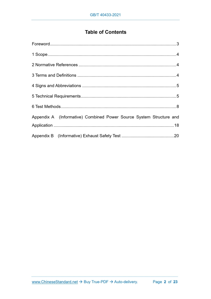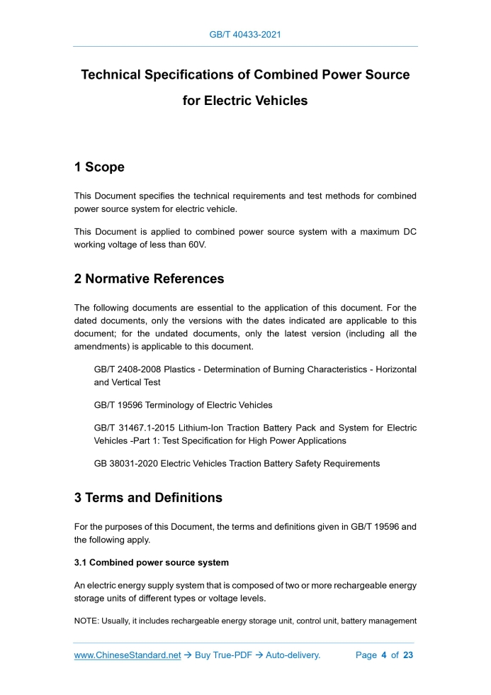 Similar standardsGB/T 40433-2021: Technical specifications of combined power source for electric vehicles---This is an excerpt. Full copy of true-PDF in English version (including equations, symbols, images, flow-chart, tables, and figures etc.), auto-downloaded/delivered in 9 seconds, can be purchased online: https://www.ChineseStandard.net/PDF.aspx/GBT40433-2021GB NATIONAL STANDARD OF THE PEOPLE’S REPUBLIC OF CHINA ICS 43.080 CCS T 47 Technical Specifications of Combined Power Source for Electric Vehicles ISSUED ON: AUGUST 20, 2021 IMPLEMENTED ON: MARCH 01, 2022 Issued by: State Administration for Market Regulation; Standardization Administration of PRC. Table of ContentsForeword ... 3 1 Scope ... 4 2 Normative References ... 4 3 Terms and Definitions ... 4 4 Signs and Abbreviations ... 5 5 Technical Requirements ... 5 6 Test Methods ... 8 Appendix A (Informative) Combined Power Source System Structure and Application ... 18 Appendix B (Informative) Exhaust Safety Test ... 20 Technical Specifications of Combined Power Source for Electric Vehicles1 ScopeThis Document specifies the technical requirements and test methods for combined power source system for electric vehicle. This Document is applied to combined power source system with a maximum DC working voltage of less than 60V.2 Normative ReferencesThe following documents are essential to the application of this document. For the dated documents, only the versions with the dates indicated are applicable to this document; for the undated documents, only the latest version (including all the amendments) is applicable to this document. GB/T 2408-2008 Plastics - Determination of Burning Characteristics - Horizontal and Vertical Test GB/T 19596 Terminology of Electric Vehicles GB/T 31467.1-2015 Lithium-Ion Traction Battery Pack and System for Electric Vehicles -Part 1: Test Specification for High Power Applications GB 38031-2020 Electric Vehicles Traction Battery Safety Requirements3 Terms and DefinitionsFor the purposes of this Document, the terms and definitions given in GB/T 19596 and the following apply. 3.1 Combined power source system An electric energy supply system that is composed of two or more rechargeable energy storage units of different types or voltage levels. NOTE: Usually, it includes rechargeable energy storage unit, control unit, battery management 5.1.2 Unless otherwise required, the combined power source system shall be able to work normally under the following environmental conditions: a) Ambient temperature: -30°C ~50°C; b) Relative humidity: 10%~95%; c) Air pressure: 61.6kPa~106kPa. 5.1.3 There shall be no obvious scratches, burrs, deformation, rust, cracks and other defects in the shell of each component of the combined power source system. 5.1.4 The product information shall be clearly and firmly marked on the shell of each component of the combined power source system. 5.2 Functional requirements 5.2.1 The combined power source system shall have charging- and discharging- functions, which can be used to store the electric energy fed back during the braking process of the whole vehicle and provide auxiliary electric energy for the power output of the whole vehicle. 5.2.2 The main power source should have an independent battery management system for monitoring the power supply voltage, current, temperature and other parameters, and realize the functions of fault diagnosis, information recording and fault handling. 5.3 Safety requirements 5.3.1 Working voltage The combined power source system shall meet the maximum operating voltage requirements of Class A voltage circuits. 5.3.2 Electrical connection 5.3.2.1 The electrical interface shall adopt the error-proof design to ensure that the components can be connected correctly. 5.3.2.2 The electrical connection shall be firm and reliable, and there should be no problems such as deformation, looseness, or falling off. 5.3.3 Mechanical connection 5.3.3.1 The components of the combined power source supply system should be arranged in locations that are not susceptible to collision or other mechanical damage. 5.3.3.2 The mechanical connection shall be firm and reliable, and there should be no problems such as deformation, looseness, falling off, etc. 5.3.4 Flame retardant properties The shell of each component of the combined power source system shall meet the Level V-0 requirements specified in GB/T 2408-2008. For combined power source systems containing 12V lead-acid batteries, the shells of components other than 12V lead-acid batteries shall meet the Level V-0 requirements specified in GB/T 2408-2008. 5.3.5 Power safety 5.3.5.1 The safety of the main power source that provides energy to the vehicle power system shall meet the requirements of GB 38031-2020. 5.3.5.2 For the main power supply arranged in the passenger compartment, at least one of the following requirements shall be met: a) The main power source shall be equipped with an exhaust device, and when exhaust occurs, the gas is exported to the outside of the passenger compartment through the exhaust pipe of the whole vehicle; b) Carry out exhaust safety test in accordance with 6.4.2.2, and the exhaust composition and concentration shall not cause harm to passengers; c) The manufacturer shall provide safety documentation to prove that the main power exhaust shall not cause harm to passengers. 5.4 Electrical performance requirements 5.4.1 Capacity The combined power source system or main power source shall be tested in accordance with 6.5.1. The discharge capacity at -20°C shall be no less than 70% discharge capacity at the room temperature; the discharge capacity at 0°C shall be no less than 90% discharge capacity at the room temperature; and the discharge capacity at 40°C shall be no less than 95% discharge capacity at room temperature. 5.4.2 Power performance The combined power source system or main power source is tested in accordance with 6.5.2; and its maximum pulse charge and discharge rate for 10s a