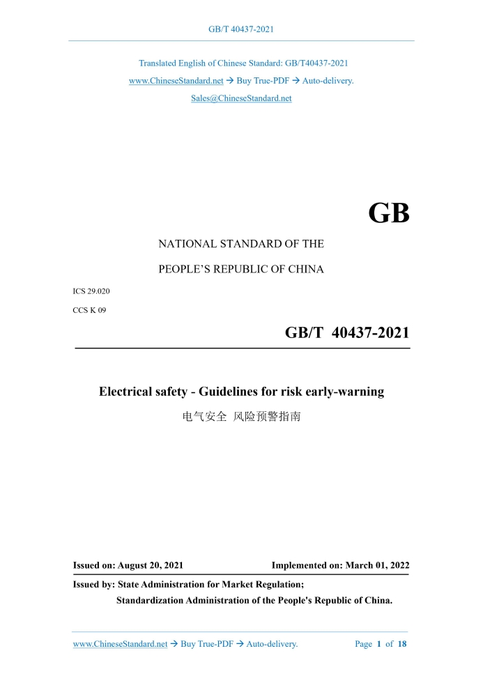 Similar standardsGB/T 40437-2021: Electrical safety - - Guidelines for risk early-warning---This is an excerpt. Full copy of true-PDF in English version (including equations, symbols, images, flow-chart, tables, and figures etc.), auto-downloaded/delivered in 9 seconds, can be purchased online: https://www.ChineseStandard.net/PDF.aspx/GBT40437-2021NATIONAL STANDARD OF THE PEOPLE’S REPUBLIC OF CHINA ICS 29.020 CCS K 09 Electrical safety - Guidelines for risk early-warning Issued on: AUGUST 20, 2021 Implemented on: MARCH 01, 2022 Issued by. State Administration for Market Regulation; Standardization Administration of the People's Republic of China. Table of ContentsForeword... 4 Introduction... 5 1 Scope... 6 2 Normative references... 6 3 Terms and definitions... 6 4 General... 8 4.1 General principles... 8 4.2 Logical process... 8 5 Early-warning risk elements... 10 5.1 Principles for determining early-warning risk elements... 10 5.2 Sources of early-warning risk elements... 10 5.3 Influencing factors for early-warning risk elements... 11 5.4 Description of early-warning risk elements... 11 6 Monitoring of early-warning risk elements... 11 6.1 General principle... 11 6.2 Monitoring object... 12 6.3 Representation of monitoring object information... 12 6.4 Monitoring data management... 12 7 Rating of early-warning... 13 7.1 General principles... 13 7.2 Determination of risk index... 13 7.3 Determination of rating of early-warning... 14 8 Early-warning measures... 14 8.1 General principles... 14 8.2 Classification of early-warning measures... 15 8.3 Release of early-warning measures... 16 9 Early-warning assessment... 16 9.1 Overview... 16 9.2 Evaluation of early-warning risk elements... 16 9.3 Assessment of monitoring of early-warning risk elements... 16 9.4 Assessment of rating of early-warning... 17 9.5 Assessment of early-warning measures... 17 9.6 Assessment of early-warning systems... 17 Annex A (informative) Examples of hazards, hazardous situations and possible injuries due to temporality... 18 Electrical safety - Guidelines for risk early-warning1 ScopeThis document provides general principles and logical processes for early-warning of electrical safety risks. It gives the information on the determination of early-warning risk elements, the monitoring of early-warning risk elements, the determination of early-warning levels, early-warning measures and early-warning assessment. This document is applicable to electrical safety risk warning for electrical equipment and systems of which the AC rated voltage is 1000V and below, the DC rated voltage is 1500V and below.2 Normative referencesThe following referenced documents are indispensable for the application of this document. For dated references, only the edition cited applies. For undated references, the latest edition of the referenced document (including any amendments) applies. GB/T 4025-2010, Basic and safety principles for man-machine interface, marking and identification - Coding principles for indicators and actuators GB/T 4776-2017, Electrical safety terminology GB/T 22696 (all parts), Electrical equipment safety - Risk assessment and risk reduction GB/T 34924-2017, Guidelines for safety related risk assessment and risk reduction for low voltage equipment3 Terms and definitionsFor the purposes of this document, the terms and definitions defined in GB/T 4776- 2017, GB/T 22696 (all parts) as well as the followings apply. 3.1 early-warning The general term for activities that monitor and predict possible abnormal states or emergencies and issue alarms based on the regularity and experience of electrical safety risks, as well as the possible residual risks of electrical equipment and systems. 3.2 electrical safety risk early-warning system5 Early-warning risk elements5.1 Principles for determining early-warning risk elements The principles for determining early-warning risk elements include but are not limited to. - objective; - related; - systematic; - traceable; - Combination of qualitative and quantitative. 5.2 Sources of early-warning risk elements Based on historical data (such as hazard and accident records) and electrical safety risk assessment results, according to the principles of early-warning risk elements, the sources include but are not limited to the following. - Risk elements for electrical equipment and systems. ● Residual risks; ● Risks of failure of protective measures (for example, according to the protective measures taken by the user); ● Risks associated with using the information, such as risks not disclosed in the instructions. - Risk elements of the environment, such as the effect of changing environmental conditions on personnel and/or equipment. - Risk elements for personnel, such as moving within a non-moving range, not wearing or not properly wearing protective equipment, equipment that requires professional operation is operated by non-professionals without permission. - Risk elements of human-machine collaborative operation, such as the accuracy of information transmission. 5.3 Influencing factors for early-warning risk elements Early-warning risk elements are affected by the following factors. - Severity of the injury caused by the early-warning risk element. - Possibility that the early-warning risk element may cause injuries. ● Potential for exposure of personnel and/or electrical equipment and systems to hazardous situations; ● Probability of occurrence of a hazard; ● Possibility of technology and personnel to avoid or limit injury is affected by factors such as personnel skill level, safety knowledge, experience, and the speed at which injury occurs. 5.4 Description of early-warning risk elements The description of early-warning risk elements includes the description of basic information, trigger information and injury information, including. - Basic information is the information description of the normal state of electrical equipment and systems, environment, and personnel rela