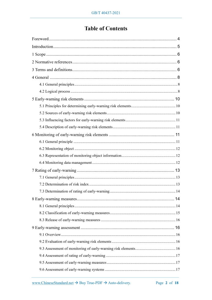 Similar standardsGB/T 40437-2021: Electrical safety - - Guidelines for risk early-warning---This is an excerpt. Full copy of true-PDF in English version (including equations, symbols, images, flow-chart, tables, and figures etc.), auto-downloaded/delivered in 9 seconds, can be purchased online: https://www.ChineseStandard.net/PDF.aspx/GBT40437-2021NATIONAL STANDARD OF THE PEOPLE’S REPUBLIC OF CHINA ICS 29.020 CCS K 09 Electrical safety - Guidelines for risk early-warning Issued on: AUGUST 20, 2021 Implemented on: MARCH 01, 2022 Issued by. State Administration for Market Regulation; Standardization Administration of the People's Republic of China. Table of ContentsForeword... 4 Introduction... 5 1 Scope... 6 2 Normative references... 6 3 Terms and definitions... 6 4 General... 8 4.1 General principles... 8 4.2 Logical process... 8 5 Early-warning risk elements... 10 5.1 Principles for determining early-warning risk elements... 10 5.2 Sources of early-warning risk elements... 10 5.3 Influencing factors for early-warning risk elements... 11 5.4 Description of early-warning risk elements... 11 6 Monitoring of early-warning risk elements... 11 6.1 General principle... 11 6.2 Monitoring object... 12 6.3 Representation of monitoring object information... 12 6.4 Monitoring data management... 12 7 Rating of early-warning... 13 7.1 General principles... 13 7.2 Determination of risk index... 13 7.3 Determination of rating of early-warning... 14 8 Early-warning measures... 14 8.1 General principles... 14 8.2 Classification of early-warning measures... 15 8.3 Release of early-warning measures... 16 9 Early-warning assessment... 16 9.1 Overview... 16 9.2 Evaluation of early-warning risk elements... 16 9.3 Assessment of monitoring of early-warning risk elements... 16 9.4 Assessment of rating of early-warning... 17 9.5 Assessment of early-warning measures... 17 9.6 Assessment of early-warning systems... 17 Annex A (informative) Examples of hazards, hazardous situations and possible injuries due to temporality... 18 Electrical safety - Guidelines for risk early-warning1 ScopeThis document provides general principles and logical processes for early-warning of electrical safety risks. It gives the information on the determination of early-warning risk elements, the monitoring of early-warning risk elements, the determination of early-warning levels, early-warning measures and early-warning assessment. This document is applicable to electrical safety risk warning for electrical equipment and systems of which the AC rated voltage is 1000V and below, the DC rated voltage is 1500V and below.2 Normative referencesThe following referenced documents are indispensable for the application of this document. For dated references, only the edition cited applies. For undated references, the latest edition of the referenced document (including any amendments) applies. GB/T 4025-2010, Basic and safety principles for man-machine interface, marking and identification - Coding principles for indicators and actuators GB/T 4776-2017, Electrical safety terminology GB/T 22696 (all parts), Electrical equipment safety - Risk assessment and risk reduction GB/T 34924-2017, Guidelines for safety related risk assessment and risk reduction for low voltage equipment3 Terms and definitionsFor the purposes of this document, the terms and definitions defined in GB/T 4776- 2017, GB/T 22696 (all parts) as well as the followings apply. 3.1 early-warning The general term for activities that monitor and predict possible abnormal states or emergencies and issue alarms based on the regularity and experience of electrical safety risks, as well as the possible residual risks of electrical equipment and systems. 3.2 electrical safety risk early-warning system5 Early-warning risk elements5.1 Principles for determining early-warning risk elements The principles for determining early-warning risk elements include but are not limited to. - objective; - related; - systematic; - traceable; - Combination of qualitative and quantitative. 5.2 Sources of early-warning risk elements Based on historical data (such as hazard and accident records) and electrical safety risk assessment results, according to the principles of early-warning risk elements, the sources include but are not limited to the following. - Risk elements for electrical equipment and systems. ● Residual risks; ● Risks of failure of protective measures (for example, according to the protective measures taken by the user); ● Risks associated with using the information, such as risks not disclosed in the instructions. - Risk elements of the environment, such as the effect of changing environmental conditions on personnel and/or equipment. - Risk elements for personnel, such as moving within a non-moving range, not wearing or not properly wearing protective equipment, equipment that requires professional operation is operated by non-professionals without permission. - Risk elements of human-machine collaborative operation, such as the accuracy of information transmission. 5.3 Influencing factors for early-warning risk elements Early-warning risk elements are affected by the following factors. - Severity of the injury caused by the early-warning risk element. - Possibility that the early-warning risk element may cause injuries. ● Potential for exposure of personnel and/or electrical equipment and systems to hazardous situations; ● Probability of occurrence of a hazard; ● Possibility of technology and personnel to avoid or limit injury is affected by factors such as personnel skill level, safety knowledge, experience, and the speed at which injury occurs. 5.4 Description of early-warning risk elements The description of early-warning risk elements includes the description of basic information, trigger information and injury information, including. - Basic information is the information description of the normal state of electrical equipment and systems, environment, and personnel rela
