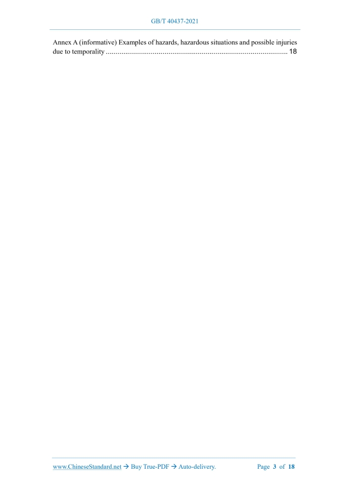 Similar standardsGB/T 40437-2021: Electrical safety - - Guidelines for risk early-warning---This is an excerpt. Full copy of true-PDF in English version (including equations, symbols, images, flow-chart, tables, and figures etc.), auto-downloaded/delivered in 9 seconds, can be purchased online: https://www.ChineseStandard.net/PDF.aspx/GBT40437-2021NATIONAL STANDARD OF THE PEOPLE’S REPUBLIC OF CHINA ICS 29.020 CCS K 09 Electrical safety - Guidelines for risk early-warning Issued on: AUGUST 20, 2021 Implemented on: MARCH 01, 2022 Issued by. State Administration for Market Regulation; Standardization Administration of the People's Republic of China. Table of ContentsForeword... 4 Introduction... 5 1 Scope... 6 2 Normative references... 6 3 Terms and definitions... 6 4 General... 8 4.1 General principles... 8 4.2 Logical process... 8 5 Early-warning risk elements... 10 5.1 Principles for determining early-warning risk elements... 10 5.2 Sources of early-warning risk elements... 10 5.3 Influencing factors for early-warning risk elements... 11 5.4 Description of early-warning risk elements... 11 6 Monitoring of early-warning risk elements... 11 6.1 General principle... 11 6.2 Monitoring object... 12 6.3 Representation of monitoring object information... 12 6.4 Monitoring data management... 12 7 Rating of early-warning... 13 7.1 General principles... 13 7.2 Determination of risk index... 13 7.3 Determination of rating of early-warning... 14 8 Early-warning measures... 14 8.1 General principles... 14 8.2 Classification of early-warning measures... 15 8.3 Release of early-warning measures... 16 9 Early-warning assessment... 16 9.1 Overview... 16 9.2 Evaluation of early-warning risk elements... 16 9.3 Assessment of monitoring of early-warning risk elements... 16 9.4 Assessment of rating of early-warning... 17 9.5 Assessment of early-warning measures... 17 9.6 Assessment of early-warning systems... 17 Annex A (informative) Examples of hazards, hazardous situations and possible injuries due to temporality... 18 Electrical safety - Guidelines for risk early-warning1 ScopeThis document provides general principles and logical processes for early-warning of electrical safety risks. It gives the information on the determination of early-warning risk elements, the monitoring of early-warning risk elements, the determination of early-warning levels, early-warning measures and early-warning assessment. This document is applicable to electrical safety risk warning for electrical equipment and systems of which the AC rated voltage is 1000V and below, the DC rated voltage is 1500V and below.2 Normative referencesThe following referenced documents are indispensable for the application of this document. For dated references, only the edition cited applies. For undated references, the latest edition of the referenced document (including any amendments) applies. GB/T 4025-2010, Basic and safety principles for man-machine interface, marking and identification - Coding principles for indicators and actuators GB/T 4776-2017, Electrical safety terminology GB/T 22696 (all parts), Electrical equipment safety - Risk assessment and risk reduction GB/T 34924-2017, Guidelines for safety related risk assessment and risk reduction for low voltage equipment3 Terms and definitionsFor the purposes of this document, the terms and definitions defined in GB/T 4776- 2017, GB/T 22696 (all parts) as well as the followings apply. 3.1 early-warning The general term for activities that monitor and predict possible abnormal states or emergencies and issue alarms based on the regularity and experience of electrical safety risks, as well as the possible residual risks of electrical equipment and systems. 3.2 electrical safety risk early-warning system5 Early-warning risk elements5.1 Principles for determining early-warning risk elements The principles for determining early-warning risk elements include but are not limited to. - objective; - related; - systematic; - traceable; - Combination of qualitative and quantitative. 5.2 Sources of early-warning risk elements Based on historical data (such as hazard and accident records) and electrical safety risk assessment results, according to the principles of early-warning risk elements, the sources include but are not limited to the following. - Risk elements for electrical equipment and systems. ● Residual risks; ● Risks of failure of protective measures (for example, according to the protective measures taken by the user); ● Risks associated with using the information, such as risks not disclosed in the instructions. - Risk elements of the environment, such as the effect of changing environmental conditions on personnel and/or equipment. - Risk elements for personnel, such as moving within a non-moving range, not wearing or not properly wearing protective equipment, equipment that requires professional operation is operated by non-professionals without permission. - Risk elements of human-machine collaborative operation, such as the accuracy of information transmission. 5.3 Influencing factors for early-warning risk elements Early-warning risk elements are affected by the following factors. - Severity of the injury caused by the early-warning risk element. - Possibility that the early-warning risk element may cause injuries. ● Potential for exposure of personnel and/or electrical equipment and systems to hazardous situations; ● Probability of occurrence of a hazard; ● Possibility of technology and personnel to avoid or limit injury is affected by factors such as personnel skill level, safety knowledge, experience, and the speed at which injury occurs. 5.4 Description of early-warning risk elements The description of early-warning risk elements includes the description of basic information, trigger information and injury information, including. - Basic information is the information description of the normal state of electrical equipment and systems, environment, and personnel rela