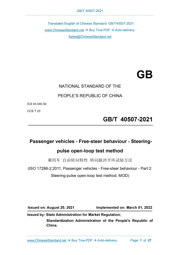 GB/T 40507-2021: Passenger cars - Free-steer behaviour - Steering-pulse open-loop test method Delivery: 9 seconds. True-PDF full-copy in English & invoice will be downloaded + auto-delivered via email. See step-by-step procedure Status: Valid
