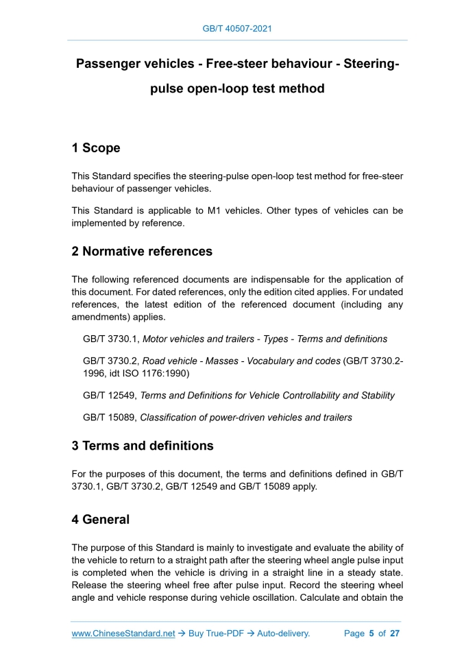 Similar standardsGB/T 40507-2021: Passenger cars - Free-steer behaviour - Steering-pulse open-loop test method---This is an excerpt. Full copy of true-PDF in English version (including equations, symbols, images, flow-chart, tables, and figures etc.), auto-downloaded/delivered in 9 seconds, can be purchased online: https://www.ChineseStandard.net/PDF.aspx/GBT40507-2021GB NATIONAL STANDARD OF THE PEOPLE’S REPUBLIC OF CHINA ICS 43.040.50 CCS T 23 Passenger vehicles - Free-steer behaviour - Steering- pulse open-loop test method (ISO 17288-2:2011, Passenger vehicles - Free-steer behaviour - Part 2: Steering-pulse open-loop test method, MOD) ISSUED ON: AUGUST 20, 2021 IMPLEMENTED ON: MARCH 01, 2022 Issued by: State Administration for Market Regulation; Standardization Administration of the People's Republic of China. Table of ContentsForeword ... 3 1 Scope ... 5 2 Normative references ... 5 3 Terms and definitions ... 5 4 General ... 5 5 Measuring variables ... 6 6 Instruments and equipment... 6 7 Test conditions ... 6 8 Test procedure ... 8 9 Data analysis ... 10 10 Test report ... 21 Annex A (normative) Test report -- Basic information ... 22 Annex B (normative) Test report -- Test conditions... 26 Passenger vehicles - Free-steer behaviour - Steering- pulse open-loop test method1 ScopeThis Standard specifies the steering-pulse open-loop test method for free-steer behaviour of passenger vehicles. This Standard is applicable to M1 vehicles. Other types of vehicles can be implemented by reference.2 Normative referencesThe following referenced documents are indispensable for the application of this document. For dated references, only the edition cited applies. For undated references, the latest edition of the referenced document (including any amendments) applies. GB/T 3730.1, Motor vehicles and trailers - Types - Terms and definitions GB/T 3730.2, Road vehicle - Masses - Vocabulary and codes (GB/T 3730.2- 1996, idt ISO 1176:1990) GB/T 12549, Terms and Definitions for Vehicle Controllability and Stability GB/T 15089, Classification of power-driven vehicles and trailers3 Terms and definitionsFor the purposes of this document, the terms and definitions defined in GB/T 3730.1, GB/T 3730.2, GB/T 12549 and GB/T 15089 apply.4 GeneralThe purpose of this Standard is mainly to investigate and evaluate the ability of the vehicle to return to a straight path after the steering wheel angle pulse input is completed when the vehicle is driving in a straight line in a steady state. Release the steering wheel free after pulse input. Record the steering wheel angle and vehicle response during vehicle oscillation. Calculate and obtain the 7.2.2 The atmospheric temperature is between 0°C~40°C. 7.3 Vehicle conditions 7.3.1 Vehicle inspection Before the test, determine the vehicle's four-wheel alignment parameters. Check, adjust and tighten the steering system and suspension system, and lubricate as required. The test can only be carried out if it is confirmed that the test vehicle has met the technical conditions stipulated by the manufacturer. The values of the relevant parameters measured and checked shall be recorded, see Annex A. 7.3.2 Test load The test vehicle load is the curb weight of the vehicle plus the driver and equipment not exceeding 150kg to the maximum allowable total mass of the vehicle. Do not exceed the maximum allowable axle load of the vehicle at the same time. The recommended test mass is the curb weight of the vehicle plus the weight of 1 driver, 1 tester and necessary equipment. 7.3.3 Test tires 7.3.3.1 The tires shall be installed on the test vehicle according to the vehicle manufacturer’s instructions. The tires shall be run-in at least 150km on the tested vehicle or similar vehicle. But ensure that there is no excessive use, such as emergency braking, rapid acceleration, sharp turns, road shoulders. After running-in, the tires shall be kept in the same position for testing. 7.3.3.2 The tire tread depth (including the entire width of the tire contacting the ground and the entire tire surface) shall be more than 90% of the initial tire tread depth. 7.3.3.3 The production date of the tire shall be recorded in the test conditions, see Annex B. The test tire shall not exceed one year from the production date when it is used for the test. 7.3.3.4 The tires shall be inflated at the pressure corresponding to the test environment temperature specified by the vehicle manufacturer. For tire pressure less than or equal to 250kPa, the error of cold inflation pressure shall be ±5kPa. When the tire pressure exceeds 250kPa, the error shall not exceed 2%. 7.3.3.5 The tire pressure and the depth of the tire tread pattern before warm-up shall be recorded in the test report, see Annex B. 7.3.3.6 In addition to the basic tire conditions, tests can also be carried out under other conditions. The specific details shall be recorded in the test report, see Annex B. 7.3.3.7 The dynamic balance of the wheel/tyre assembly shall be confirmed before the test.8 Test procedure8.1 Hot vehicle Before the test, drive 10km in a straight line at the test vehicle speed, or drive 500m at the corresponding vehicle speed with a lateral acceleration of 3m/s2 (one left turn and one right turn) to warm up the tires. 8.2 Test speed The standard value of the test vehicle speed is 100km/h. At least carry out three speed tests. Other vehicle speeds shall be determined at ±20km/h intervals with reference to the standard vehicle speed. During the test, the vehicle travels in a straight line at the test speed. Manual transmission vehicles use the highest gear. Automatic transmission vehicles use D gear. When the initial speed of the test does not exceed 100km/h, the error shall not exceed ±1km/h. When the initial test speed exceeds 100km/h, the error shall not exceed ±2km/h. Keep the accelerator pedal position unchanged during the test. 8.3 Test methods At each test speed, the driver gives the steering wheel a steering pulse i