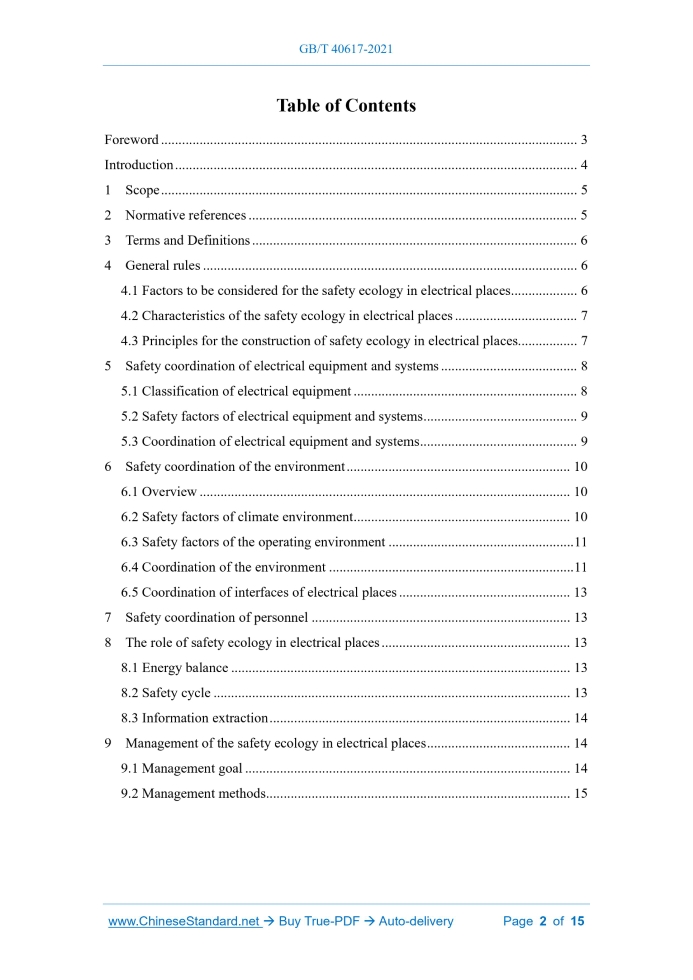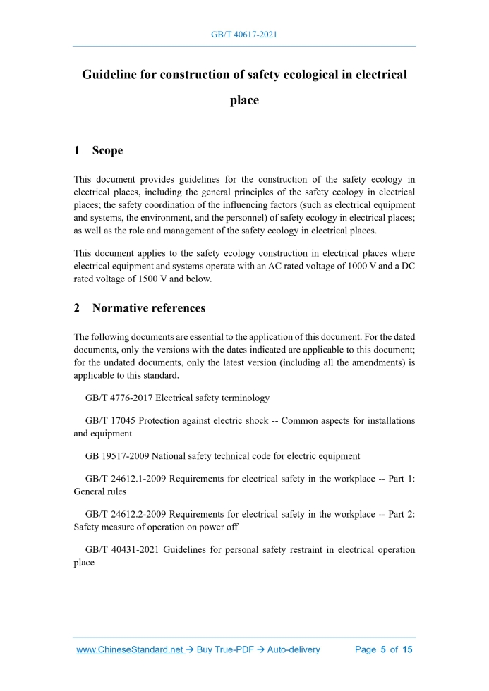 Similar standardsGB/T 40617-2021: Guidelines for construction of safety ecological in electrical place---This is an excerpt. Full copy of true-PDF in English version (including equations, symbols, images, flow-chart, tables, and figures etc.), auto-downloaded/delivered in 9 seconds, can be purchased online: https://www.ChineseStandard.net/PDF.aspx/GBT40617-2021NATIONAL STANDARD OF THE PEOPLE’S REPUBLIC OF CHINA ICS 29.020 CCS K 09 Guideline for construction of safety ecological in electrical place ISSUED ON: OCTOBER 11, 2021 IMPLEMENTED ON: MAY 1, 2022 Issued by: State Administration for Market Regulation; Standardization Administration of PRC. Table of ContentsForeword ... 3 Introduction ... 4 1 Scope ... 5 2 Normative references ... 5 3 Terms and Definitions ... 6 4 General rules ... 6 4.1 Factors to be considered for the safety ecology in electrical places ... 6 4.2 Characteristics of the safety ecology in electrical places ... 7 4.3 Principles for the construction of safety ecology in electrical places... 7 5 Safety coordination of electrical equipment and systems ... 8 5.1 Classification of electrical equipment ... 8 5.2 Safety factors of electrical equipment and systems ... 9 5.3 Coordination of electrical equipment and systems ... 9 6 Safety coordination of the environment ... 10 6.1 Overview ... 10 6.2 Safety factors of climate environment ... 10 6.3 Safety factors of the operating environment ... 11 6.4 Coordination of the environment ... 11 6.5 Coordination of interfaces of electrical places ... 13 7 Safety coordination of personnel ... 13 8 The role of safety ecology in electrical places ... 13 8.1 Energy balance ... 13 8.2 Safety cycle ... 13 8.3 Information extraction ... 14 9 Management of the safety ecology in electrical places ... 14 9.1 Management goal ... 14 9.2 Management methods ... 15 Guideline for construction of safety ecological in electrical place1 ScopeThis document provides guidelines for the construction of the safety ecology in electrical places, including the general principles of the safety ecology in electrical places; the safety coordination of the influencing factors (such as electrical equipment and systems, the environment, and the personnel) of safety ecology in electrical places; as well as the role and management of the safety ecology in electrical places. This document applies to the safety ecology construction in electrical places where electrical equipment and systems operate with an AC rated voltage of 1000 V and a DC rated voltage of 1500 V and below.2 Normative referencesThe following documents are essential to the application of this document. For the dated documents, only the versions with the dates indicated are applicable to this document; for the undated documents, only the latest version (including all the amendments) is applicable to this standard. GB/T 4776-2017 Electrical safety terminology GB/T 17045 Protection against electric shock -- Common aspects for installations and equipment GB 19517-2009 National safety technical code for electric equipment GB/T 24612.1-2009 Requirements for electrical safety in the workplace -- Part 1: General rules GB/T 24612.2-2009 Requirements for electrical safety in the workplace -- Part 2: Safety measure of operation on power off GB/T 40431-2021 Guidelines for personal safety restraint in electrical operation place3 Terms and DefinitionsThe terms and definitions defined in GB/T 4776-2017, GB 19517-2009 and the following apply to this document. 3.1 Electrical place A closed and/or open place where the electrical equipment and systems operate and only professionals or persons with electrical training can enter. 3.2 Safety ecological in electrical place An electrical place where multiple electrical equipment and systems are installed (or connected), the electrical equipment (systems), the environment, and personnel form a unified whole, and within a certain period, its functions maintain safe and reliable as expected in a dynamic balance state. 3.3 Interface of electrical place A specific area in which two different types (for example, different functions or different safety level requirements) of electrical places are adjacent.4 General rules4.1 Factors to be considered for the safety ecology in electrical places 4.1.1 The safety ecology in electrical places is affected by the following factors: --- Safety of electrical equipment and systems; the content specified in GB 19517- 2009 is applicable to all electrical equipment and systems with the voltage range of AC voltage 1000 V and below, as well as DC voltage 1500 V and below; --- Environmental safety in electrical places; --- Safety of personnel in electrical places; --- Interaction between electrical equipment (systems), environment, and personnel. 4.1.2 The following should be considered for the safety ecology in electrical places: --- The influencing factors in 4.1.1; --- The functional objectives of the safety ecology, which are determined based on the functions of electrical equipment and systems; --- The electrical safety objectives of the safety ecology for ensuring personal and5 Safety coordination of electrical equipment and systems5.1 Classification of electrical equipment Usually, electrical equipment is classified according to the measures of protection against electric shock. According to the provisions of GB/T 17045, electrical equipment can be divided into Class-0 electrical equipment, Class-I electrical equipment, Class-II electrical equipment, and Class-III electrical equipment. --- Class-0 electrical equipment: The basic insulation is used as the basic protective measure, and there are no fault protection measures; --- Class-I electrical equipment: The basic insulation is used as the basic protective measure, and the protective bonding is used as a fault protection measure; --- Class-II electrical equipment: The basic insulation is used as the basic protective measure, and the supplementary insulation is used as a fault protection 