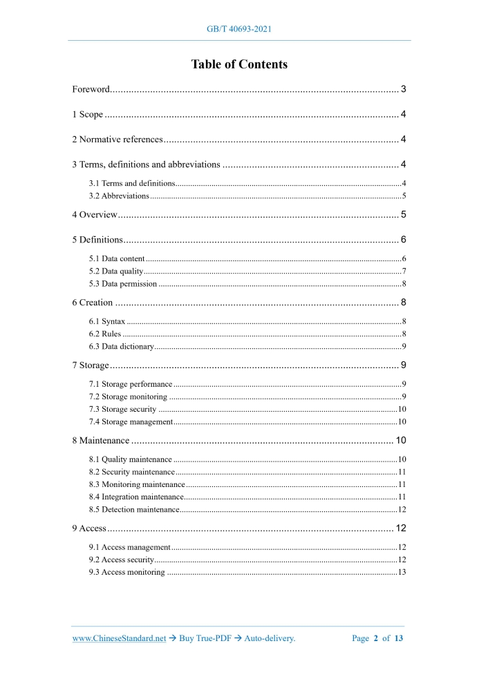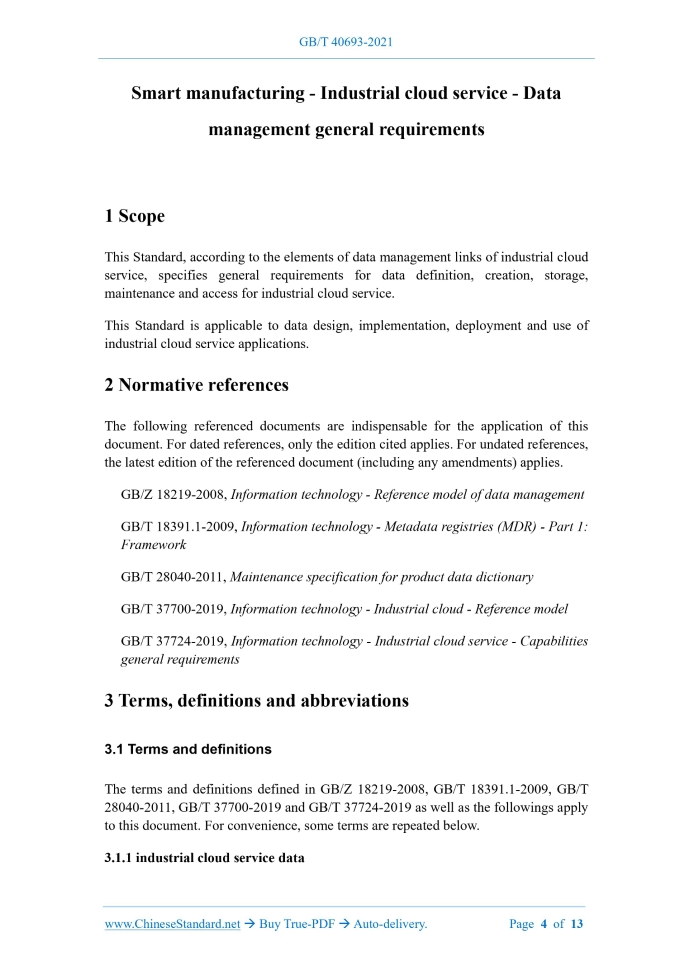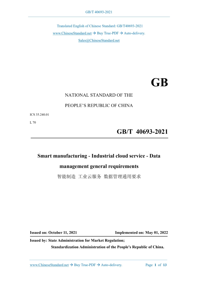 Similar standardsGB/T 40693-2021: Smart manufacturing - Industrial cloud service - Data management general requirements---This is an excerpt. Full copy of true-PDF in English version (including equations, symbols, images, flow-chart, tables, and figures etc.), auto-downloaded/delivered in 9 seconds, can be purchased online: https://www.ChineseStandard.net/PDF.aspx/GBT40693-2021 NATIONAL STANDARD OF THE PEOPLE’S REPUBLIC OF CHINA ICS 35.240.01 L 70 Smart manufacturing - Industrial cloud service - Data management general requirements ISSUED ON: OCTOBER 11, 2021 IMPLEMENTED ON: MAY 01, 2022 Issued by: State Administration for Market Regulation; Standardization Administration of the People's Republic of China. Table of ContentsForeword ... 3 1 Scope ... 4 2 Normative references ... 4 3 Terms, definitions and abbreviations ... 4 3.1 Terms and definitions ... 4 3.2 Abbreviations ... 5 4 Overview ... 5 5 Definitions ... 6 5.1 Data content ... 6 5.2 Data quality ... 7 5.3 Data permission ... 8 6 Creation ... 8 6.1 Syntax ... 8 6.2 Rules ... 8 6.3 Data dictionary ... 9 7 Storage ... 9 7.1 Storage performance ... 9 7.2 Storage monitoring ... 9 7.3 Storage security ... 10 7.4 Storage management ... 10 8 Maintenance ... 10 8.1 Quality maintenance ... 10 8.2 Security maintenance ... 11 8.3 Monitoring maintenance ... 11 8.4 Integration maintenance ... 11 8.5 Detection maintenance ... 12 9 Access ... 12 9.1 Access management ... 12 9.2 Access security ... 12 9.3 Access monitoring ... 13 Smart manufacturing - Industrial cloud service - Data management general requirements1 ScopeThis Standard, according to the elements of data management links of industrial cloud service, specifies general requirements for data definition, creation, storage, maintenance and access for industrial cloud service. This Standard is applicable to data design, implementation, deployment and use of industrial cloud service applications.2 Normative referencesThe following referenced documents are indispensable for the application of this document. For dated references, only the edition cited applies. For undated references, the latest edition of the referenced document (including any amendments) applies. GB/Z 18219-2008, Information technology - Reference model of data management GB/T 18391.1-2009, Information technology - Metadata registries (MDR) - Part 1: Framework GB/T 28040-2011, Maintenance specification for product data dictionary GB/T 37700-2019, Information technology - Industrial cloud - Reference model GB/T 37724-2019, Information technology - Industrial cloud service - Capabilities general requirements3 Terms, definitions and abbreviations3.1 Terms and definitions The terms and definitions defined in GB/Z 18219-2008, GB/T 18391.1-2009, GB/T 28040-2011, GB/T 37700-2019 and GB/T 37724-2019 as well as the followings apply to this document. For convenience, some terms are repeated below. 3.1.1 industrial cloud service data the collection of data generated in the process of planning, construction, operation, and evaluation of industrial cloud services and managed in the industrial cloud platform 3.1.2 data management the activities of defining, creating, storing, maintaining, and accessing data in one or more industrial cloud systems 3.1.3 metadata the data that defines and describes other data [GB/T 18391.1-2009, definition 3.2.16] 3.1.4 data dictionary the table that contains a series of data entries [GB/T 28040-2011, definition 3.1] 3.1.5 heterogeneous data the data with different data formats, storage methods, and access control policies NOTE 1: Heterogeneous data may be distributed across multiple autonomous domains in a heterogeneous environment. NOTE 2: Heterogeneous data may differ greatly in data models, operating languages, and data semantics. 3.2 Abbreviations The following abbreviations apply to this document. ETL: Extract Transform Load OLAP: Online Analytical Processing PB: Petabytes4 OverviewData management of industrial cloud services includes the definition, creation, storage, maintenance and access of data. In these links, the industrial cloud service data is managed to ensure the integrity, consistency, security, reliability and ease of use of the industrial cloud service data. workstations, equipment groups, and equipment; c) Data classification shall be provided, such as data classification of industrial cloud service providers, industrial cloud service collaborators, and industrial cloud service customers, as well as data classification schemes in terms of data importance, security, priority; d) It is advisable to provide personalized customization functions for data model, data classification, and data definition, such as data tables, fields, attributes; e) Heterogeneous data descriptions shall be provided, such as data descriptions in heterogeneous environments such as computer architecture, basic operating systems, database systems, and programming languages; f) Graphical definition tools shall be provided, such as import and export of data models. 5.2 Data quality When industrial cloud service providers provide industrial cloud service data definition services, the data quality requirements include: a) Definitions and rules of data quality and accuracy indicators shall be provided, such as definitions of error range, expectation, variance as well as rules of data collection frequency, collection path; b) The complete definition of data attributes, such as data characteristics, characteristic attributes and characteristic relationships, shall be provided, such as original records and files, which are retained in the original form, and the entire activity of data generation can be reproduced according to the original data; c) A consistent definition of the logical relationship of data in time and space shall be provided, for example, the sequence of events is recorded in strict accordance with the date and time of occurrence; d) The definition of timeliness of data from generation to use shall be 
