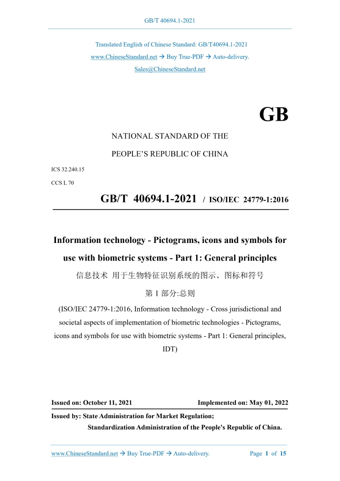 GB/T 40694.1-2021: Information technology - Pictograms, icons and symbols for use with biometric systems - Part 1: General principles Delivery: 9 seconds. True-PDF full-copy in English & invoice will be downloaded + auto-delivered via email. See step-by-step procedure Status: Valid