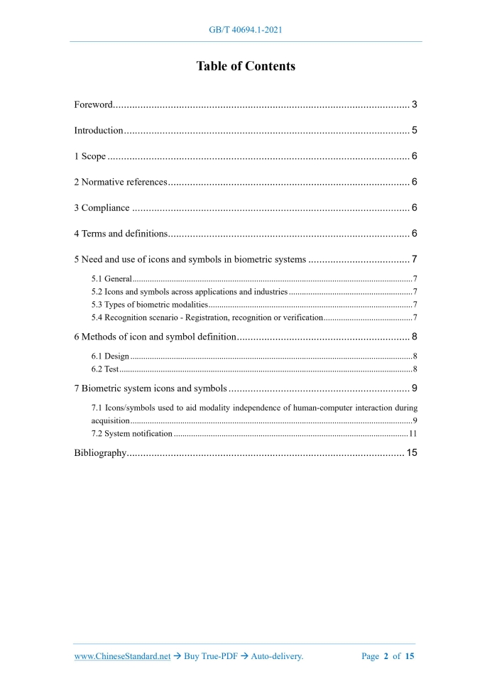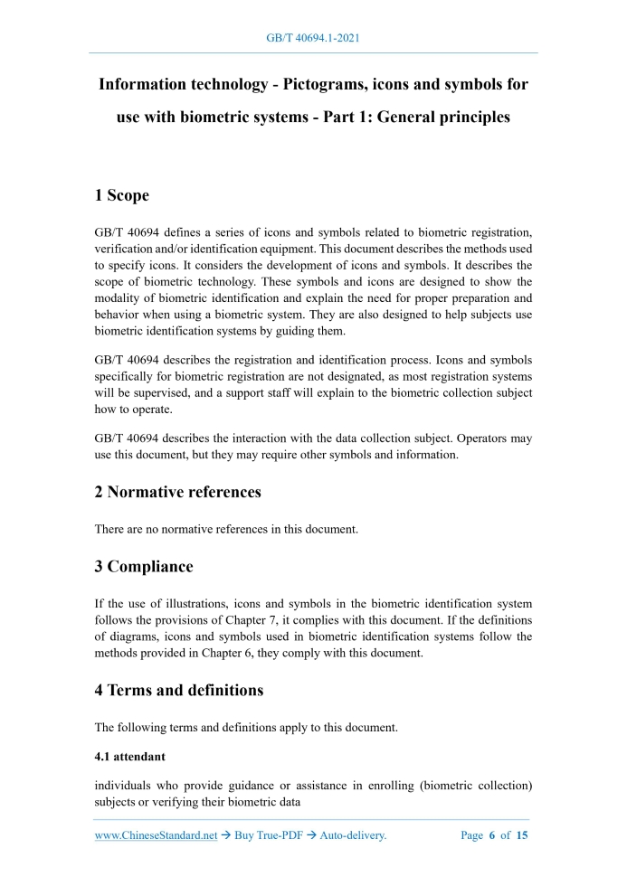 Similar standardsGB/T 40694.1-2021: Information technology - Pictograms, icons and symbols for use with biometric systems - Part 1: General principles---This is an excerpt. Full copy of true-PDF in English version (including equations, symbols, images, flow-chart, tables, and figures etc.), auto-downloaded/delivered in 9 seconds, can be purchased online: https://www.ChineseStandard.net/PDF.aspx/GBT40694.1-2021 NATIONAL STANDARD OF THE PEOPLE’S REPUBLIC OF CHINA ICS 32.240.15 CCS L 70 GB/T 40694.1-2021 / ISO/IEC 24779-1:2016 Information technology - Pictograms, icons and symbols for use with biometric systems - Part 1: General principles (ISO/IEC 24779-1:2016, Information technology - Cross jurisdictional and societal aspects of implementation of biometric technologies - Pictograms, icons and symbols for use with biometric systems - Part 1: General principles, IDT) ISSUED ON: OCTOBER 11, 2021 IMPLEMENTED ON: MAY 01, 2022 Issued by: State Administration for Market Regulation; Standardization Administration of the People's Republic of China. Table of ContentsForeword ... 3 Introduction ... 5 1 Scope ... 6 2 Normative references ... 6 3 Compliance ... 6 4 Terms and definitions... 6 5 Need and use of icons and symbols in biometric systems ... 7 5.1 General ... 7 5.2 Icons and symbols across applications and industries ... 7 5.3 Types of biometric modalities ... 7 5.4 Recognition scenario - Registration, recognition or verification ... 7 6 Methods of icon and symbol definition ... 8 6.1 Design ... 8 6.2 Test ... 8 7 Biometric system icons and symbols ... 9 7.1 Icons/symbols used to aid modality independence of human-computer interaction during acquisition ... 9 7.2 System notification ... 11 Bibliography... 15 Information technology - Pictograms, icons and symbols for use with biometric systems - Part 1: General principles1 ScopeGB/T 40694 defines a series of icons and symbols related to biometric registration, verification and/or identification equipment. This document describes the methods used to specify icons. It considers the development of icons and symbols. It describes the scope of biometric technology. These symbols and icons are designed to show the modality of biometric identification and explain the need for proper preparation and behavior when using a biometric system. They are also designed to help subjects use biometric identification systems by guiding them. GB/T 40694 describes the registration and identification process. Icons and symbols specifically for biometric registration are not designated, as most registration systems will be supervised, and a support staff will explain to the biometric collection subject how to operate. GB/T 40694 describes the interaction with the data collection subject. Operators may use this document, but they may require other symbols and information.2 Normative referencesThere are no normative references in this document.3 ComplianceIf the use of illustrations, icons and symbols in the biometric identification system follows the provisions of Chapter 7, it complies with this document. If the definitions of diagrams, icons and symbols used in biometric identification systems follow the methods provided in Chapter 6, they comply with this document.4 Terms and definitionsThe following terms and definitions apply to this document. 4.1 attendant individuals who provide guidance or assistance in enrolling (biometric collection) subjects or verifying their biometric data modality, icons and symbols will be defined in the various parts of GB/T 40694. Each part describes the specification of how to use or display icons and symbols. Multiple symbols and icons can be used if there are multiple modalities. Compound concepts such as retrying for help after a failure can use a series of combined icons and symbols to guide the user. If icons and symbols are common for biometric registration and identification, they shall be used in both cases. Applicants and operators shall be familiarized with common symbols for various biometric modalities through applicant registration. NOTE 1: Other features, such as an illuminated sign indicating that the system is running or an internally illuminated fingerprint reader, are outside the scope of this document. The use of the icons contained in this document does not preclude the use of other illuminated cues, so as to assist visually impaired persons to place their fingers in the reader. NOTE 2: It is not excluded that other icons/symbols may be applied in biometric collection scenarios where the subject is moving.6 Methods of icon and symbol definition6.1 Design The defined family of icons and symbols shall achieve a high degree of association between meaning and symbols, as well as visual recognizability in a variety of situations. The development of symbols and icons for the different parts of GB/T 40694 is in line with ISO/IEC 80416 (all parts) through liaison between ISO/IEC committees and IEC/SC 3C. 6.2 Test The symbols and icons defined in different parts of GB/T 40694 shall be targeted to subjects from different genders and ages, cultures, races, religions, educational backgrounds and persons with disabilities who have been under operating conditions. They have been tested according to ISO 9186 (all parts). Different test methods can be used and shall be described. For example, Annex A of ISO/IEC 24779-4:2017 describes the National Institute of Standards and Technology (NIST) test method used. The testing methodology requires knowledge of real-world situations and conditions, so cultural sensitivities, including hands, faces, eyes, are carefully considered. Scenario and/or run tests need to be supplemented by tests in one or more real-world environments. For example, the test allows for multiple types of use, like, while waiting in line to use the terminal and while the terminal is in use. ......Source: Above contents are excerpted from the full-copy PDF -- translated/reviewed by: www.ChineseStandard.net / Wayn
