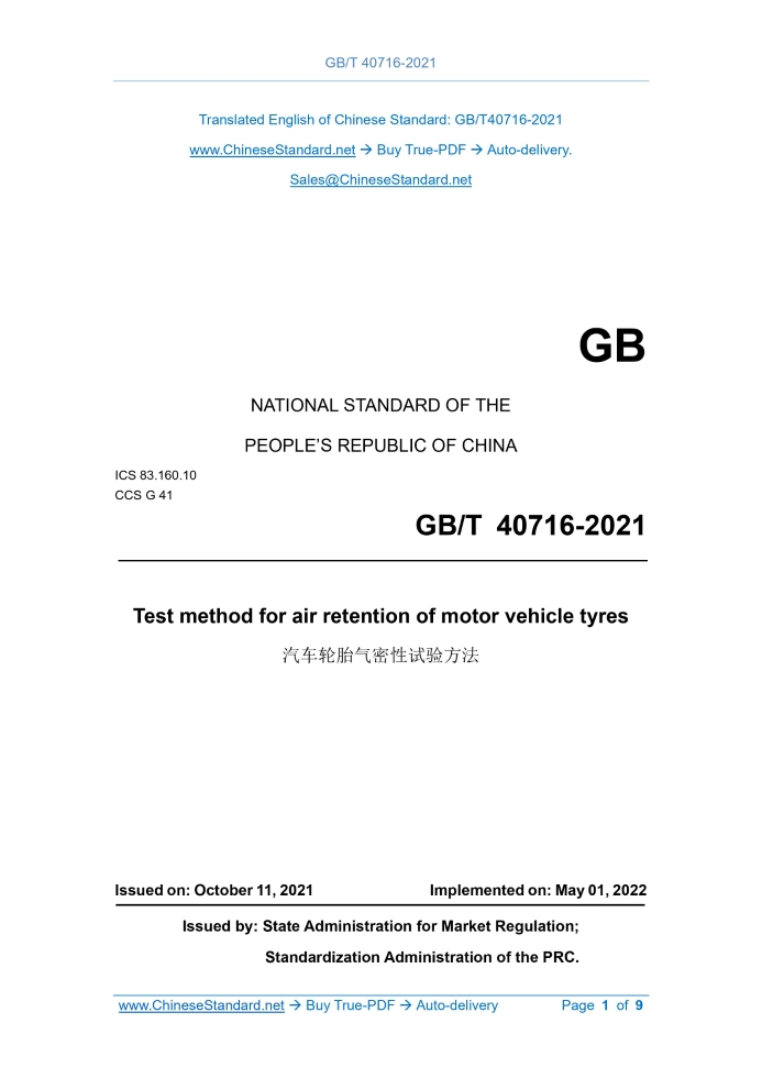 GB/T 40716-2021: Test method for air retention of motor vehicle tyres Delivery: 9 seconds. True-PDF full-copy in English & invoice will be downloaded + auto-delivered via email. See step-by-step procedure Status: Valid