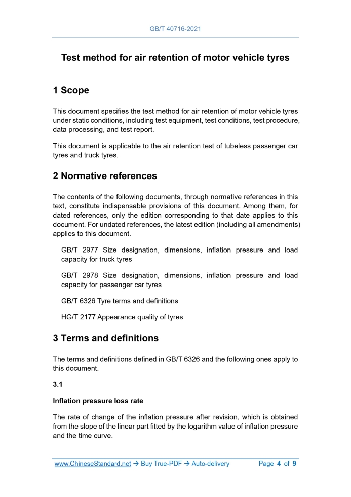 Similar standardsGB/T 40716-2021: Test method for air retention of motor vehicle tyres---This is an excerpt. Full copy of true-PDF in English version (including equations, symbols, images, flow-chart, tables, and figures etc.), auto-downloaded/delivered in 9 seconds, can be purchased online: https://www.ChineseStandard.net/PDF.aspx/GBT40716-2021GB NATIONAL STANDARD OF THE PEOPLE’S REPUBLIC OF CHINA ICS 83.160.10 CCS G 41 Test method for air retention of motor vehicle tyres ISSUED ON: OCTOBER 11, 2021 IMPLEMENTED ON: MAY 01, 2022 Issued by: State Administration for Market Regulation; Standardization Administration of the PRC. Table of ContentsForeword ... 3 1 Scope ... 4 2 Normative references ... 4 3 Terms and definitions ... 4 4 Test equipment ... 5 5 Test conditions ... 5 6 Test procedure ... 6 7 Data processing ... 7 8 Test report ... 9 Test method for air retention of motor vehicle tyres1 ScopeThis document specifies the test method for air retention of motor vehicle tyres under static conditions, including test equipment, test conditions, test procedure, data processing, and test report. This document is applicable to the air retention test of tubeless passenger car tyres and truck tyres.2 Normative referencesThe contents of the following documents, through normative references in this text, constitute indispensable provisions of this document. Among them, for dated references, only the edition corresponding to that date applies to this document. For undated references, the latest edition (including all amendments) applies to this document. GB/T 2977 Size designation, dimensions, inflation pressure and load capacity for truck tyres GB/T 2978 Size designation, dimensions, inflation pressure and load capacity for passenger car tyres GB/T 6326 Tyre terms and definitions HG/T 2177 Appearance quality of tyres3 Terms and definitionsThe terms and definitions defined in GB/T 6326 and the following ones apply to this document. 3.1 Inflation pressure loss rate The rate of change of the inflation pressure after revision, which is obtained from the slope of the linear part fitted by the logarithm value of inflation pressure and the time curve. and the rim (both sides), to ensure that there is no air leakage. 6.1.3 Connect the atmospheric pressure sensor and adapter to the valve stem. Check the tyre-rim assembly and the adapter (including the connection part with the sensor), to ensure that the accessories are not leaking. 6.1.4 After checking according to 6.1.2 and 6.1.3, park the tyre-rim assembly at the test temperature for 48 h (the temporarily-used spare tyre shall be parked for more than 48 h). If the inflation pressure drops more than 3 kPa during the period, follow 6.1.2 again. If necessary, reassemble the tyre and rim. 6.2 Test steps 6.2.1 Put the two test tyres prepared in accordance with 6.1 in a temperature- controllable environment; adjust the atmospheric pressure to the test inflation pressure; start the test; and ensure free air circulation. During the test, the tyre shall not be moved to avoid pressure fluctuations. 6.2.2 Continue to check and record the inflation pressure, ambient temperature, and atmospheric pressure every day. If the revised slope value changes abnormally, check again for leaks. 6.2.3 After 14 days of the test, if the difference between the inflation pressures of the two test tyres does not exceed 6 kPa, the test continues. Otherwise, recheck according to 6.1.2 and restart the test. 6.2.4 Continue the test according to the standard until the end of the test period. During the test, continue to monitor and evaluate the data results.7 Data processing7.1 According to formula (1), obtain the revised inflation pressure. Where: p - Revised inflation pressure, in kilopascals (kPa); p1 - Test inflation pressure, in kilopascals (kPa); B1 - Atmospheric pressure during the test, in kilopascals (kPa); B2 - Reference atmospheric pressure 101.3 kPa; T1 - Test temperature, in Kelvin (K); ......Source: Above contents are excerpted from the full-copy PDF -- translated/reviewed by: www.ChineseStandard.net / Wayne Zheng et al. Tips & Frequently Asked Questions:Question 1: How long will the true-PDF of English version of GB/T 40716-2021 be delivered?Answer: The full copy PDF of English version of GB/T 40716-2021 can be downloaded in 9 seconds, and it will also be emailed to you in 9 seconds (double mechanisms to ensure the delivery reliably), with PDF-invoice.Question 2: Can I share the purchased PDF of GB/T 40716-2021_English with my colleagues?Answer: Yes. The purchased PDF of GB/T 40716-2021_English will be deemed to be sold to your employer/organization who actually paid for it, including your colleagues and your employer's intranet.Question 3: Does the price include tax/VAT?Answer: Yes. Our tax invoice, downloaded/delivered in 9 seconds, includes all tax/VAT and complies with 100+ countries' tax regulations (tax exempted in 100+ countries) -- See Avoidance of Double Taxation Agreements (DTAs): List of DTAs signed between Singapore and 100+ countriesQuestion 4: Do you accept my currency other than USD?Answer: Yes. www.ChineseStandard.us -- GB/T 40716-2021 -- Click this link and select your country/currency to pay, the exact amount in your currency will be printed on the invoice. Full PDF will also be downloaded/emailed in 9 seconds.How to buy and download a true PDF of English version of GB/T 40716-2021?A step-by-step guide to download PDF of GB/T 40716-2021_EnglishStep 1: Visit website https://www.ChineseStandard.net (Pay in USD), or https://www.ChineseStandard.us (Pay in any currencies such as Euro, KRW, JPY, AUD).Step 2: Search keyword "GB/T 40716-2021". Step 3: Click "Add to Cart". If multiple PDFs are required, repeat steps 2 and 3 to add up to 12 PDFs to cart. Step 4: Select payment option (Via payment agents Stripe or PayPal). Step 5: Customize Tax Invoice -- Fill up your email etc. Step 6: Click "Checkout". Step 7: Make payment by credit card, PayPal, Google Pay etc