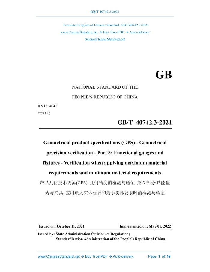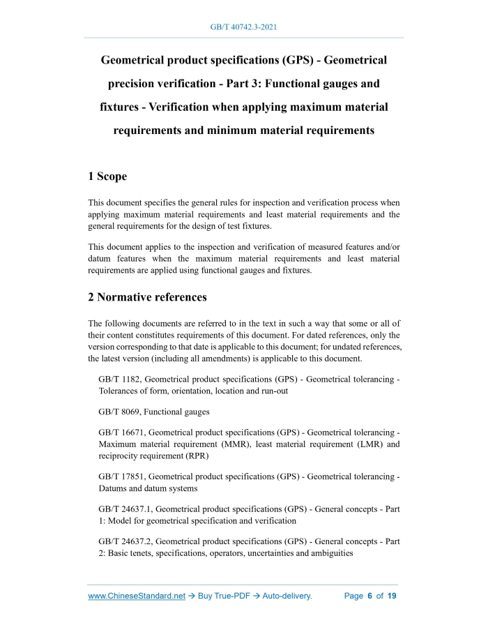 GB/T 40742.3-2021: Geometrical product specifications (GPS) - Geometrical precision verification - Part 3: Functional gauges and fixtures - Verification when applying maximum material requirements and minimum material requirements Delivery: 9 seconds. True-PDF full-copy in English & invoice will be downloaded + auto-delivered via email. See step-by-step procedure Status: Valid
