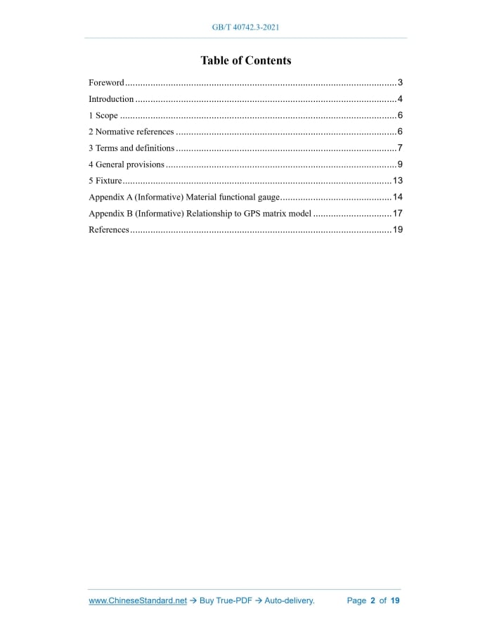 Similar standardsGB/T 40742.3-2021: Geometrical product specifications (GPS) - Geometrical precision verification - Part 3: Functional gauges and fixtures - Verification when applying maximum material requirements and minimum material requirements---This is an excerpt. Full copy of true-PDF in English version (including equations, symbols, images, flow-chart, tables, and figures etc.), auto-downloaded/delivered in 9 seconds, can be purchased online: https://www.ChineseStandard.net/PDF.aspx/GBT40742.3-2021 GB NATIONAL STANDARD OF THE PEOPLE’S REPUBLIC OF CHINA ICS 17.040.40 CCS J 42 Geometrical product specifications (GPS) - Geometrical precision verification - Part 3: Functional gauges and fixtures - Verification when applying maximum material requirements and minimum material requirements ISSUED ON: OCTOBER 11, 2021 IMPLEMENTED ON: MAY 01, 2022 Issued by: State Administration for Market Regulation; Standardization Administration of the People’s Republic of China. Table of ContentsForeword ... 3 Introduction ... 4 1 Scope ... 6 2 Normative references ... 6 3 Terms and definitions ... 7 4 General provisions ... 9 5 Fixture ... 13 Appendix A (Informative) Material functional gauge ... 14 Appendix B (Informative) Relationship to GPS matrix model ... 17 References ... 19 Geometrical product specifications (GPS) - Geometrical precision verification - Part 3: Functional gauges and fixtures - Verification when applying maximum material requirements and minimum material requirements1 ScopeThis document specifies the general rules for inspection and verification process when applying maximum material requirements and least material requirements and the general requirements for the design of test fixtures. This document applies to the inspection and verification of measured features and/or datum features when the maximum material requirements and least material requirements are applied using functional gauges and fixtures.2 Normative referencesThe following documents are referred to in the text in such a way that some or all of their content constitutes requirements of this document. For dated references, only the version corresponding to that date is applicable to this document; for undated references, the latest version (including all amendments) is applicable to this document. GB/T 1182, Geometrical product specifications (GPS) - Geometrical tolerancing - Tolerances of form, orientation, location and run-out GB/T 8069, Functional gauges GB/T 16671, Geometrical product specifications (GPS) - Geometrical tolerancing - Maximum material requirement (MMR), least material requirement (LMR) and reciprocity requirement (RPR) GB/T 17851, Geometrical product specifications (GPS) - Geometrical tolerancing - Datums and datum systems GB/T 24637.1, Geometrical product specifications (GPS) - General concepts - Part 1: Model for geometrical specification and verification GB/T 24637.2, Geometrical product specifications (GPS) - General concepts - Part 2: Basic tenets, specifications, operators, uncertainties and ambiguities GB/T 38762.1, Geometrical product specifications (GPS) - Dimensional tolerancing - Part 1: Linear sizes3 Terms and definitionsTerms and definitions determined by GB/T 1182, GB/T 8069, GB/T 16671, GB/T 17851, GB/T 24637.1, GB/T 24637.2 and GB/T 38762.1, as well as the following, are applicable to this document. 3.1 feature of size Geometric feature with one or more substantive characteristics, only one of which can be used as a variable parameter, and the rest are part of the “single parameter family” and obey the single constraint attribute of this parameter. [Source: GB/T 16671-2018, 3.2, modified] 3.2 local size Along and/or around the direction of the feature of size, the size characteristics of the feature of size may have non-unique evaluation results. Note 1: For a given element, there are multiple local sizes. Note 2: The two-point size of two opposite planes can be called “two-point thickness” or “two-point width”. [Source: GB/T 38762.1-2020, 3.6] 3.3 external function size Direct global size of the associated integral feature obtained from the extracted integral feature using a fitting criterion with material external constraints. The associated integral feature is of the same form type as the feature of size (see 3.1) and is in external contact with the extracted integral feature. Note 1: See 3.7.1 of GB/T 38762.1-2020 for the definition of direct global size. Note 2: When performing the fitting operation on the extracted integral feature, the available fitting criteria include least squares, maximum inscribed, minimum circumscribed and minimax criteria, and the direct global size respectively include the least-squares size (see GB/T 38762.1-2020, 3.7.1.1), maximum functional gauge A full-scale general gauge that is used – when the maximum material requirement or the least material requirement is applied to the measured features and/or datum features – to determine whether their actual contours exceed the boundary (maximum material virtual boundary, maximum material boundary, least material virtual boundary or least material boundary). Note 1: Functional gauge can be divided into material functional gauge and virtual functional gauge according to the state of space existence. Material functional gauge is a physical functional gauge, and the virtual functional gauge is a digital functional gauge. Note 2: Material functional gauges are mainly used in occasions where the maximum material requirement is applied to verify the measured features and (or) datum features. Material functional gauges can have four structural types: integral type, combination type, insertion type and active type (See 3.1 of GB/T 8069). See Appendix A for examples of various types of material functional gauges. Note 3: The virtual functional gauge is a digital gauge designed according to the functional requirements and structural shape characteristics of the workpiece to be tested. It is vir